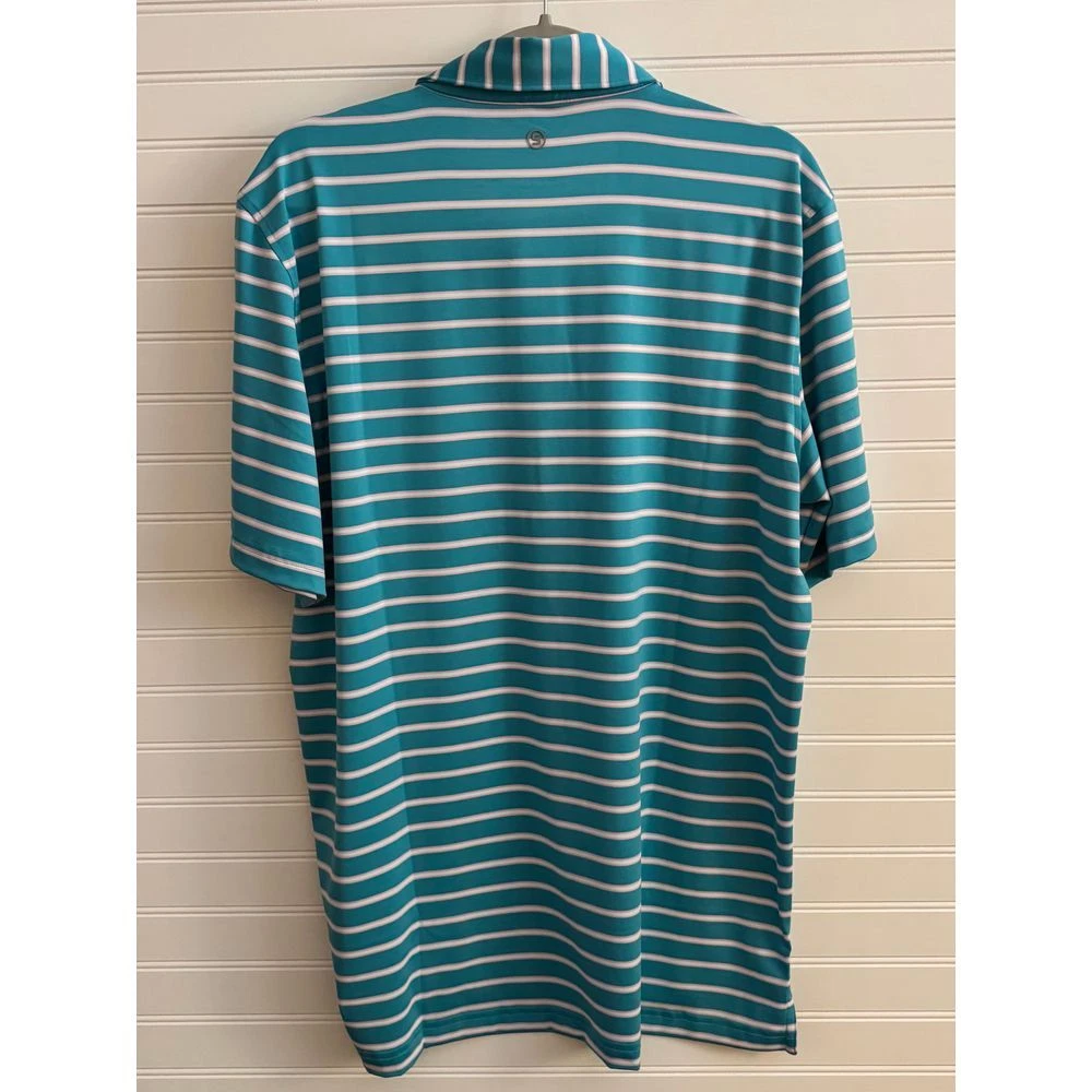 Elevate your golf game with this sophisticated striped polo shirt. The moisture-wicking performance fabric keeps you cool and comfortable on the course or during any active pursuit. Perfect for golf outings, casual business meetings, weekend brunches, or resort wear. The classic teal and white stripe pattern offers timeless style while maintaining athletic functionality. Color: Green Type: Polo Department: Men Performance/Activity: Golf Closure: Button Sleeve Length: Short Sleeve Features: Quick Dry, Moisture Wicking, Stretch, UV Protection, Easy Care Collar Style: Point Neckline: Collared Material: Performance Polyester Fit: Regular Pattern: Striped Style: Basic Keywords: striped polo, golf shirt, performance wear, athletic polo, moisture wicking, men polo, teal stripe, golf apparel, sport shirt, technical polo