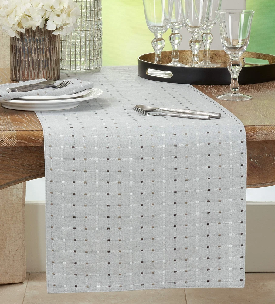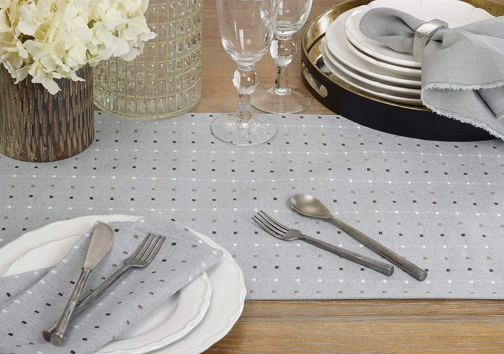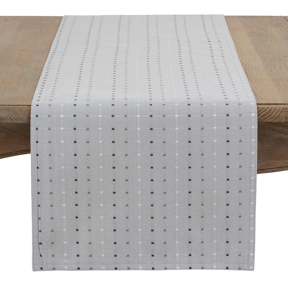 Clean and classic with a touch of texture, the stitched squares of this table runner make it ideal for anytime, any occasion. Size: 16"x54" Design is not reversible Runner has lining Cotton poly blend fabrics are loved for being low and easy care Materials: front: 56%cotton - 44%polyester, back: 100% polyester + Care: delicate cool machine wash separately, dry low, cool iron