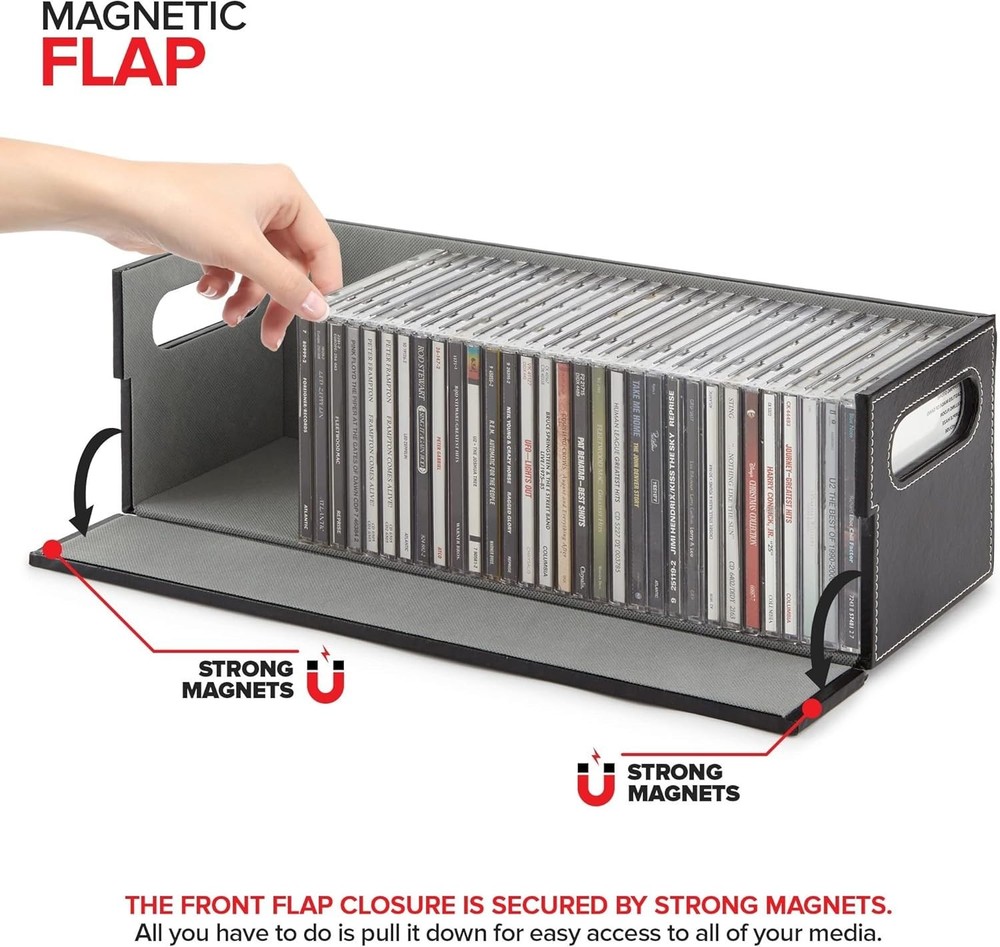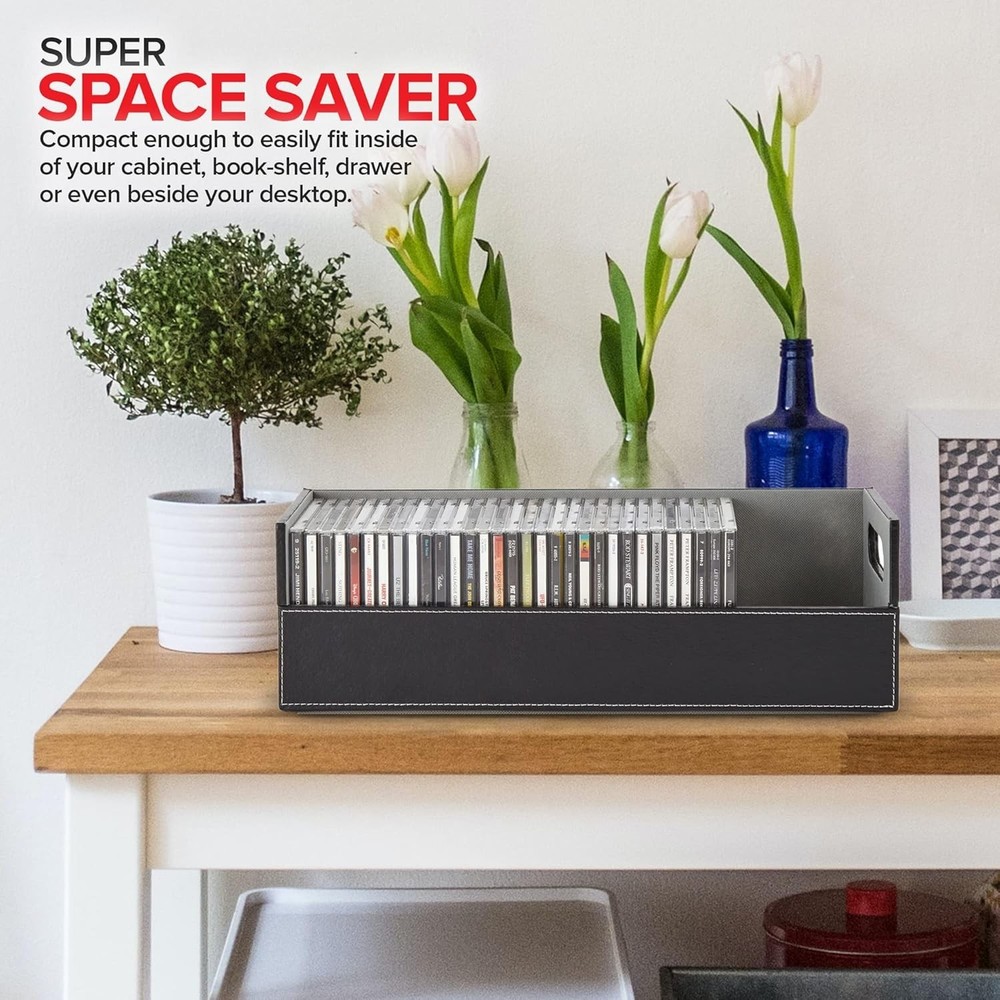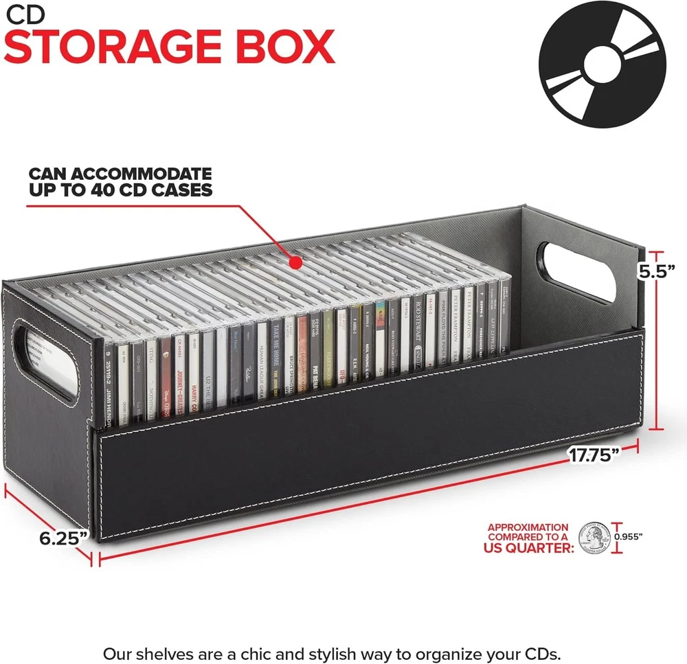 Stock Your Home CD Storage Box, Organizer Shelf for Movie Cases, DVDs, Cassette Tape Display Stand, Disc Holder Can Store Up to 40 CDs, Faux Leather (Black) Sophisticated CD Storage: Our shelves are a chic and stylish way to organize your CDs. Made with a smooth, faux leather exterior, and a corrugated felt interior, our organizers compliment any home décor. Magnetic Flap: The front flap closure is secured by strong magnets. All you have to do is pull it down for easy access to all of your music CDs, movie discs, audio cassettes, VHS tapes, and more! Interlocking Design: We've specially designed our containers to interlock with one another, allowing you to stack boxes. You can even mix and match with our DVD storage trays to complete your set. Reinforced Handles: Our holders come with sturdy handles so you can easily pick-up, carry, and move your organizers to your desired location. Super Space Saver: Our CD trays can accommodate up to 40 cases, while still being compact enough to easily fit inside of your cabinet, book-shelf, drawer, or even beside your desktop. Dimensions: 17.75” L x 6.25” W x 5.5” H.
