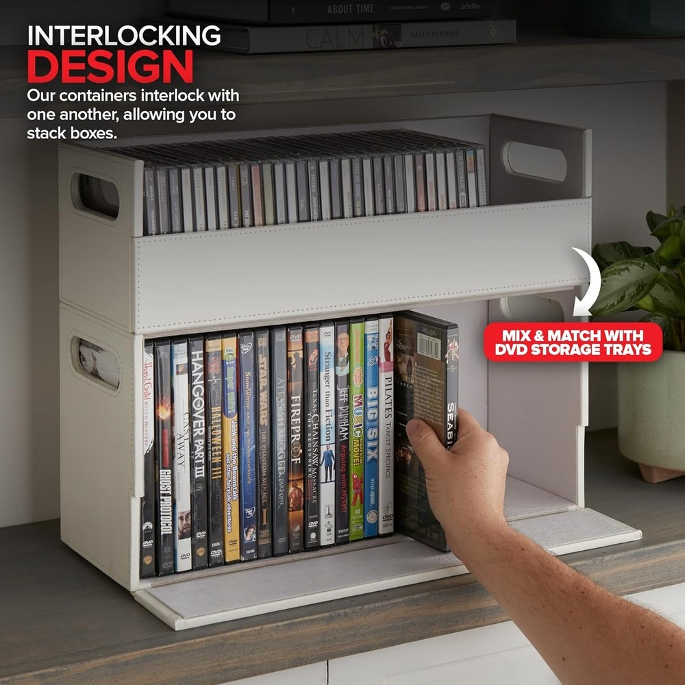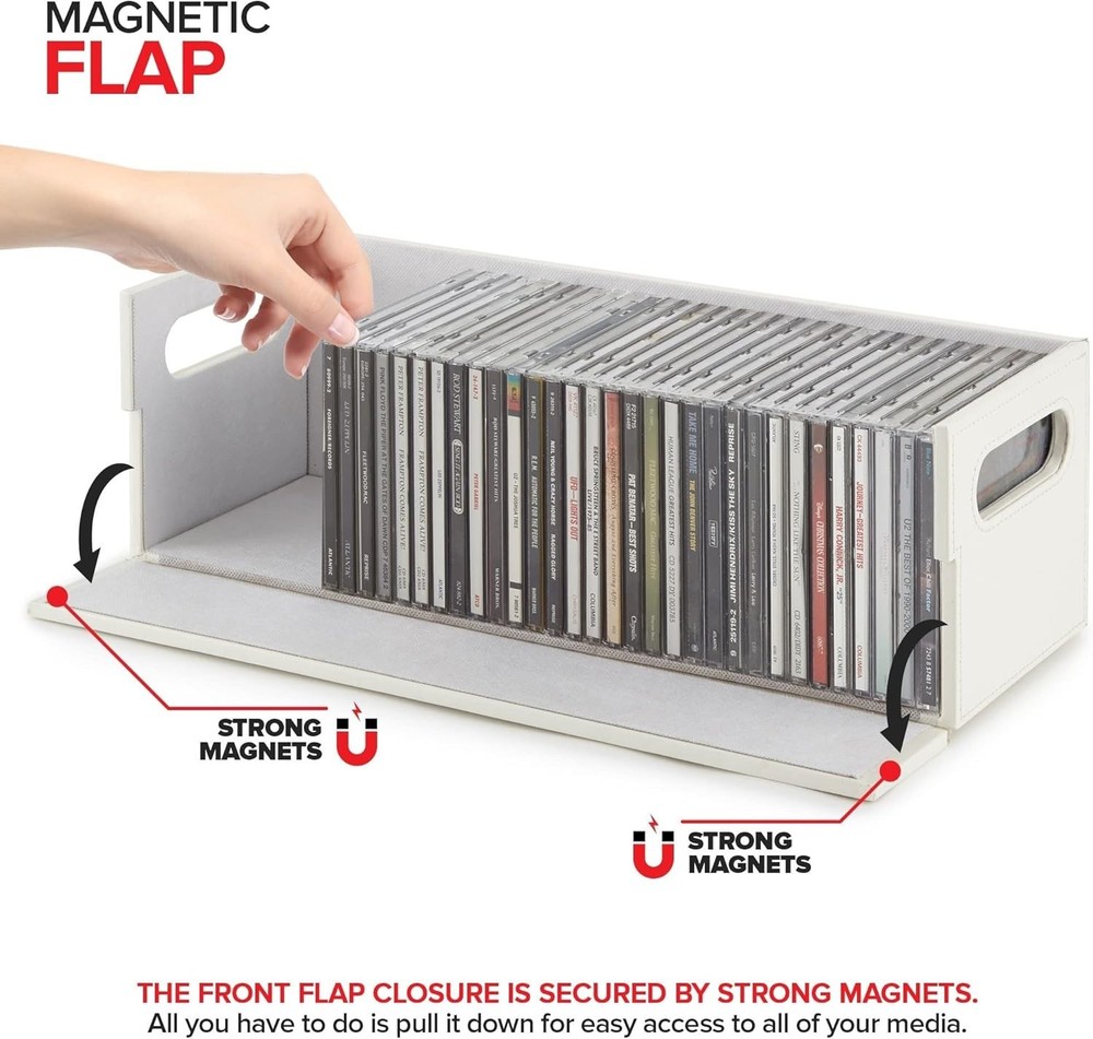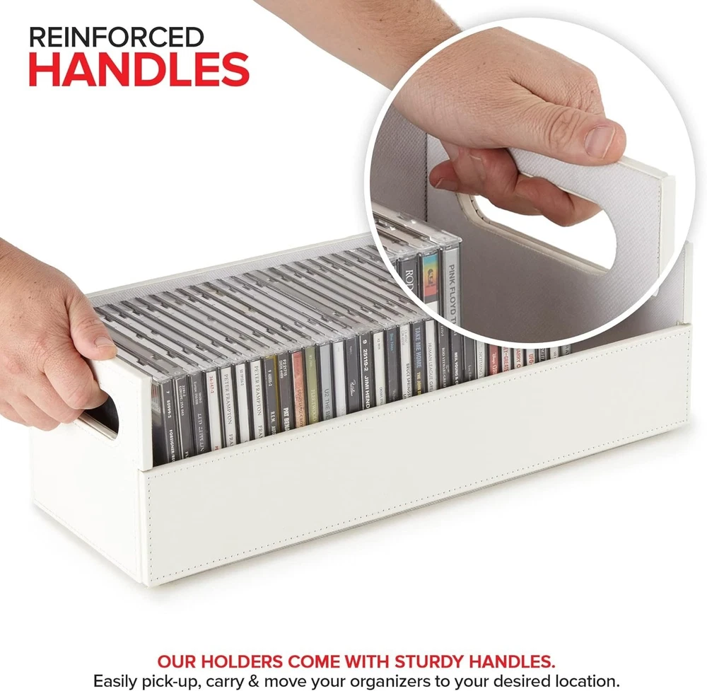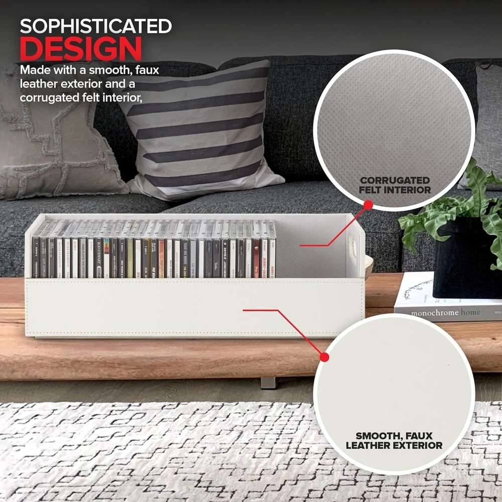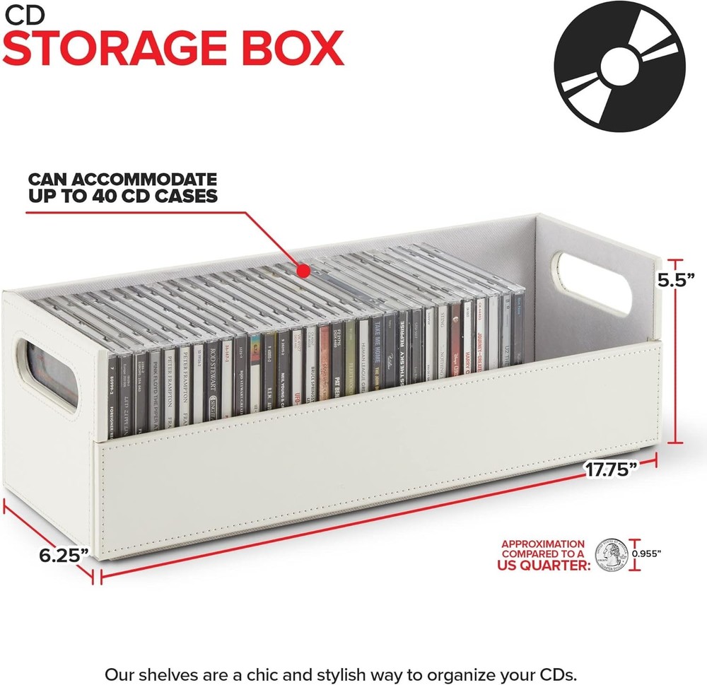 Stock Your Home CD Storage Box, Organizer Shelf for Movie Cases, DVDs, Cassette Tape Display Stand, Disc Holder Can Store Up to 40 CDs, Faux Leather (White) Sophisticated CD Storage: Our shelves are a chic and stylish way to organize your CDs. Made with a smooth, faux leather exterior, and a corrugated felt interior, our organizers compliment any home décor. Magnetic Flap: The front flap closure is secured by strong magnets. All you have to do is pull it down for easy access to all of your music CDs, movie discs, audio cassettes, VHS tapes, and more! Interlocking Design: We've specially designed our containers to interlock with one another, allowing you to stack boxes. You can even mix and match with our DVD storage trays to complete your set. Reinforced Handles: Our holders come with sturdy handles so you can easily pick-up, carry, and move your organizers to your desired location. Super Space Saver: Our CD trays can accommodate up to 40 cases, while still being compact enough to easily fit inside of your cabinet, book-shelf, drawer, or even beside your desktop. Dimensions: 17.75” L x 6.25” W x 5.5” H.
