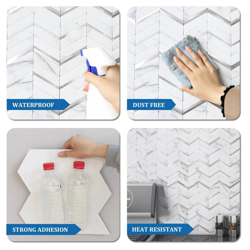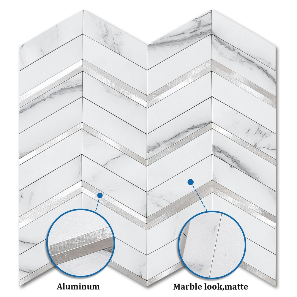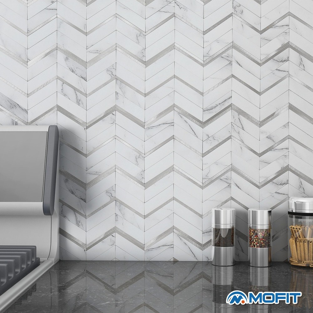 herringbone peel and stick tile Backsplash, Herringbone Peel and Stick Backsplash, stick on backsplash, peel and stick tile, marble backsplash peel and stick Marble Herringbone Peel and Stick Backsplash: Great quality,nice and thick with a realistic appearance.These mosaic tile stickers are individual PVC & metal pieces on a foam adhesive backer so they are more convincingly realistic than some of the other flimsy vinyl sheet kind. Make the perfect statement and adds the perfect touch to your wall.These tiles can be used as a visual detail on a furniture rehab too Durable Stick-on Tiles: Super sticky,once on the wall definitely not coming off easily.Can install on smooth ceramic tiles backsplash, smooth glass tiles backsplash, acrylic panel, pained gypsum,stainless metal, mirror glass,etc Waterproof & Heat Resistant Peel-and-Stick Tile: Widely used in kitchen island walls, bathroom backsplash, shower walls,laundry room, camper backsplash,bars,fireplace surrounding, and installed behind the stove Best Value Stick on Backsplash: Looks like real marble tile,looks elegant and expensive.It is lightweight and easy to install than real stone tile,No contractor required. Definitely worth your every penny Easy Do It Yourself: Just peel, interlock and stick. No grout and no mess, save your time and money on labor.Easy to cut with a utility knife or Heavy Duty Scissor.Can use one of the these tools to get a good clean edge when cutting:Heavy Duty Shears/Tin Snip/Jig Saw /Chop Saw