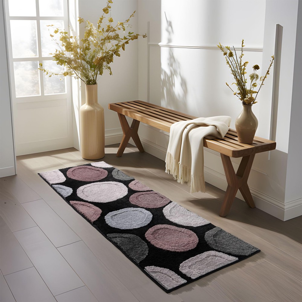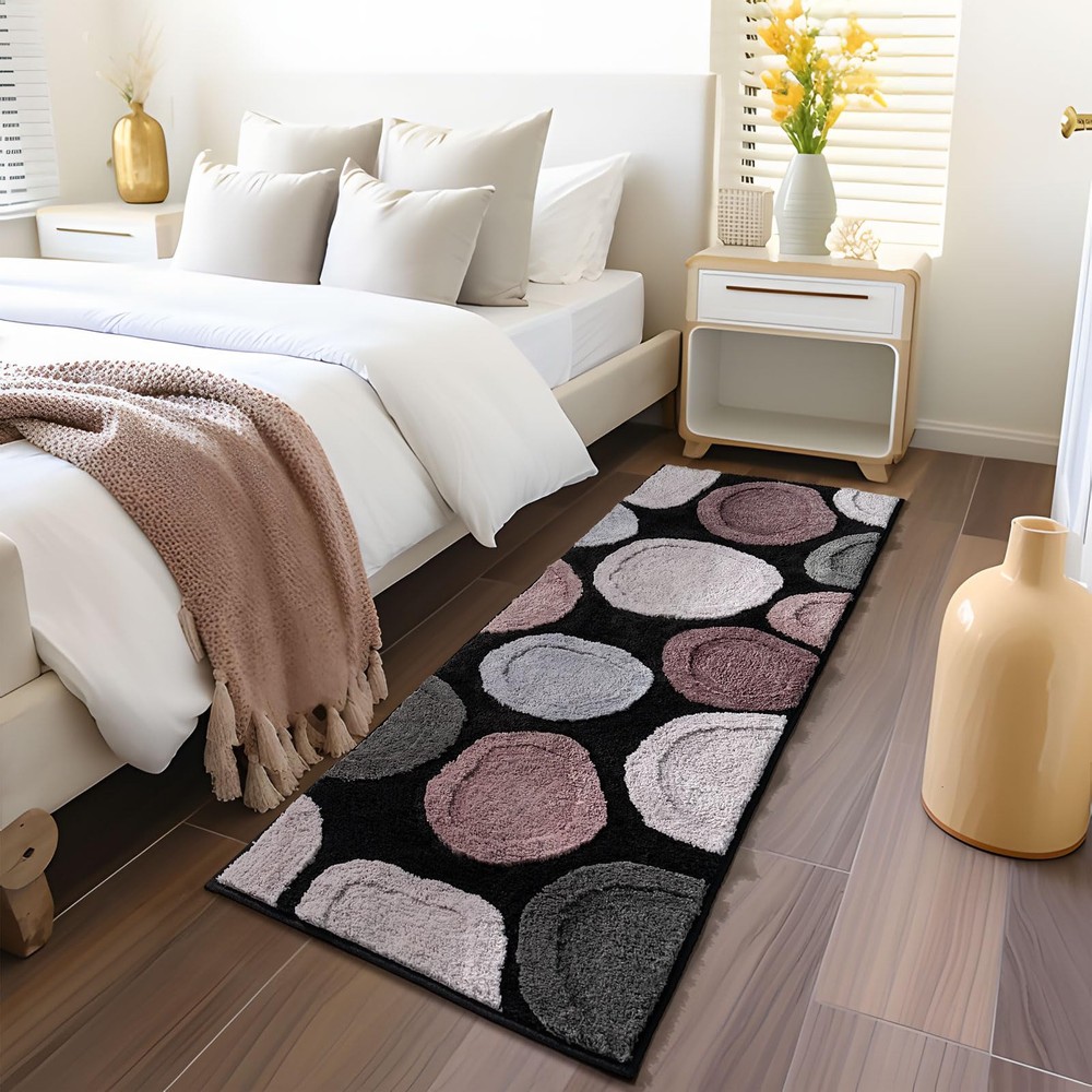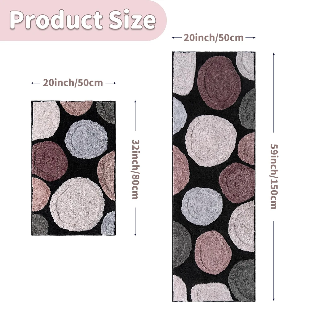 Stone Bathroom Runner:Size(20x60inch),Color(Black/Brown/Gray/Beige).When you step on it, your toes will sink into it,like stepping on a soft cloud.This Cobblestone Bathroom Runner rug is more thick and bushy, make the stone bathroom mat amazing soft and cozy like a comfortable quilt protector for your feet. Extra Absorbent: This stone shag rugs can soak up the water and keep your floor dry like a giant sponge.The thick and high fluffy absorbs water quickly and protect your floor from dripping water. Non Slip Backing: MUJOO long bathroom runner is constructed with Rubber backing which helps to prevent shifting and skidding. Water under the boho bathroom runner can cause it to slip. Please place neutral bathroom runner rug on dry smooth floor. Multi Purpose Use:Our stone bathroom rugs are widely used for bathroom, bedroom, kitchen room,entryway,living room or at any place in your home where you want support and warmth on your toes. Easy Care: Machine washable.Tumble dry on low setting and shake to restore fluff.Or Simply pick up and shake rug to freshen.