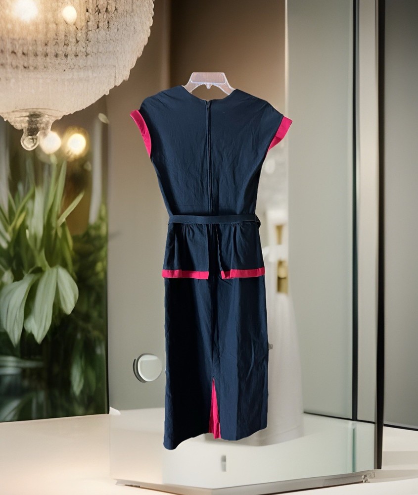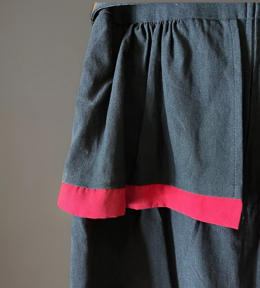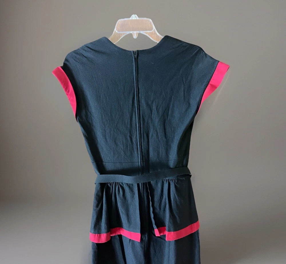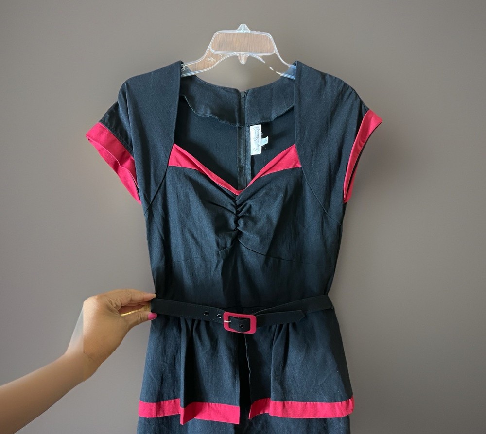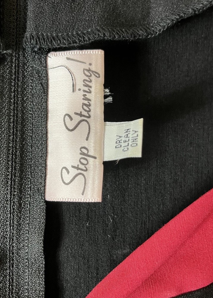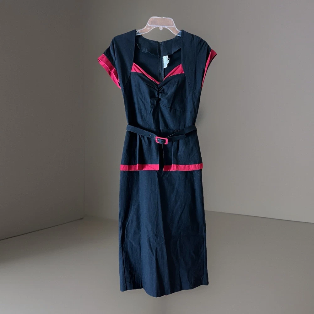 Stop Staring! Pin Up Wiggle Dress Black Red Trim Peplum Belted 30s Vintage M Turn heads with this striking Stop Starring! vintage-inspired pin-up wiggle dress , crafted with timeless 1930s–40s Hollywood glamour in mind. Known for flattering retro silhouettes, Stop Starring! dresses are favorites among rockabilly, burlesque, and vintage enthusiasts. Details: Brand: Stop Staring! Style: Pin-Up Wiggle / Pencil Dress with Peplum Skirt Color: Black with Red Trim Accents Features: Belted waist for hourglass shaping Cap sleeves and elegant neckline Kick back pleat for movement Peplum detail for a feminine, vintage silhouette Stretch fabric for comfort and fit Side/back zip closure Care Tag: Dry Clean or Hand Wash, Line Dry Condition: Excellent preowned, no flaws noted Measurements (approx., laying flat): Pit to Pit: 17" Shoulder to Hem: 45" Estimated Fit: Women’s Small to Medium (please compare measurements for best fit) ✨ A glamorous choice for cocktail parties, vintage events, retro weddings, or rockabilly nights out. Stop Starring! is a designer brand often worn in films and by celebrities, making this a collectible and timeless piece.