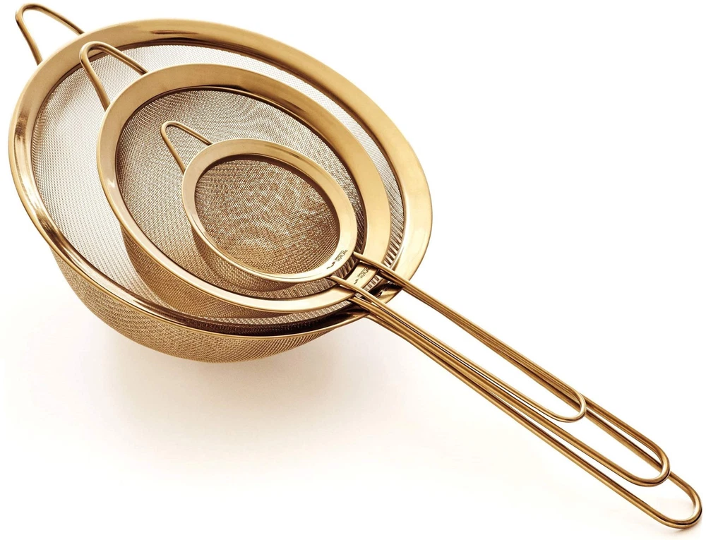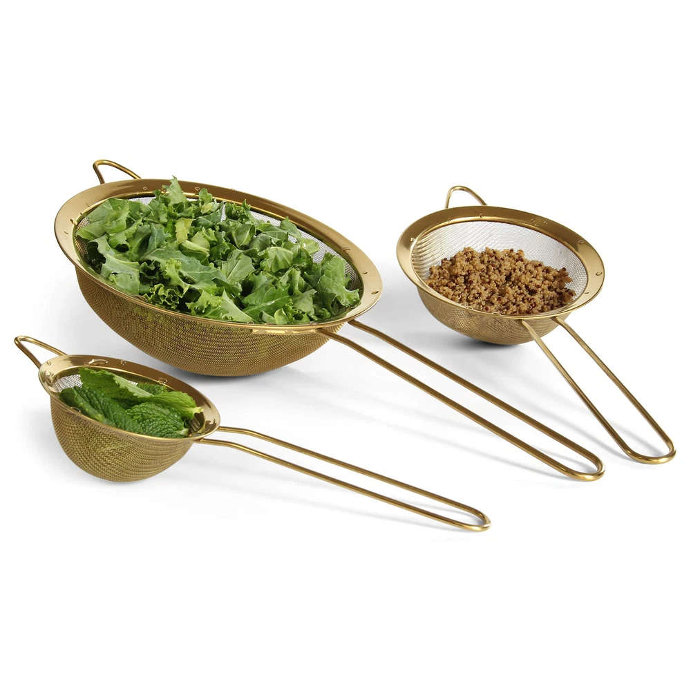 HIGH QUALITY 304 STAINLESS STEEL STRAINER SET - made from professional quality and premium 304 stainless steel. They are built to last as they are much stronger, resistant, durable and anticorrosive than cheaper 201 stainless steel and plastic strainer alternatives 3.3″, 5.5″ & 8″ SIZES WITH FINE TWILL MESH - organise yourself with our professional quality kitchen strainer set of 3, 3.3″,5.5″ and 8″. Our unique strainers, larger than average sizes are versatile for a wide range of needs in the kitchen. Each strainer features fine twill mesh and a sturdy handle, so they can be hung or stacked for easy storage TITANIUM ECO-FRIENDLY AND STYLISH GOLD COLOR FINISH - our kitchen strainers feature a titanium Physical Vapour Deposition eco-friendly coating. The PVD applied to all our food strainers is the highest quality coating and the entire process is environmentally harmless VERSATILE FOR USE IN THE KITCHEN - whether you need to drain, strain or sieve then you will achieve excellent results with our kitchen strainers. Pasta, vegetables, fruits, rice, quinoa, almond milk, smoothies, flour, sauces, gravy and more can be prepared to perfection with one of our strainers. Food won’t get stuck under the rim making it easy and convenient to clean THE ULTIMATE MULTIPURPOSE KITCHEN UTENSIL WITH 100% SATISFACTION – this strainer set has been tested in the SGS laboratories and the PVD Coating is dishwasher safe (certified test of 25 cycles), for best long-lasting results we advise to easily wash by hand. Our fine mesh strainer set is built to last and won’t break. So you can purchase and use at home with complete peace of mind