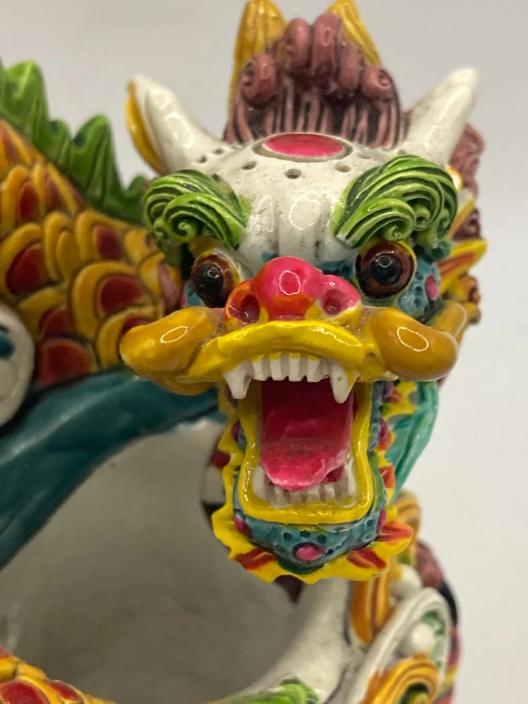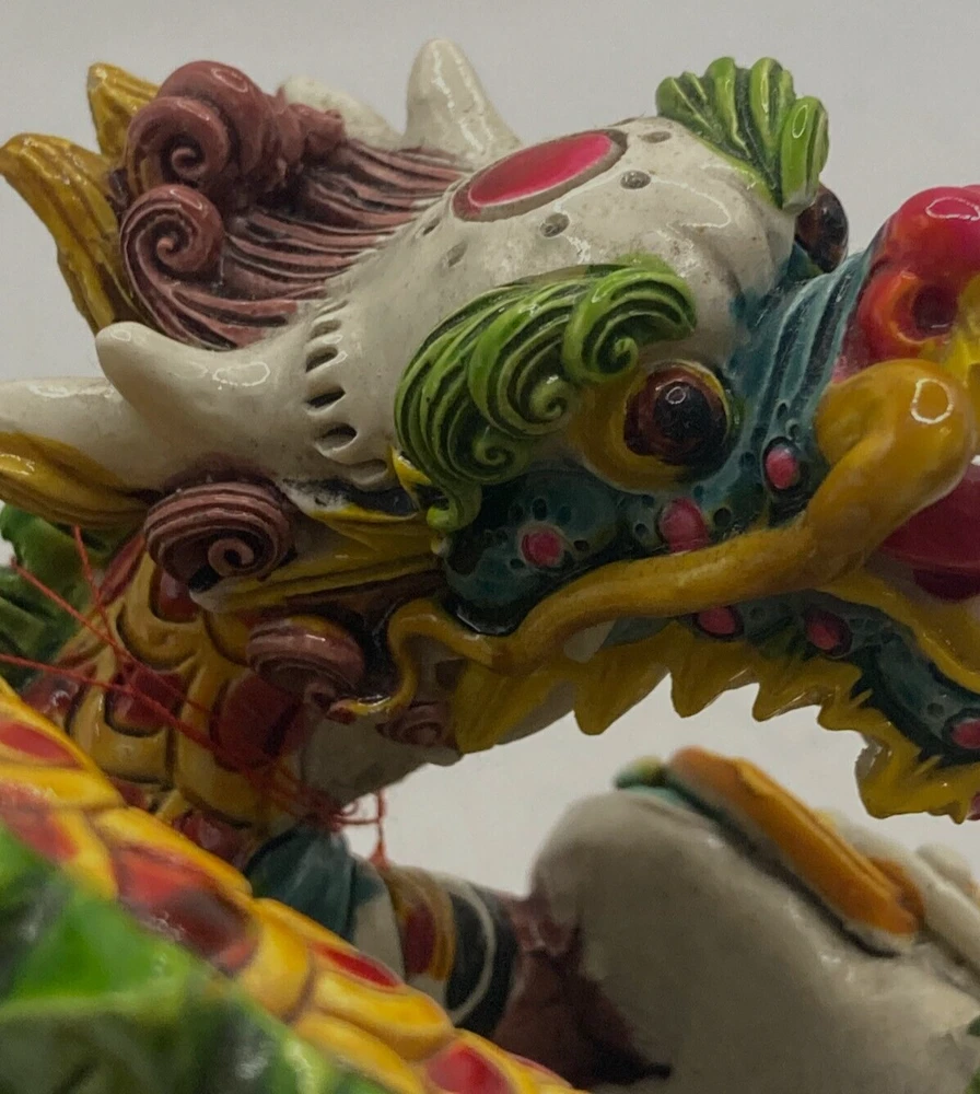 Chinese Dragon Sculpture Ornament Figurine H: 14 cms approx. 840 grams approx. Ceramic with a wood base. VGC. No chips or damage.