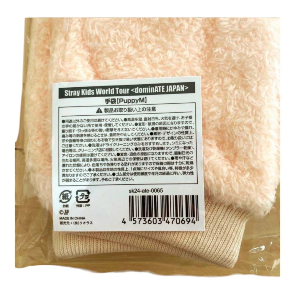 The product is a pair of BOA gloves worn by Stray Kids member Seungmin during the dominATE JAPAN World Tour 2024. These gloves feature a design with the PuppyM character and are likely a special merchandise item from the tour. Made in Japan, these gloves hold significance for fans of Stray Kids and collectors of music memorabilia. The item represents a unique piece of memorabilia from the tour, showcasing a connection to both the popular K-pop group and their performances in Japan.