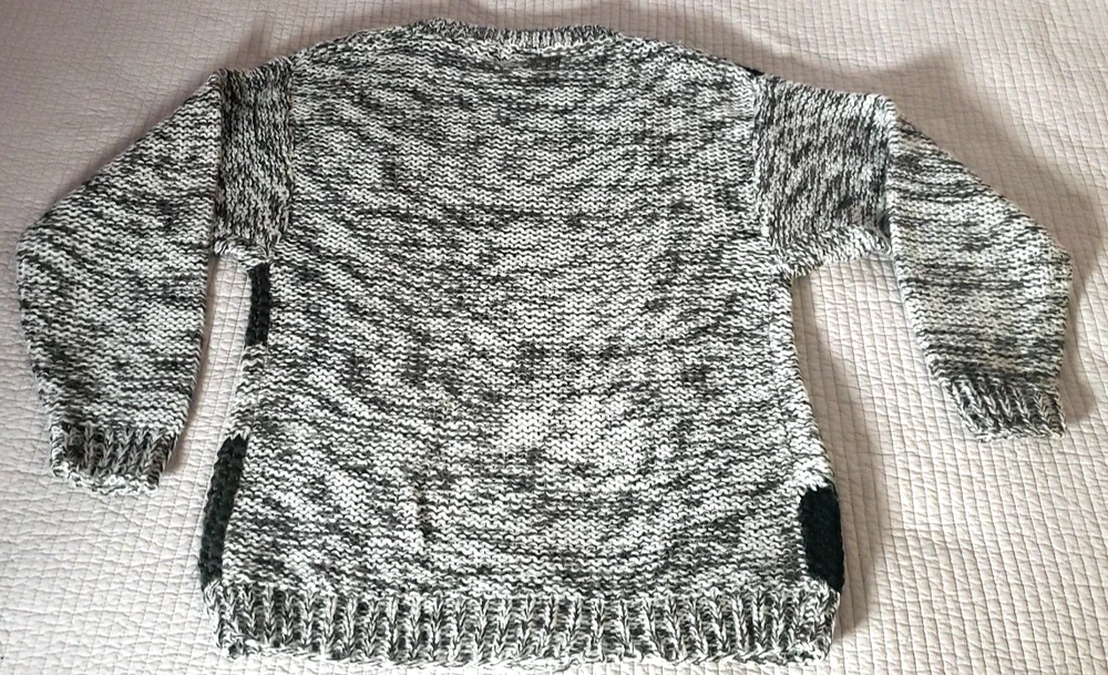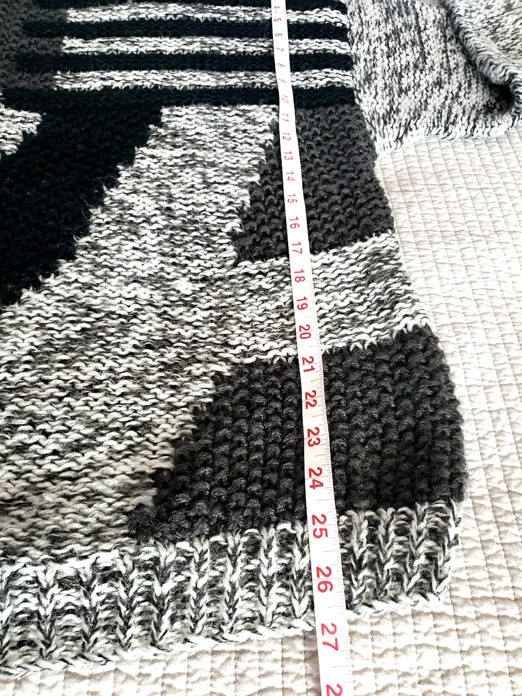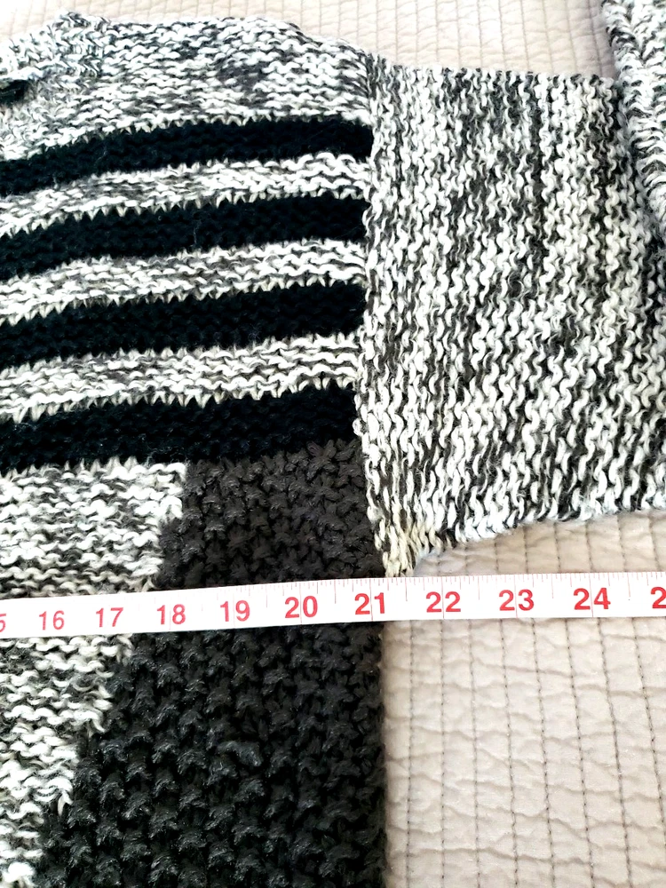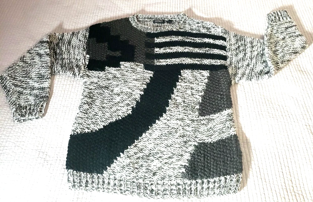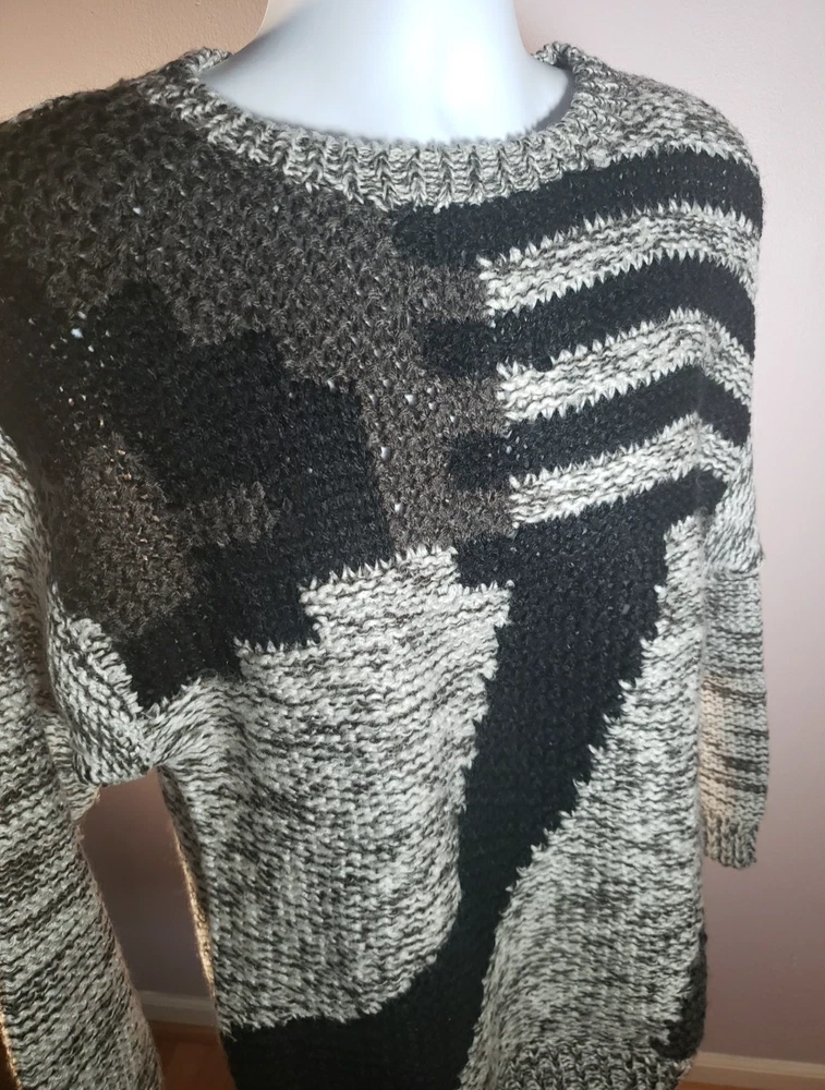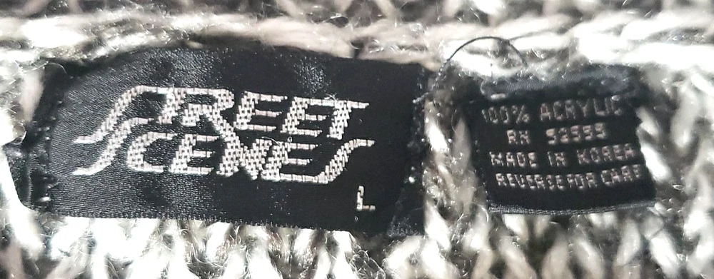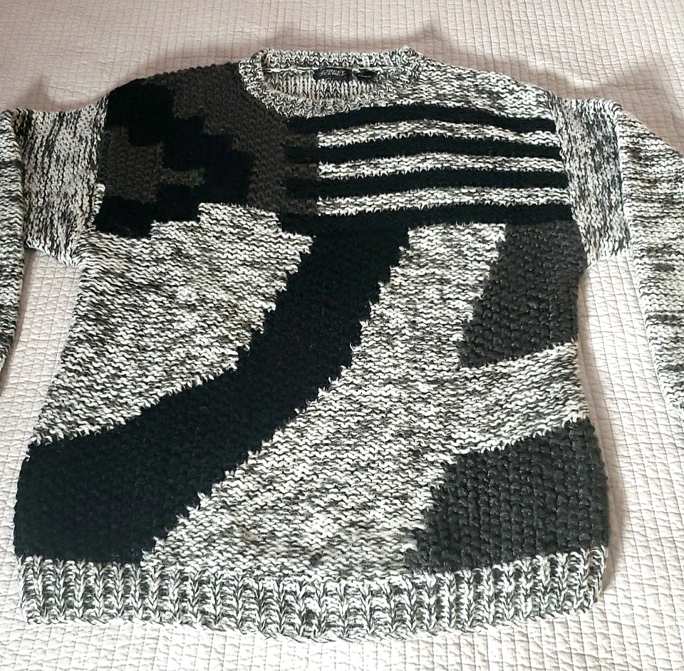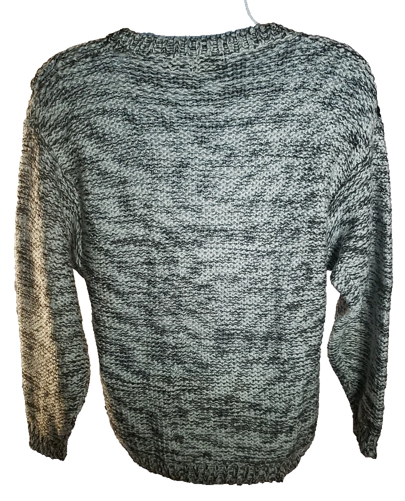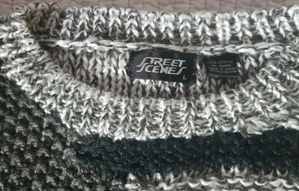 The Street Scenes Casual Knit Sweater is a men's large in a gray and black geometric pattern featuring a classic round neck and long sleeves, perfect for the transitioning seasons of fall, spring, and winter. Its relaxed fit ensures a comfortable wear for a variety of occasions, from casual outings to business settings. Crafted from lightweight 100% acrylic material with an open-knit fabric type, the sweater is designed for ease of movement and a breathable feel. The pullover style makes it easy to wear, and being machine washable, it's also easy to care for. Embrace the retro vibe with this piece that celebrates timeless fashion with a modern twist. See approximate measurements for the best fit. Pre-owned good condition. Slight wear. Approximate measurements of the sweater lying flat: Armpit to armpit 21 inches Shoulder to bottom hem 27 inches Sleeve length 22 inches