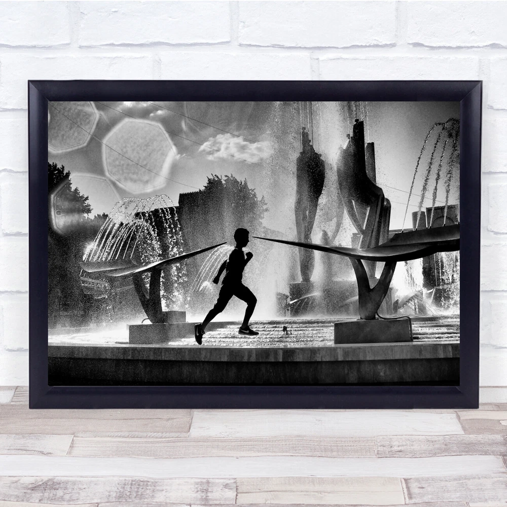 Street Water Fountain Modern Run black and white Leaping Jump Wall Art Print
