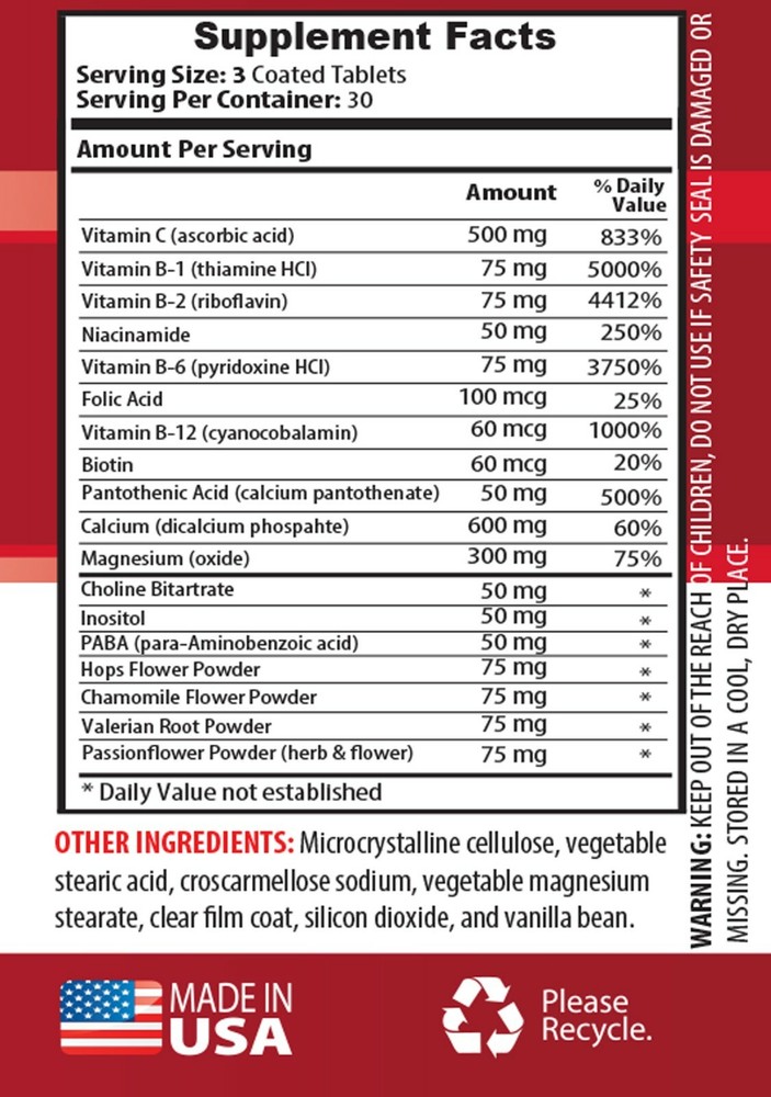 mood boost for men and women - STRESS B WITH C - anti-aging skin care 2 BOTTLE STRESS B WITH C ANTIOXIDANT BOOSTER ANTI LETHARGY BOOSTER IMMUNE DEFENSE SUPPORTER COGNITIVE SUPPORTER ENHANCED MOOD SUPPORT STOP REDUCE INFLAMMATION 2 BOTTLE = 180 COATED TABLETS STRESS B W/ C COMPLEX: The natural vitamin and herbal blend in this stress relief formula all work toegther to support the mood, boost energy, promote relaxation and ease, enhance mental clarity, and ultimately relieve stresses of everyday living. All the ingredients in the product are natural and all supply the body with the tools it requires to help fight stresses on its own. STRESS B W/ C ANTIOXIDANT BOOSTER: Vitamin C is a strong antioxidant that can strengthen your body’s natural defenses. Antioxidants are molecules that boost the immune system. They do so by protecting cells from harmful free radicals. Studies show that consuming more vitamin C can boost your blood antioxidant levels by up to 30%. This helps the natural defenses fight inflammation. Vitamin C is a strong antioxidant that can boost your blood antioxidant levels. This may help reduce the risk of chronic conditions like troubles with the cardiovascular system. STRESS B W/ C ANTI LETHARGY BOOSTER: All B vitamins are water-soluble. They help to convert carbohydrates, fats, and protein into energy, or glucose. Riboflavin plays a major role in the production of energy by assisting in the metabolism of fats, carbohydrates, and proteins. Vitamin B5 helps in reducing body fatigue and weariness, and it sets the metabolic activities of the entire body on the right track. This means that this vitamin is capable of increasing the stamina of the human body to perform various tasks in an efficient and healthy way. STRESS B W/ C IMMUNE DEFENSE SUPPORTER: The B vitamins are sometimes called anti-stress vitamins, because they boost the body's immune system in times of stress. Vitamin B5 is very good at strengthening the immune system of the human body. This helps us fight against a number of infections. To decrease the chances of your body contracting something dangerous, be sure that your white blood cell count is maximized and your immune system is functioning properly by eating foods that are rich in this vitamin. STRESS B W/ C COGNITIVE SUPPORTER: Large observational studies link choline intake and blood levels to improved brain function, including better memory and processing. Supplementing with 1,000 mg per day led to improved short- and long-term verbal memory in adults aged 50–85 who had poor memory. Supplementing with choline bitartrate has been shown in several studies to improve memory. Whether you are suffering memory loss from aging or perhaps some other circumstance, choline bitartrate is said to help greatly. STRESS B W/ C ENHANCED MOOD SUPPORT: Vitamin B6 plays an important role in mood regulation. This is partly because this vitamin is necessary for creating neurotransmitters that regulate emotions, including serotonin, dopamine and gamma-aminobutyric acid (GABA). Vitamin B6 may also play a role in decreasing high blood levels of the amino acid homocysteine, which have been linked to depression and other conditions. Several studies have shown that depressive symptoms are associated with low blood levels and intakes of vitamin B6, especially in older adults who are at high risk for B vitamin deficiencies. STRESS B W/ C STOP : Inositol affects the processes that make neurotransmitters, the molecules responsible for relaying information within your brain. Serotonin is one important neurotransmitter affected by inositol. This molecule has many roles in your body and impacts your behavior and mood. Researchers have examined whether inositol supplements can improve symptoms associated with conditions affecting serotonin and the brain. This includes disorders, such as panic disorder, obsessive-compulsive disorder (OCD) and posttraumatic stress disorder (PTSD). STRESS B W/ C REDUCE INFLAMMATION: Inflammation is an immune system reaction to fight infection. Chamomile tea contains chemical compounds that can help reduce inflammation. However, long-term inflammation is linked to a wide range of health problems, including gastrointestinal pain, arthritis, autoimmune disorders, and even depression. CAUTION: Do not exceed recommended dose. Pregnant or nursing mothers, children under the age of 18, and individuals with a known medical condition should consult a physician before using this or any dietary supplement. These statements have not been evaluated by the Food and Drug Administration. This product is not intended to diagnose, treat, cure, or prevent any disease. PREMIUM QUALITY PRODUCT