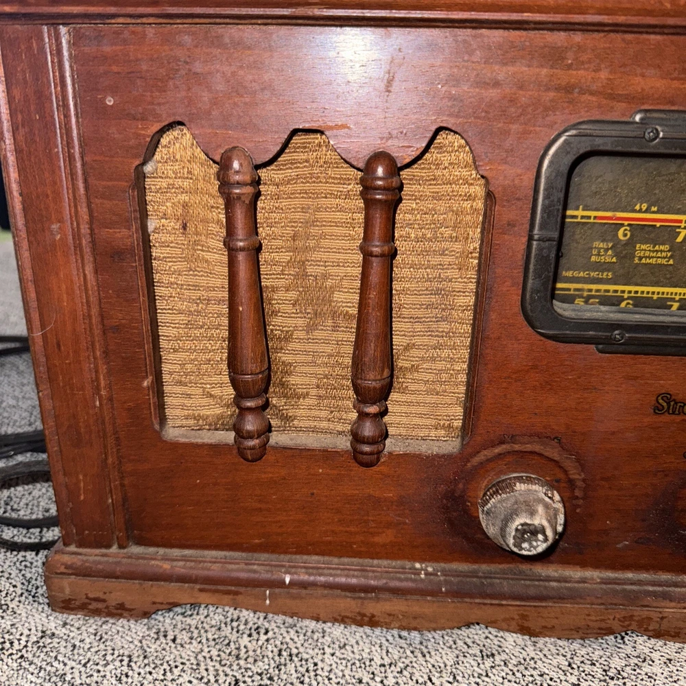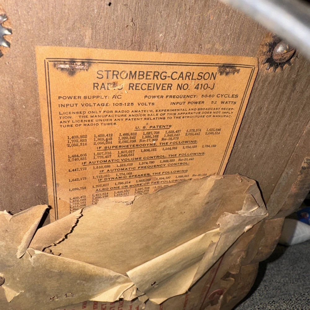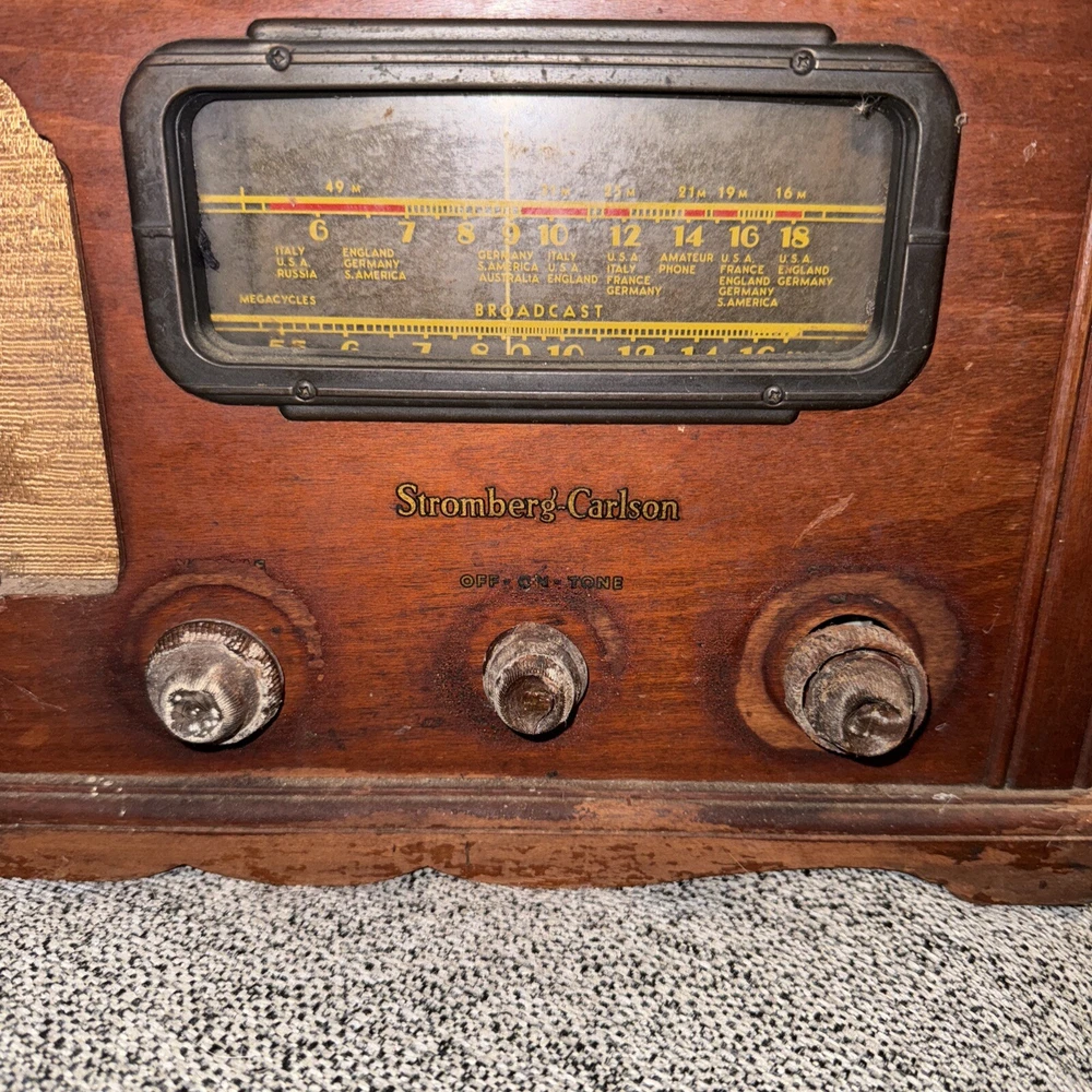 Does not work. For parts/repairs. The Stromberg-Carlson Radio Receiver No. 410-J is a vintage tube radio manufactured in the United States during the 1930s to 1940s. This collectible item is a part of radio, phonograph, TV, and phone memorabilia. The radio is designed by the brand Stromberg and is being sold for parts or repairs. It offers a piece of history from the golden age of radio technology, making it a desirable item for collectors and enthusiasts of vintage electronics.