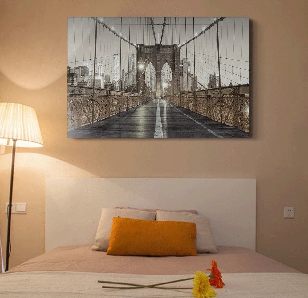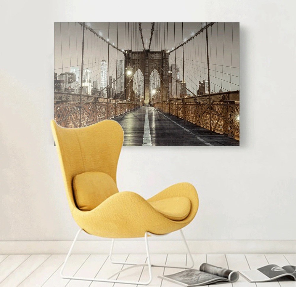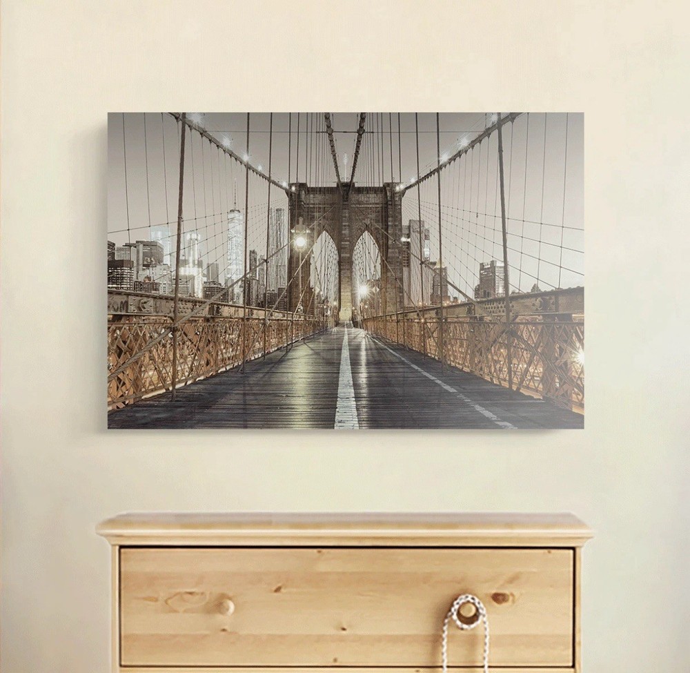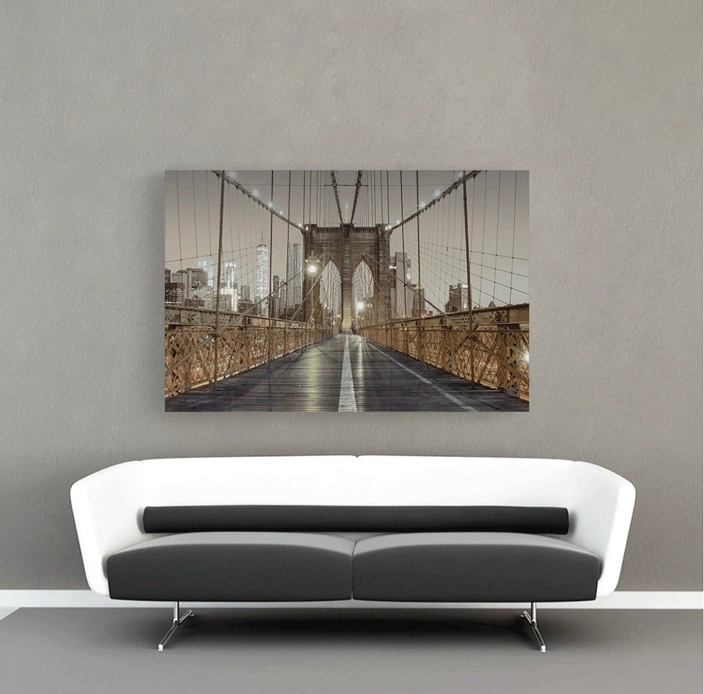 The Studio 500 Premium Canvas of The Brooklyn Bridge in Black/White/Gold is a stylish and contemporary piece of home décor. This handmade giclee and iris print features the iconic Brooklyn Bridge in a striking gold, black, and white color scheme. Measuring 48" w x 32" h x 1.5" d, this canvas is ready to hang and comes with two hooks installed for easy display. Made in the USA with high-quality materials, this unique piece is perfect for any room in your home, adding a touch of New York charm to your space.