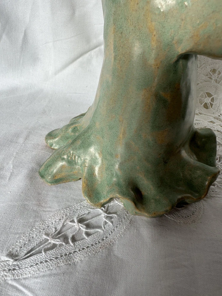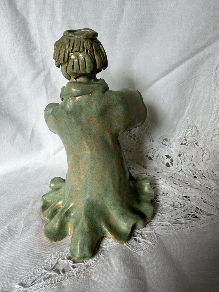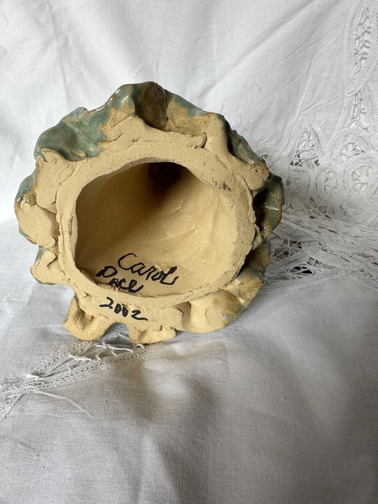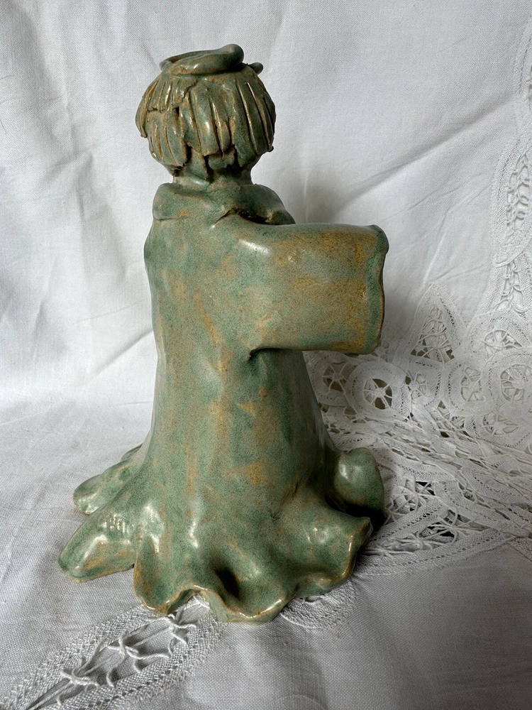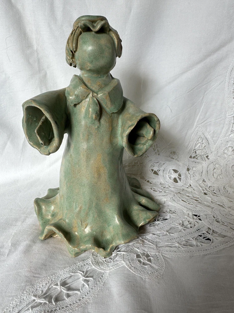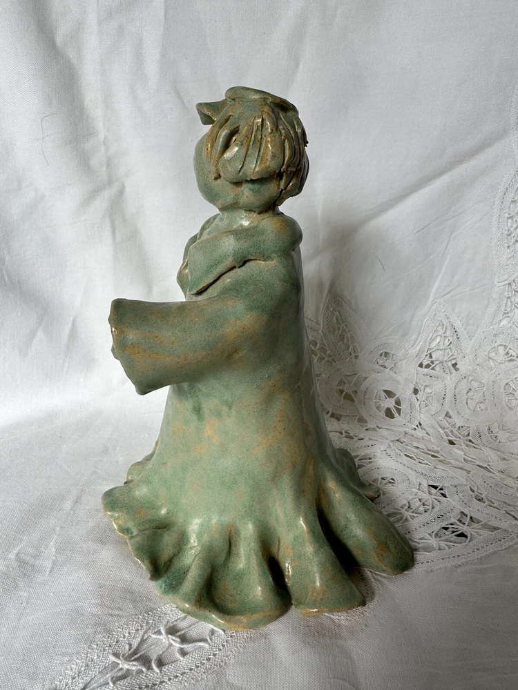This beautiful ceramic pottery figurine depicts an angel with a halo, hand-painted and handmade with great attention to detail. The light blue and beige color gives it a serene and peaceful appearance, making it a perfect decoration for any room and occasion. She is handmade and is marked on he gown and on the bottom: Carol Pace 2002. She measures 7” tall and 5” at her widest point. She has no chips or cracks.