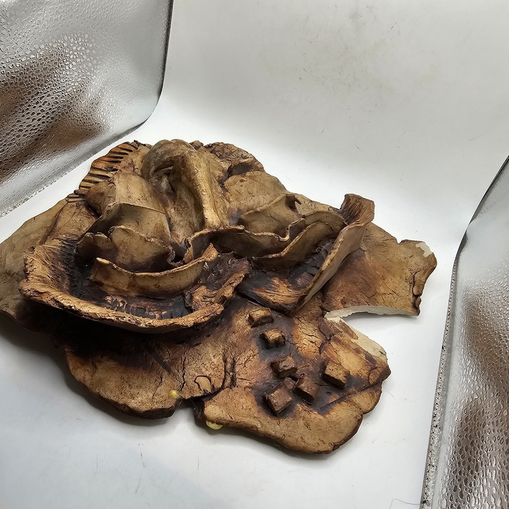 This is a unique and one-of-a-kind Studio Art Pottery Face Mask Art signed by Farrell. It is a weirdo estate find that features a 3D sculpture in the form of a face mask. The mask is made of clay and is an example of pottery production technique. It is a perfect addition to any art collection and a great conversation starter. There are chips. May be a larger one on top... not sure if that was on purpose. See photos for imperfections sold as is