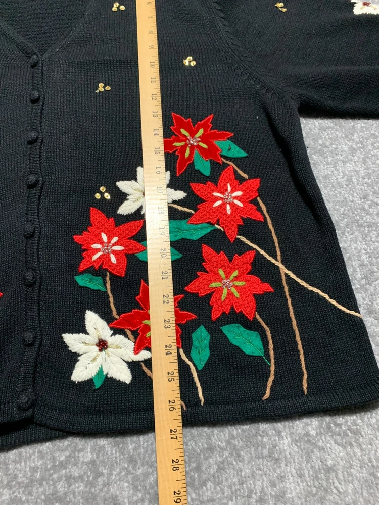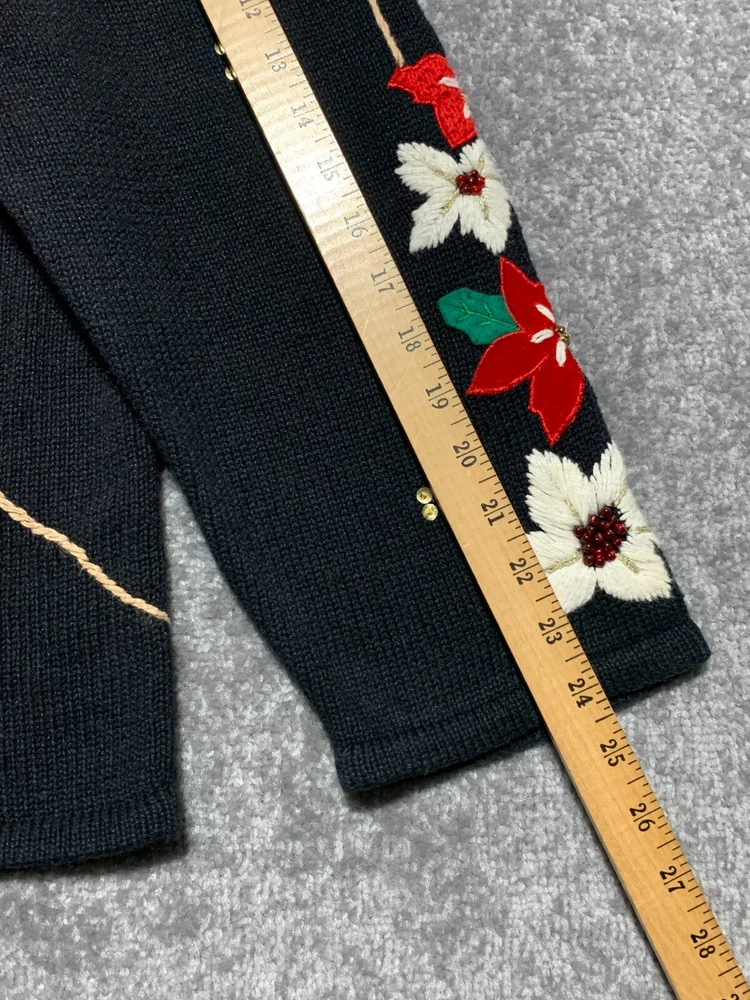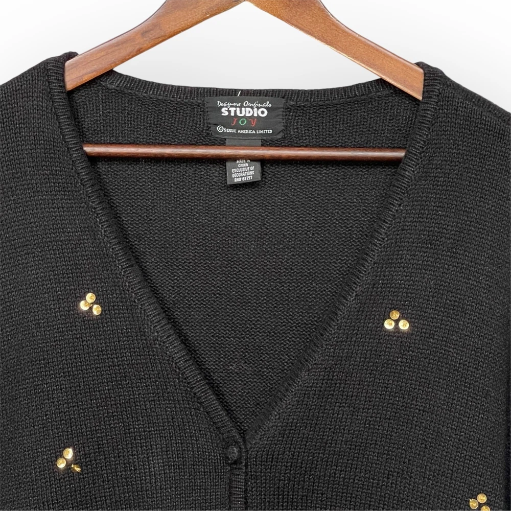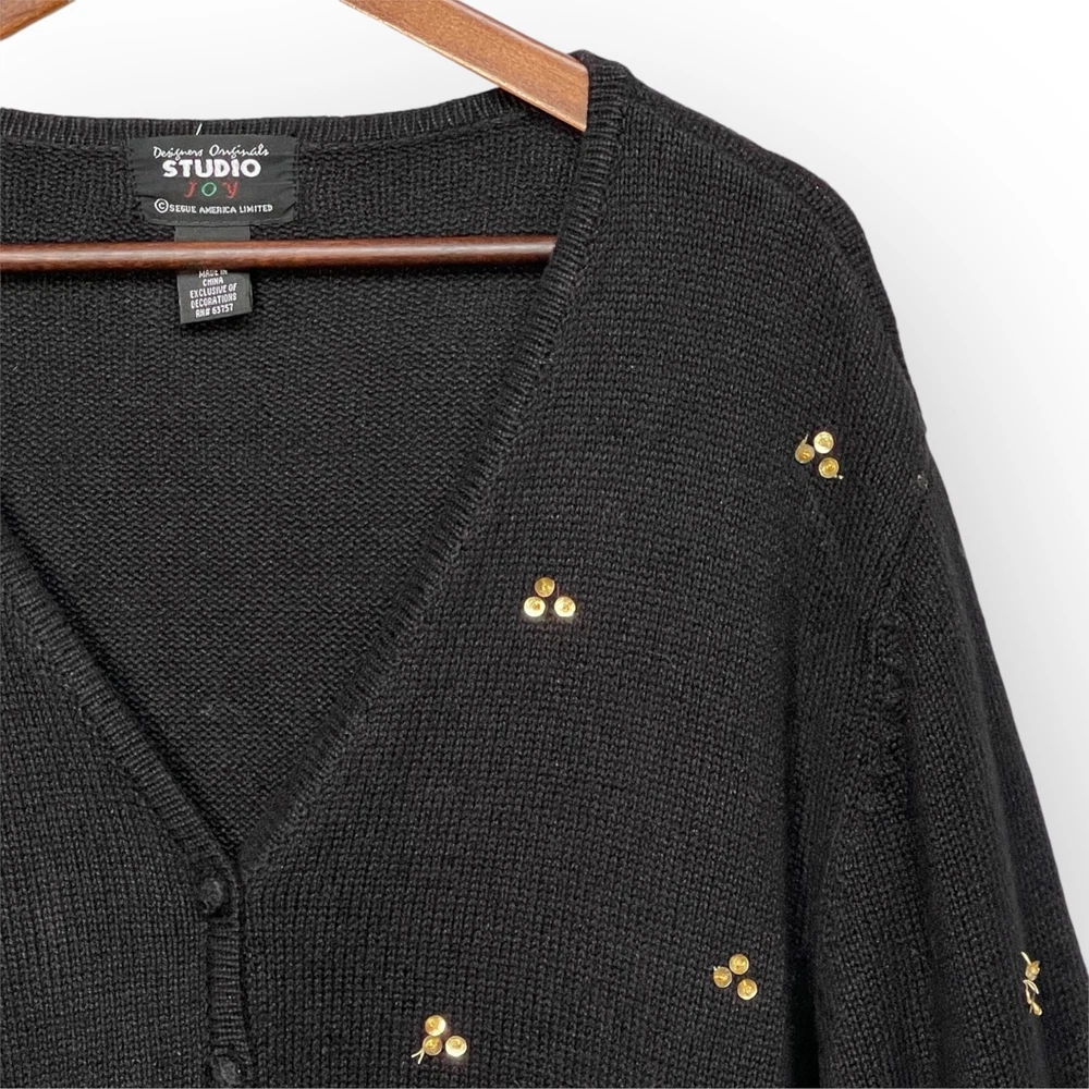 * Studio Joy Button Front Cardigan Women Size 3X Black Floral Sequins Embroidery * *Good Pre-owned Condition *Please see photos for approximate measurements (in inches), fabric make, washing instructions, and other notable details. *Purchased items are shipped out next business day.