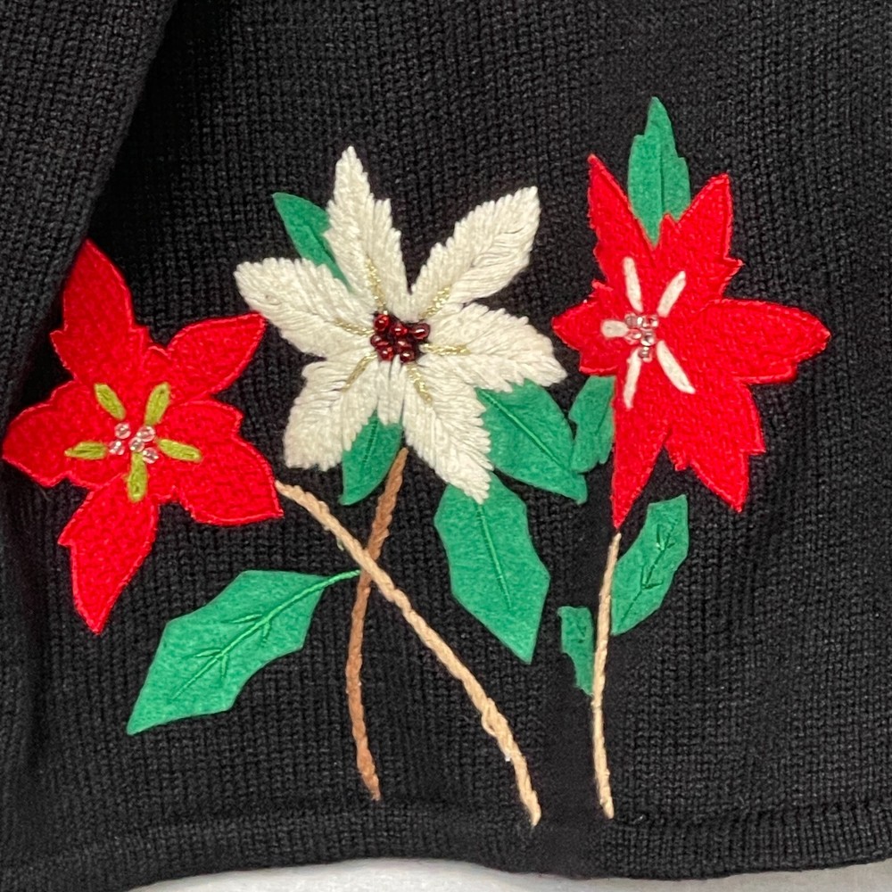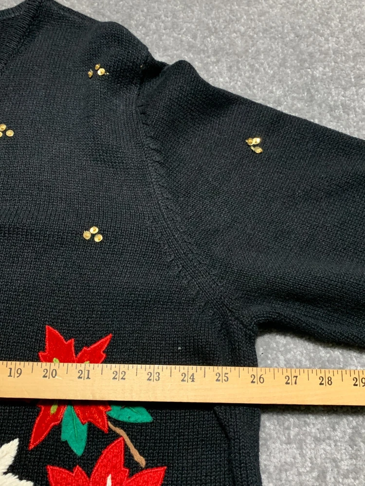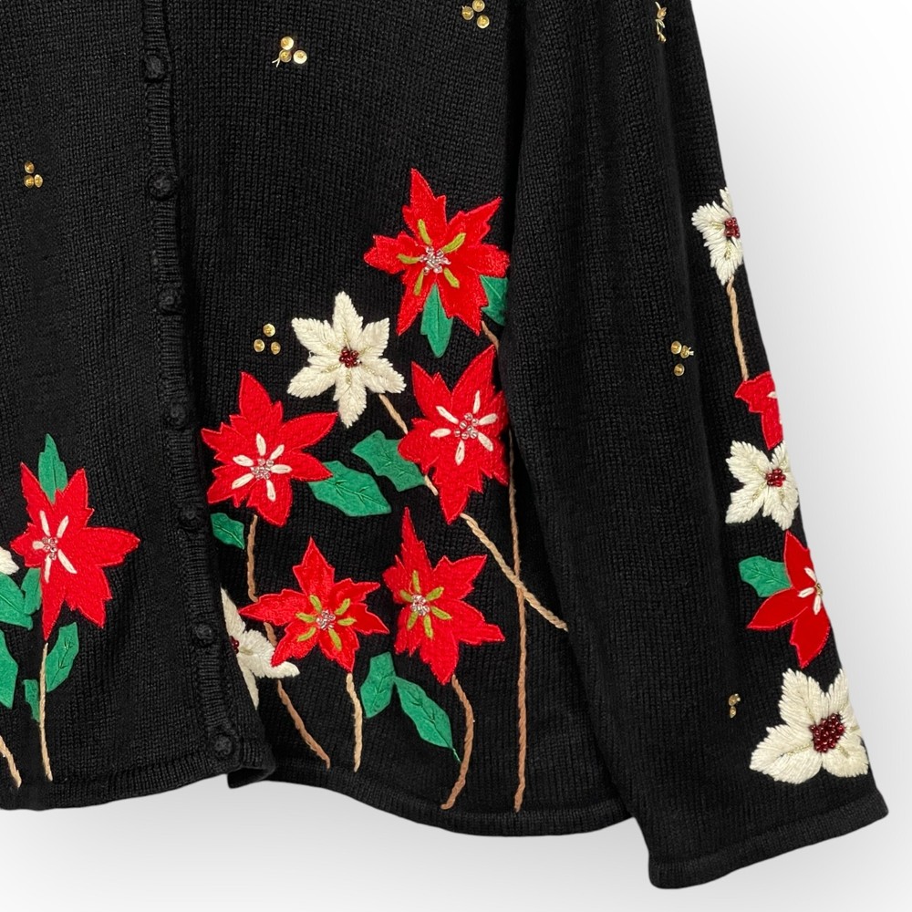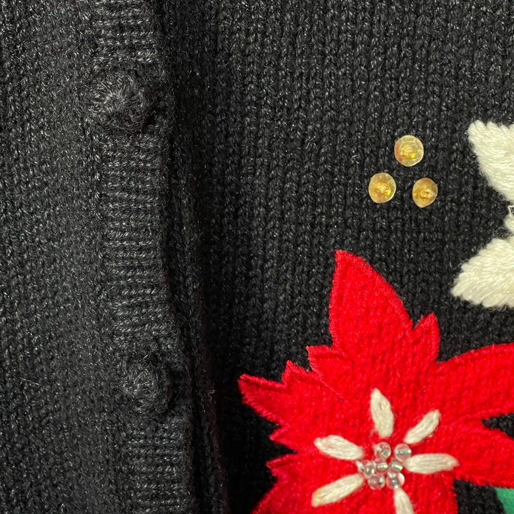 * Studio Joy Button Front Cardigan Women Size 3X Black Floral Sequins Embroidery * *Good Pre-owned Condition *Please see photos for approximate measurements (in inches), fabric make, washing instructions, and other notable details. *Purchased items are shipped out next business day.