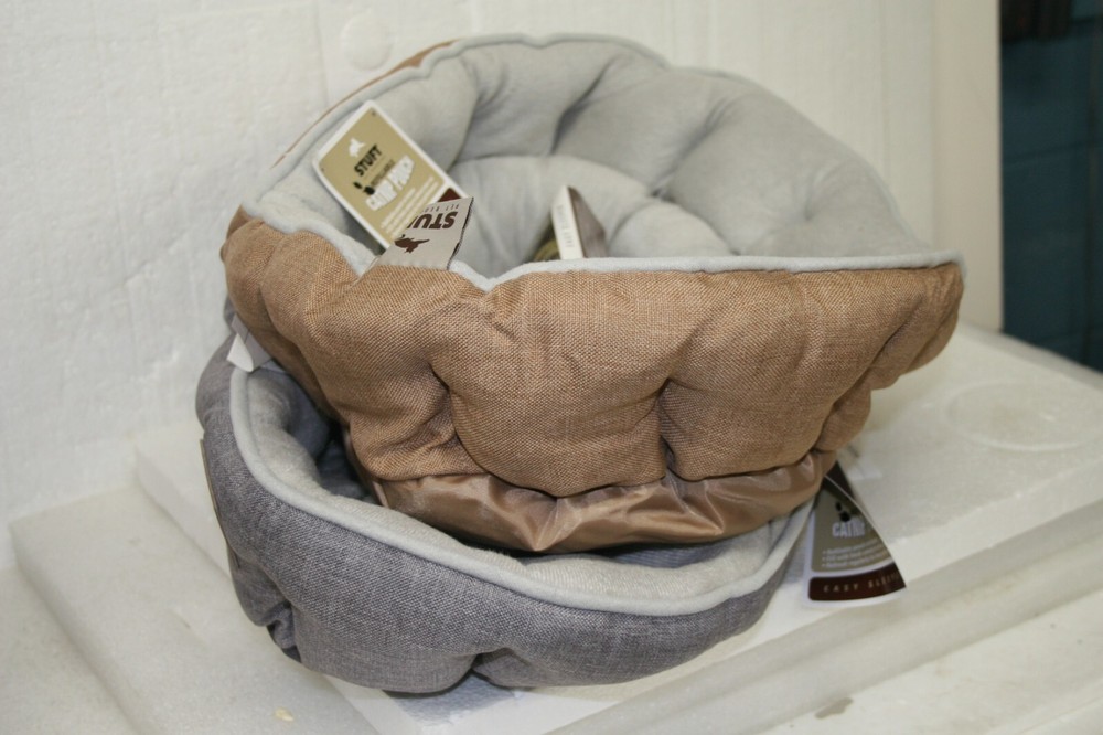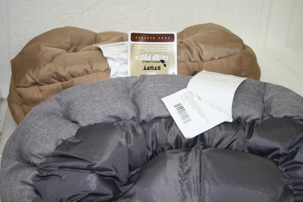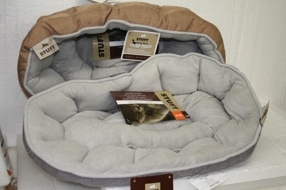 Stuft Easy Sleeper Cat or Small Dog Beds set of two count You get One Beige and One Grey Countoured Shape for cuddly support Perfect for lounging Refillable Catnip pouch on outside bottom Washable and easy to wash due to the small size. Care instructions: Remove Catnip pouch, machine was gentle, machine dry, low heat.