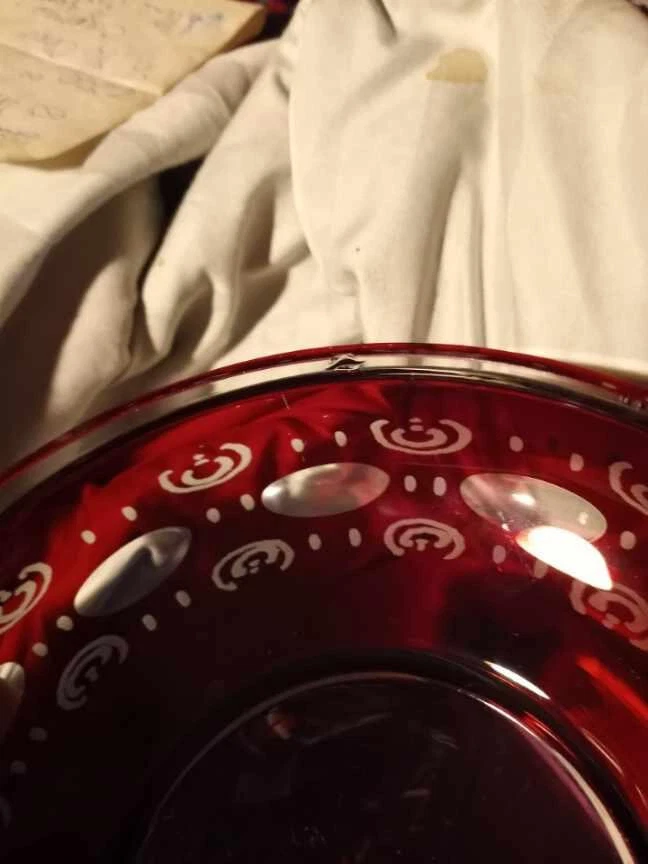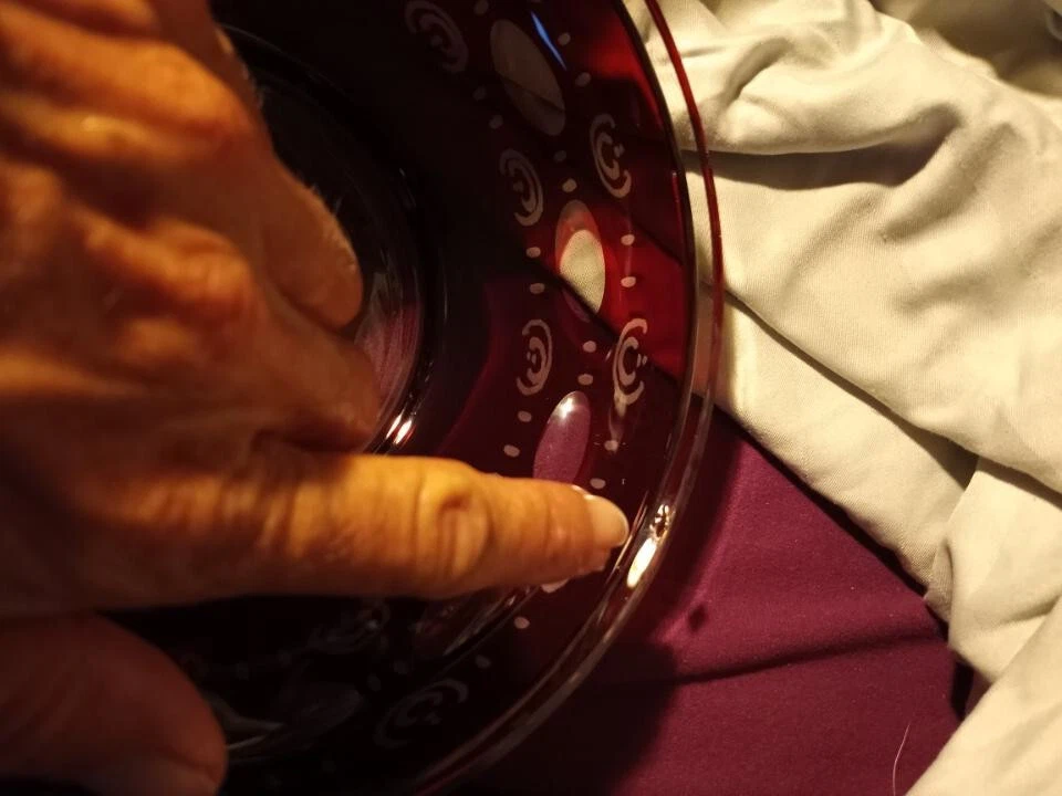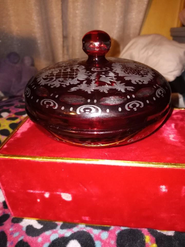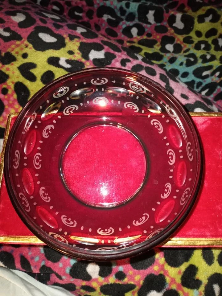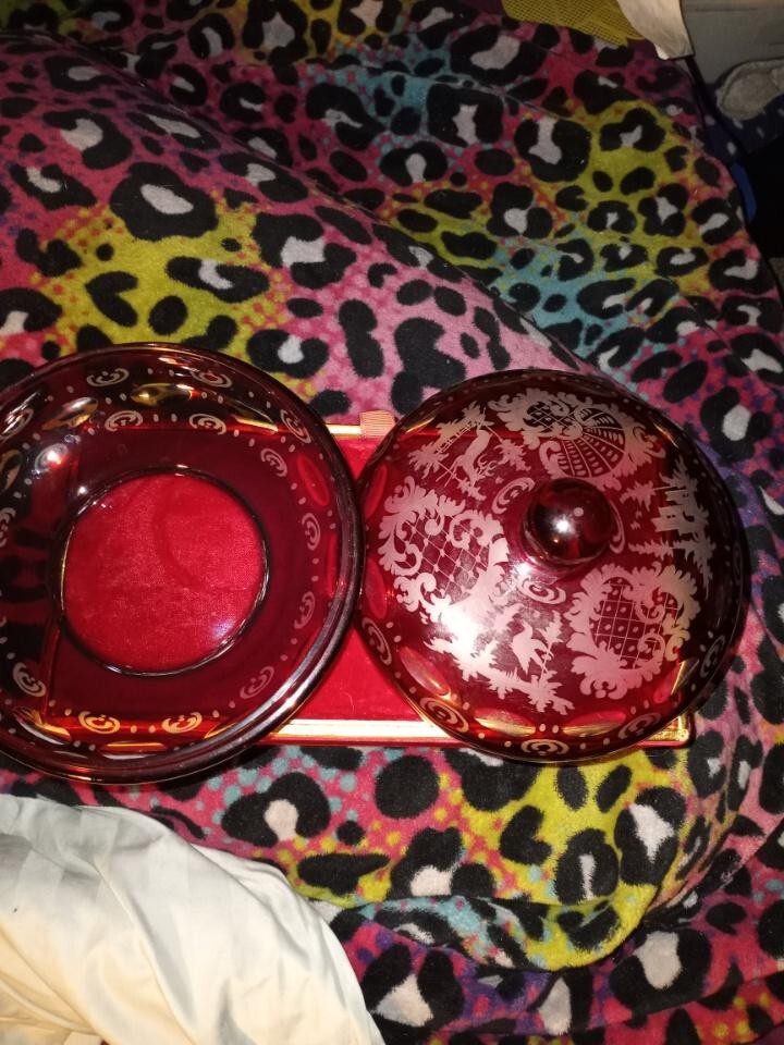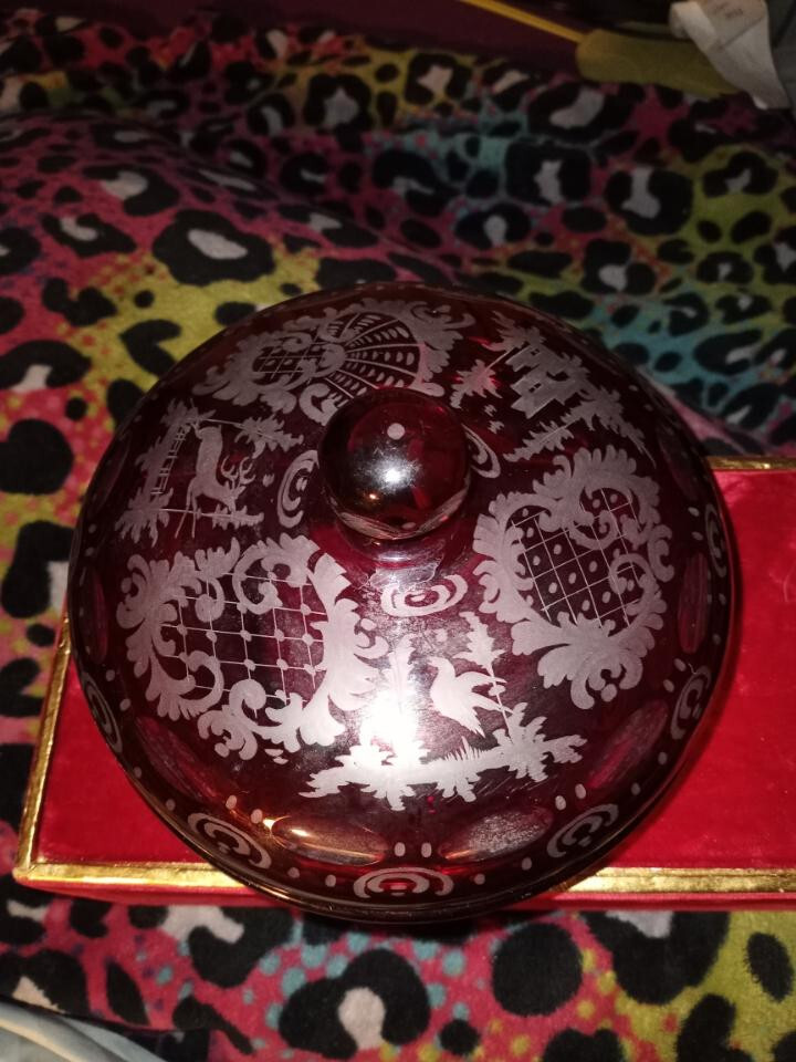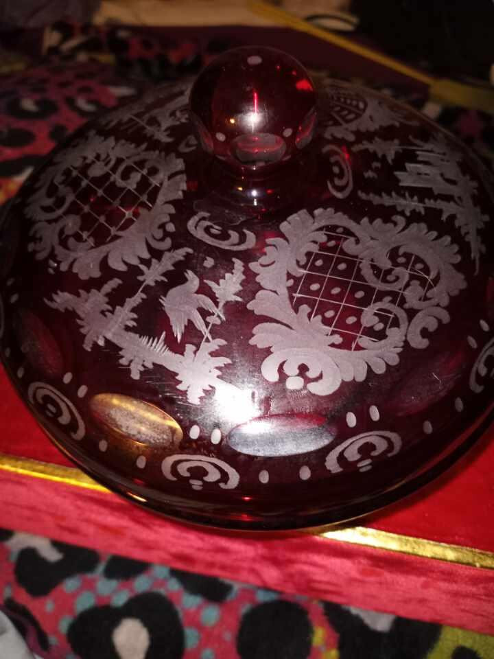This stunning antique bowl from Czechoslovakia in the 1920s features beautiful etched glasswork of a stag, bird, and castle pattern in ruby red and clear colors. The bowl is made of high-quality glass material and comes with a lid. It is perfect for decorative use or as a unique addition to any collection. The production style of this bowl is ruby glass and it is categorized under bowls, decorative cookware, dinnerware, and serveware, and pottery and glass. This bowl is a must-have for anyone who appreciates the beauty of antique glassware. Does have a small chip on the inside of bottom pic me pointing it out. Thank you for looking at this item,please take the time to look at the other items listed. May you and your Loved Ones be filled with Peace,Love and Joy!