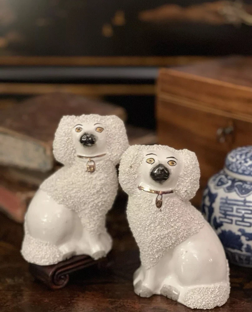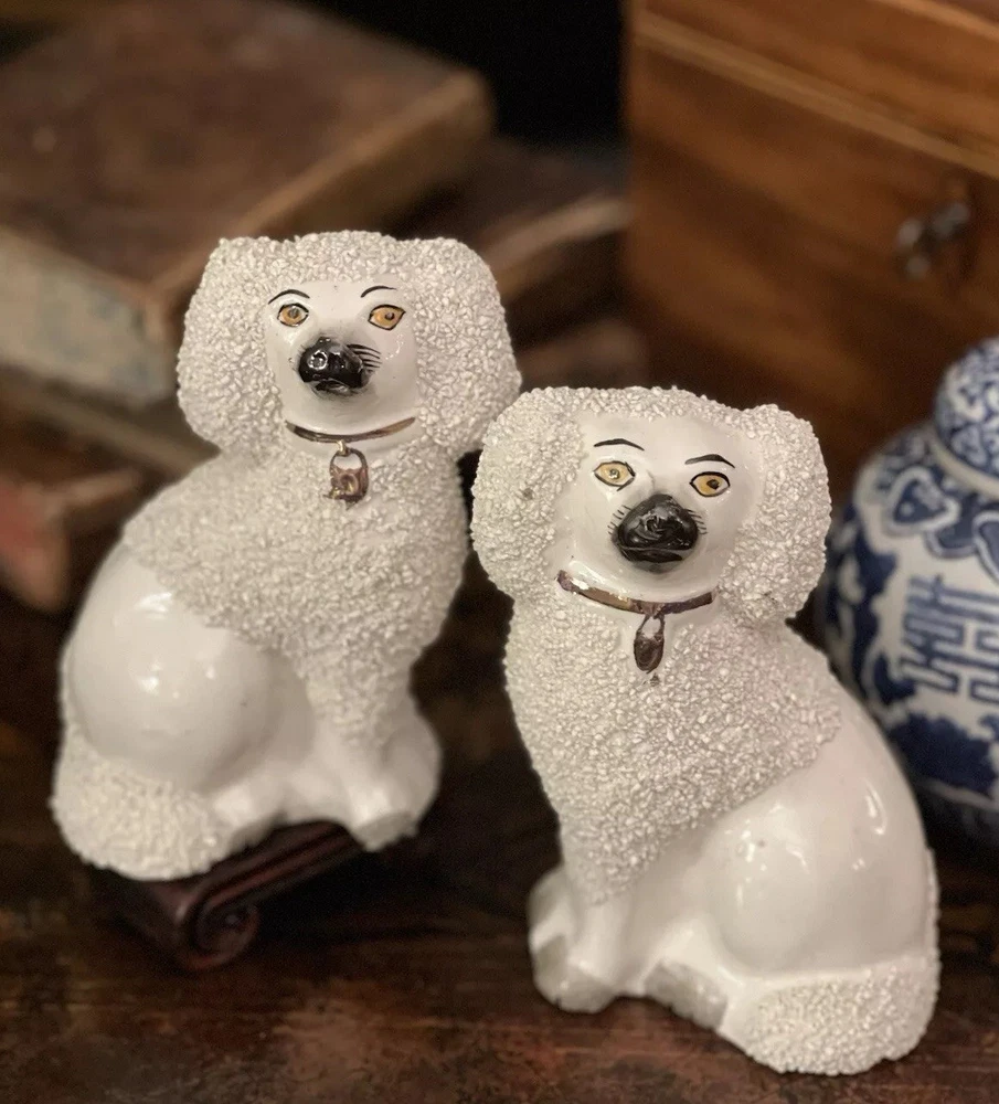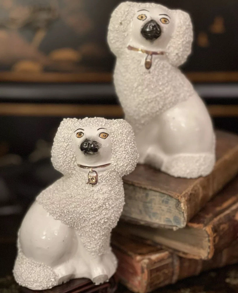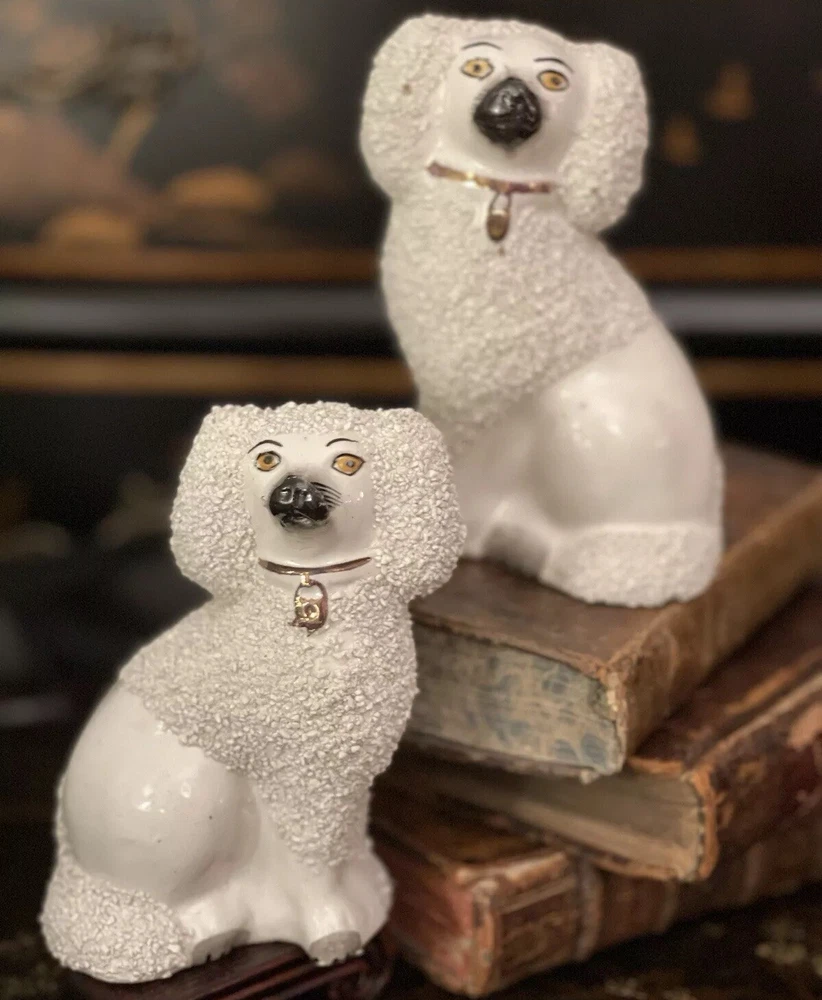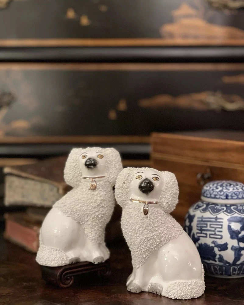 Stunning Rare Antique 19C English Porcelain Staffordshire Mantle Dogs β’ Classic Staffordshire β’ Marvelous Period Examples β’ Textural Coats β’ Height 4.5β Offered for you is your chance to own a stunning rare 19C pair of sought after period English Staffordshire textural glazed mantle dogs in classic form and lovely versatile scale. Highly desirable for their timeless style, this darling pair of right and left facing Staffordshire figures will bring a touch of the English countryside to any setting in which they are placed when displayed on their own or as part of a collection or arrangement. Stunning surviving examples. Minimal expected characteristic manufacturing anomalies and typical age related wear as is common to pieces of this antique status. Superb. Over 100 years old. No longer manufactured. Display ready. * Listing is for pair of spaniel mantle dogs only. Other objects are for display purposes. Height 4.5β