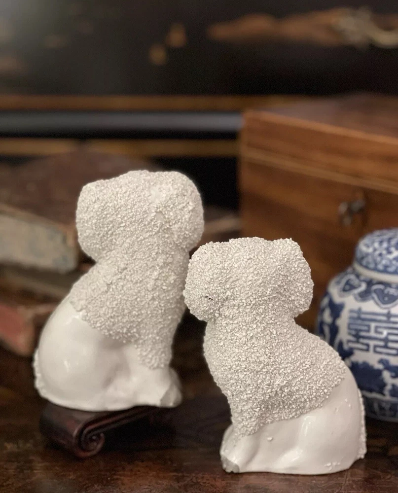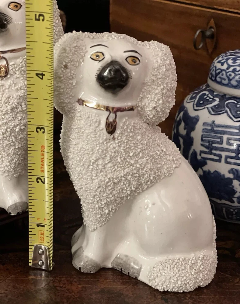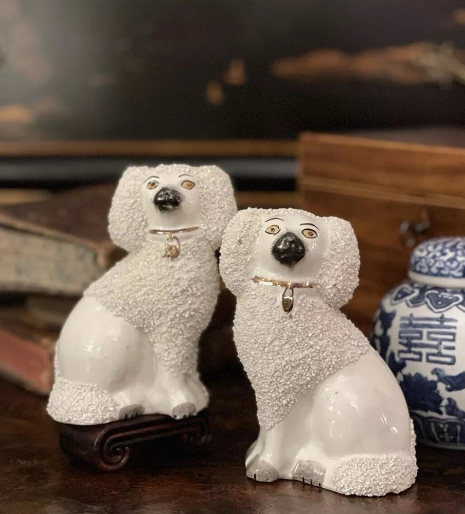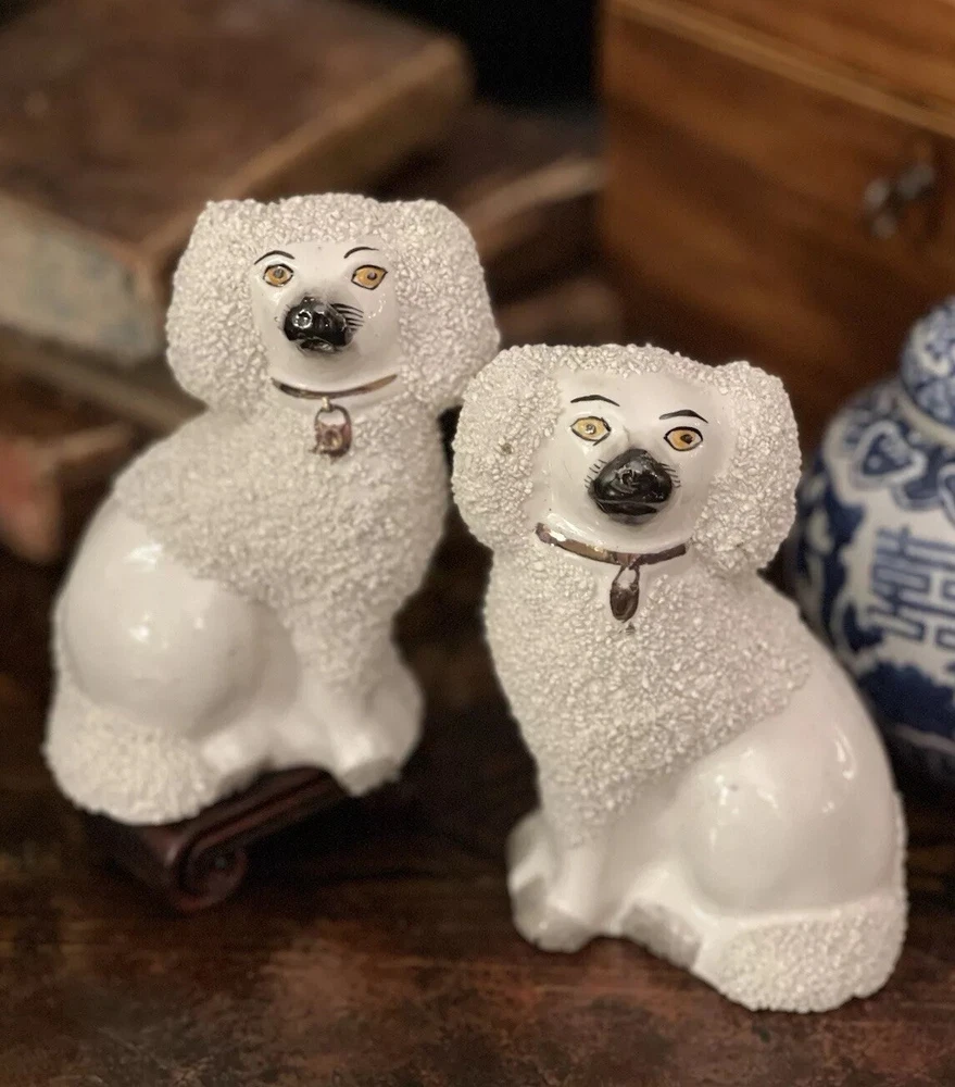 Stunning Rare Antique 19C English Porcelain Staffordshire Mantle Dogs β’ Classic Staffordshire β’ Marvelous Period Examples β’ Textural Coats β’ Height 4.5β Offered for you is your chance to own a stunning rare 19C pair of sought after period English Staffordshire textural glazed mantle dogs in classic form and lovely versatile scale. Highly desirable for their timeless style, this darling pair of right and left facing Staffordshire figures will bring a touch of the English countryside to any setting in which they are placed when displayed on their own or as part of a collection or arrangement. Stunning surviving examples. Minimal expected characteristic manufacturing anomalies and typical age related wear as is common to pieces of this antique status. Superb. Over 100 years old. No longer manufactured. Display ready. * Listing is for pair of spaniel mantle dogs only. Other objects are for display purposes. Height 4.5β