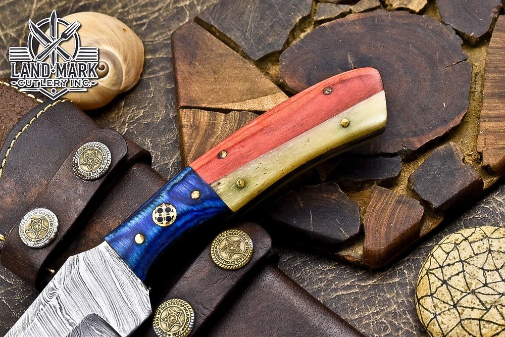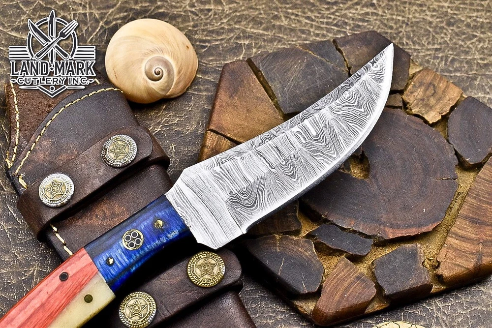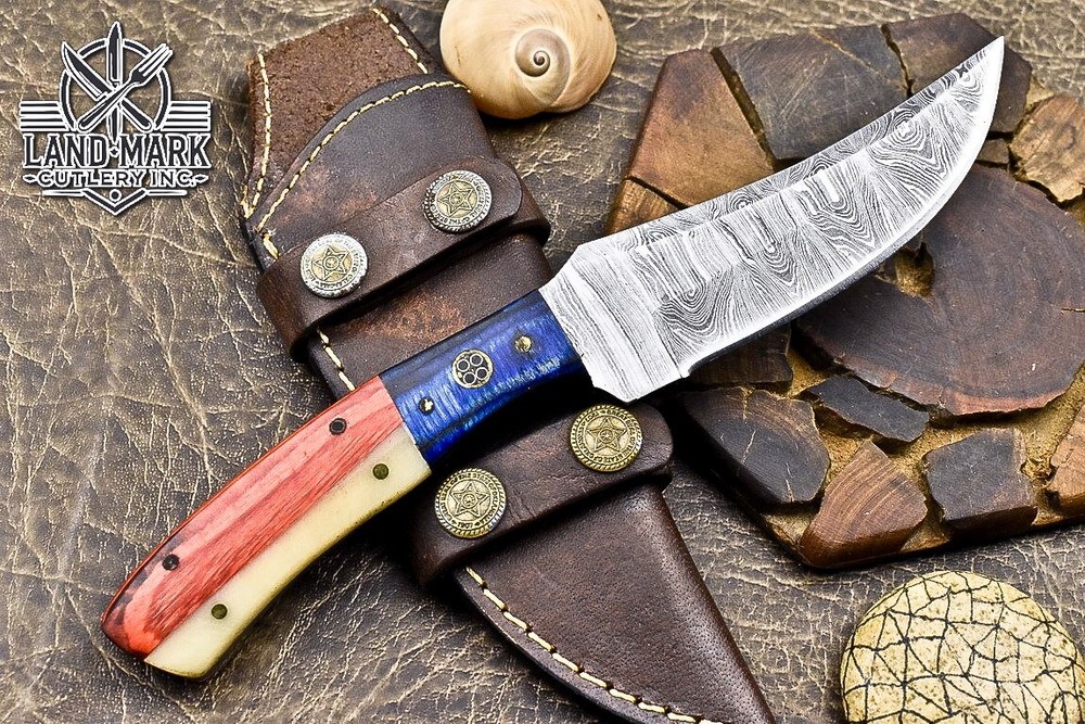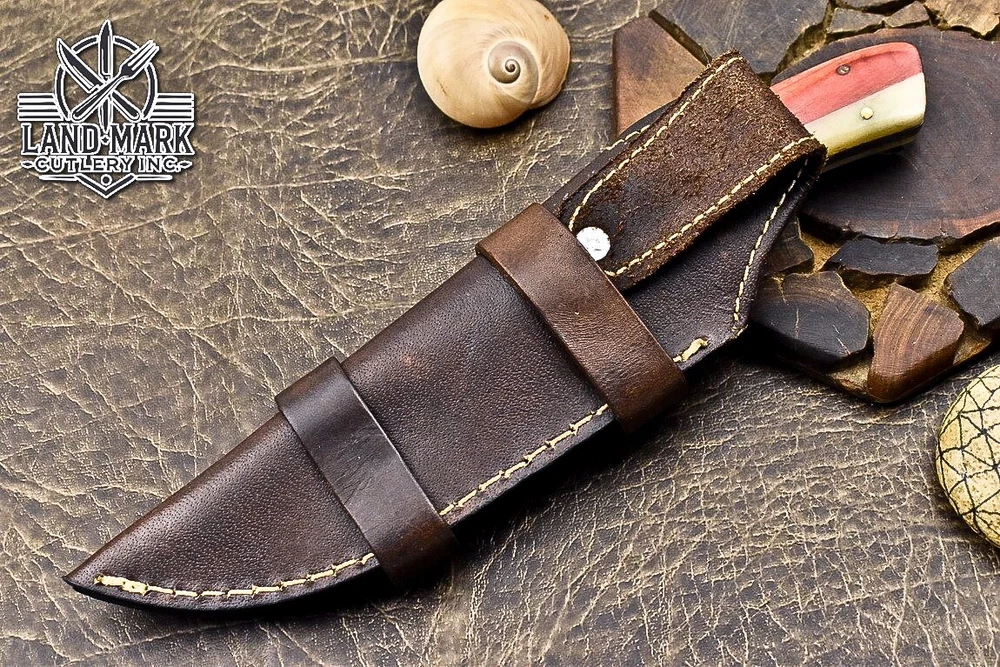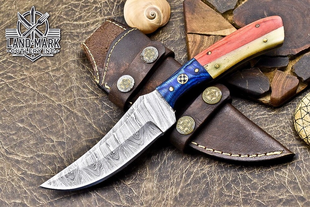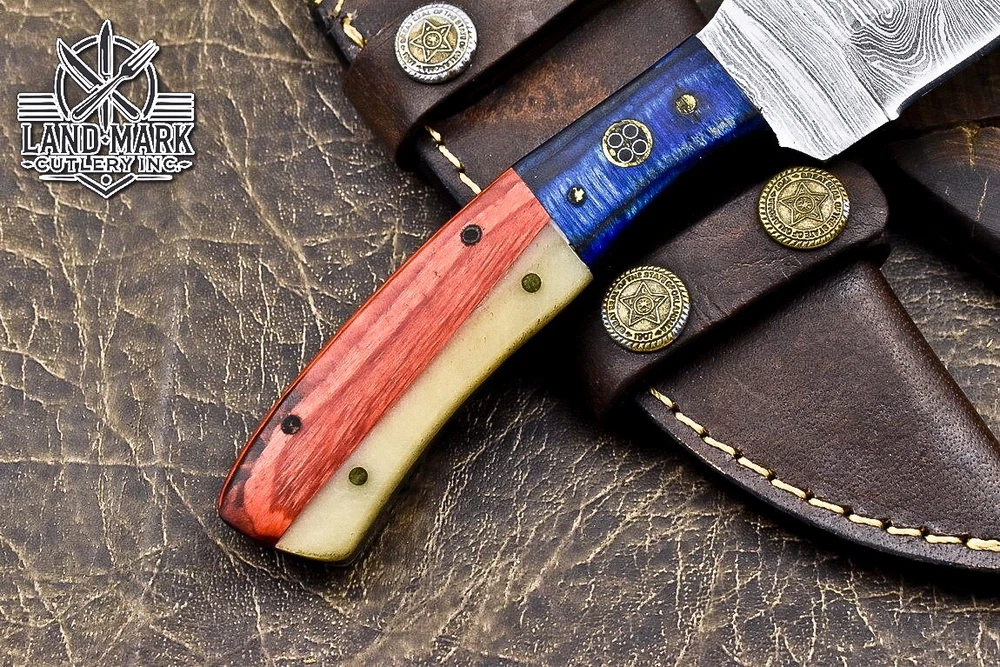 Custom Hand Made DAMASCUS STEEL HUNTING KNIFE WITH USA FLAG HANDLE We offer a shipping discount for More then one purchased . And discount will be apply on combine invoice, Discount will not apply on separate payment. ITEM DETAILS OVER ALL LENGTH 8.0 inches long (Approx) HANDLE LENGTH 4.0 inches long (Approx) BLADE LENGTH 4.0 inches long (Approx) BLADE HARDNESS 58-60 HRC Which Holds The Sharp Edge For Long Time. HANDLE WOOD AND BONE COVER LEATHER SHEATH This Awesome custom made KNIFE has a nice hand forged with the combination of 4340 & 1080 steel. HOW OUR DAMASCUS IS MADE: All our Damascus is real and not just an acid etch. Damascus is a mixture of 1080HC and 4340 nickel carbon. You heat them up together and then fold the bar over and over to get the desired layers, ours are 396 layers. Then you burn the blade in acid, and it turns the nickel satin color and the high carbon turns blackish gray. This is how the layers are exposed to show the layers of the new steel created coined "Damascus". All Damascus is acid etched to show the layers. If you high polish the metal it will be shinny satin like all steels. Only after you burn the sides of the blade with acid do you see the layers of the two steels. Makes sense? After we make our knives we high polish the handles and put an edge on the blade. The high polishing buffs off the acid burned layer of the handle, and the blade edge is sharpened and the acid burned edge becomes satin. You can re-burn the tang of the blade near the handles and the edge of the blade and it will show the layers once more. All our knives are hand made, durable and unique ***** YOU WILL RECEIVED THE SAME KNIFE Qality Standards Our Damascus blades are made from high quality non-stainless steels which rival or exceed any Damascus blade made from the 10 series with 4340. Our Damascus combination has taken years to perfect and has been tested under a variety of application which will offer professional performance in categories of toughness, strength (lateral stress) and edge honing and holding ability. In a 5 spot Rockwell test our blades will average near or close to 58 which offers a perfect balances between its toughness and strength.Our blades due to carbon content need to be regularly treated with wax and/or 3 in 1 oil to maintain its superior quality. Questions if you have any question feel free to send us message we aim to answer all questions within 24 hours Feedback If you are not satisfied with our service please contact us before leaving any negative or natural feedback. We will resolve all issues as quickly as possible. Disclaimer We are not responsible for any injuries associated with the use of our tools. Our products are intended for legal use only by responsible buyers. Therefore, we will not sell our products to anyone under the age of 18. Before bidding please check your country laws as some countries Custom don't allow this. If your purchase is held by Custom Authorities in your country/State we will not be responsible for that and no refund will be issued Shipping We offer a 20% shipping discount for More then one purchased . And discount will be apply on combine invoice, Discount will not apply on separate payment We ship within 24 hours after receiving complete payment but this can be delayed due to week ends or Governments and Religious Festivals . . This is beyond our control and we apologize for this inconvenience. Precautions Our Tools are very sharp so open and use them very carefully We are not responsible for any injuries associated with the use of our tools Tips to Care knife 1. NEVER STORE YOUR KNIFE FOR LONG TIME IN LEATHER SHEATH. 2. LEATHER CAN ABSORB WATER, WHICH WILL RUST THE KNIFE. 3. ALWAYS CLEAN THE BLADE AFTER USING WITH OIL OR WAX