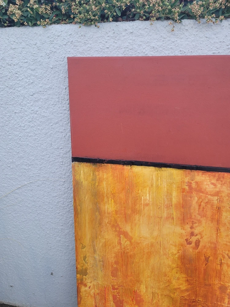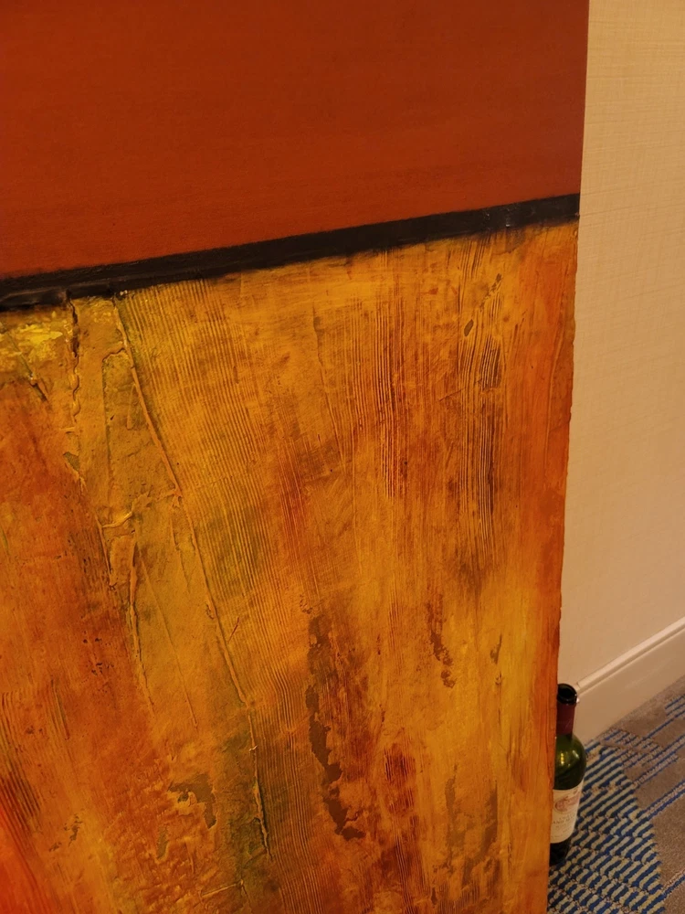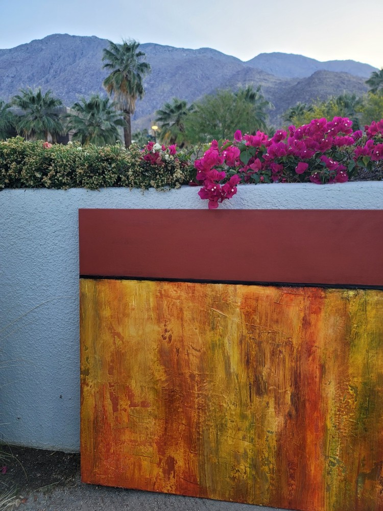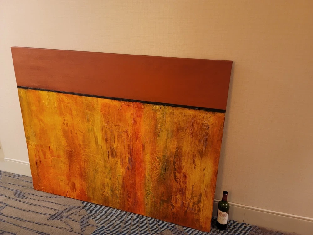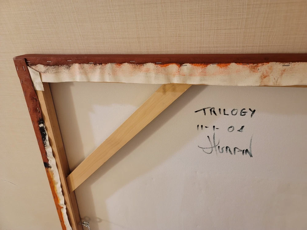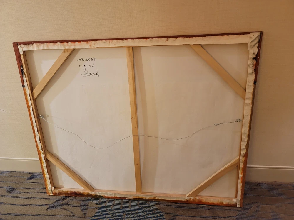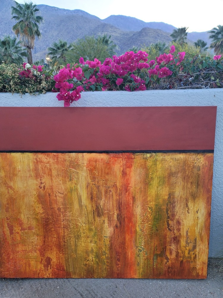 This very large absolutely stunning original abstract modern oil on canvas painting signed and dated 11/1/04 is our latest discovery from Palm Springs and belongs in your home, not ours. We just don't have room for any more large paintings. LOL. If orange is your color, you will be in hog heaven. And even if you never thought of orange before, this one will be the one to convince you to make the transition and let this be your piece de resistance in your Manhattan Penthouse, Malibu Estate, or Desert Retreat. Aptly names "TRILIGY," you will savor the three distinct layers of color and style as you move from top to bottom. The painting measures about 56 x 44 inches and is ready to hang on your wall. You will note in the photos a few very small areas where the paint has chipped around the edges. You can touch them up or just enjoy the vintage patina they add to the piece. Reasonable offers accepted, especially if you can do a local pickup in LA or Palm Springs. The wine bottle is included in the photographs to show the very large proportions of the painting, and the wine also comes highly recommended! We included photos of this significant original period piece in its "natural Palm Springs habitat" to highlight how very special it is!