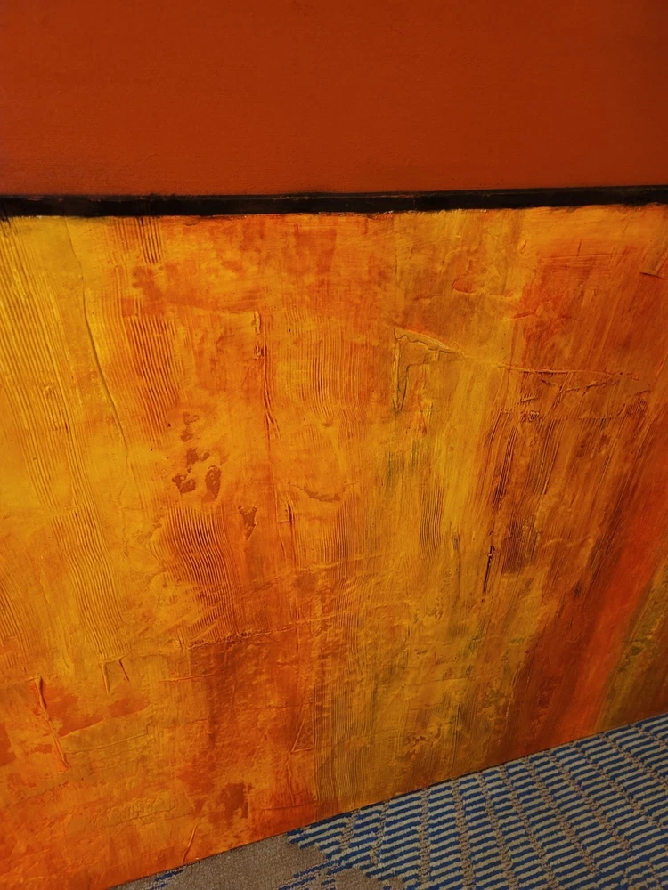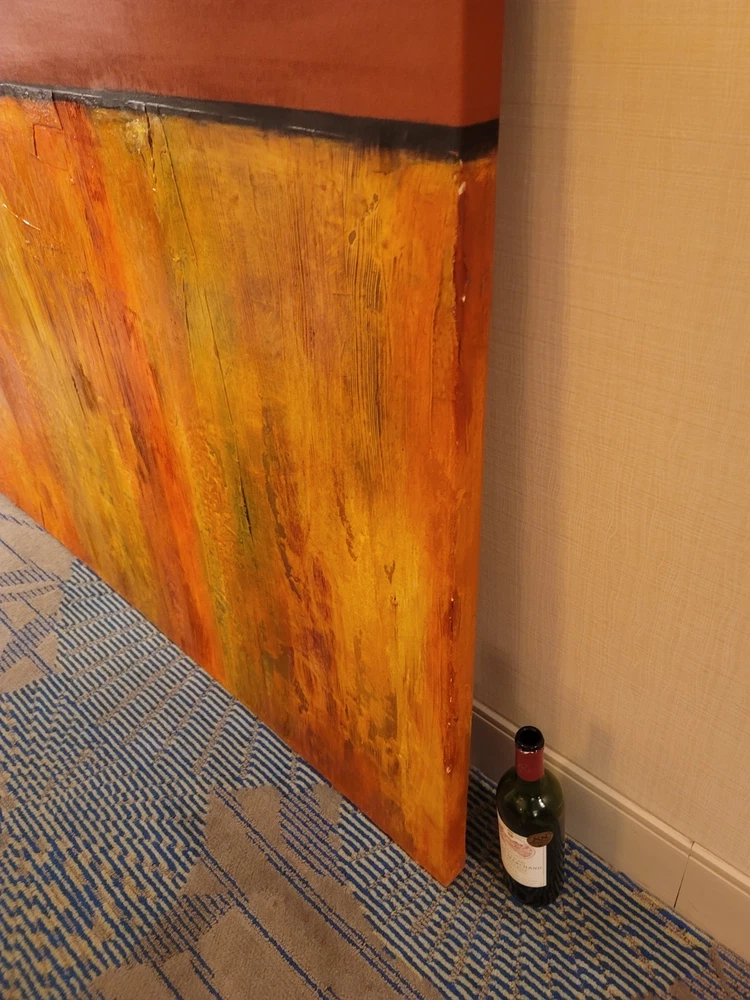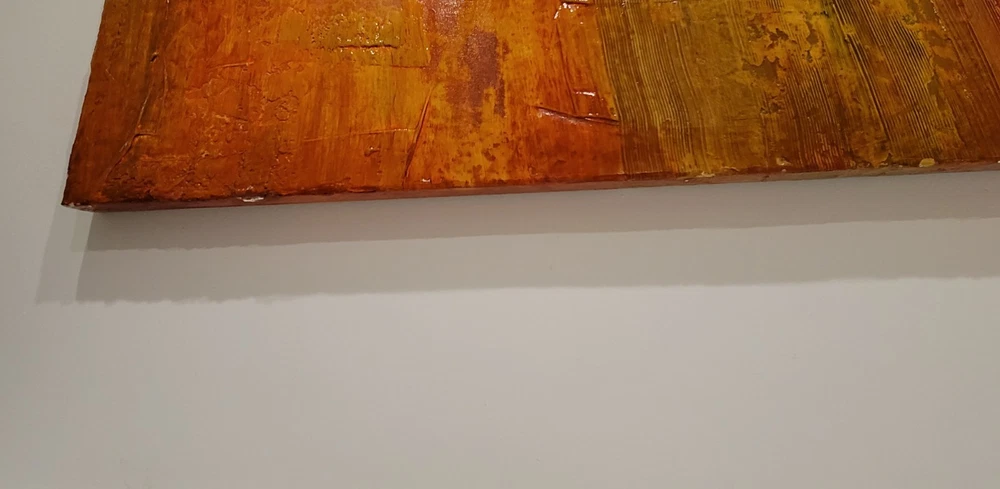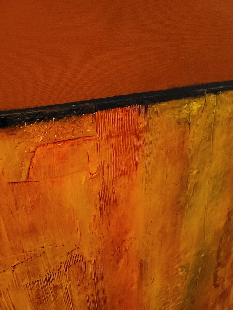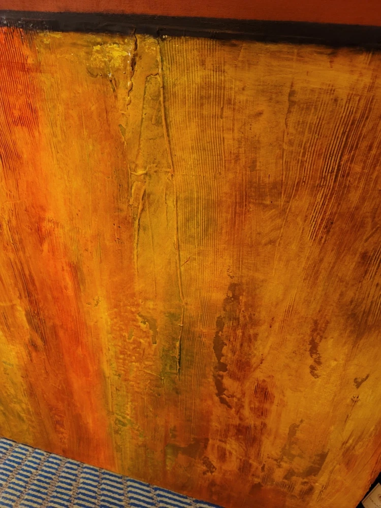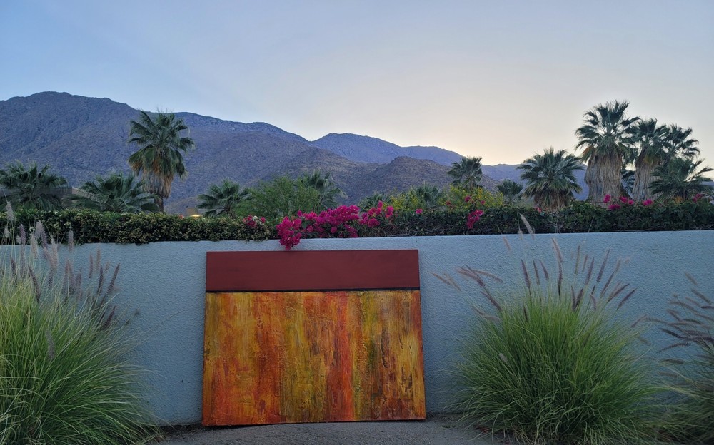This very large absolutely stunning original abstract modern oil on canvas painting signed and dated 11/1/04 is our latest discovery from Palm Springs and belongs in your home, not ours. We just don't have room for any more large paintings. LOL. If orange is your color, you will be in hog heaven. And even if you never thought of orange before, this one will be the one to convince you to make the transition and let this be your piece de resistance in your Manhattan Penthouse, Malibu Estate, or Desert Retreat. Aptly names "TRILIGY," you will savor the three distinct layers of color and style as you move from top to bottom. The painting measures about 56 x 44 inches and is ready to hang on your wall. You will note in the photos a few very small areas where the paint has chipped around the edges. You can touch them up or just enjoy the vintage patina they add to the piece. Reasonable offers accepted, especially if you can do a local pickup in LA or Palm Springs. The wine bottle is included in the photographs to show the very large proportions of the painting, and the wine also comes highly recommended! We included photos of this significant original period piece in its "natural Palm Springs habitat" to highlight how very special it is!
