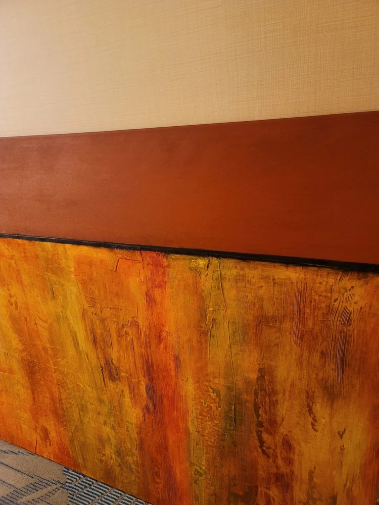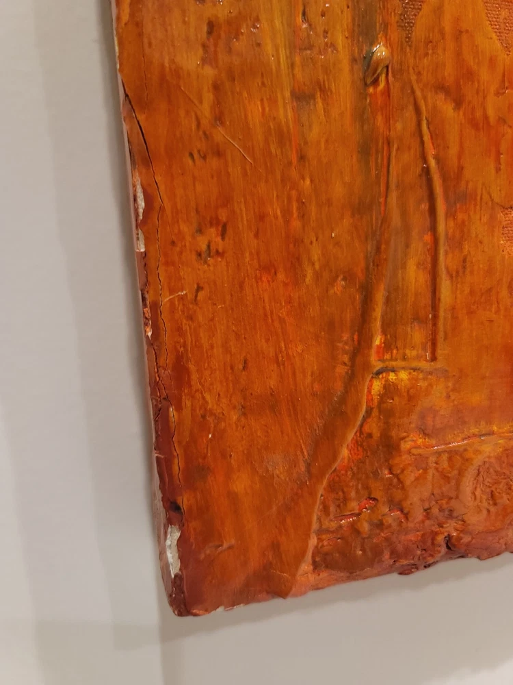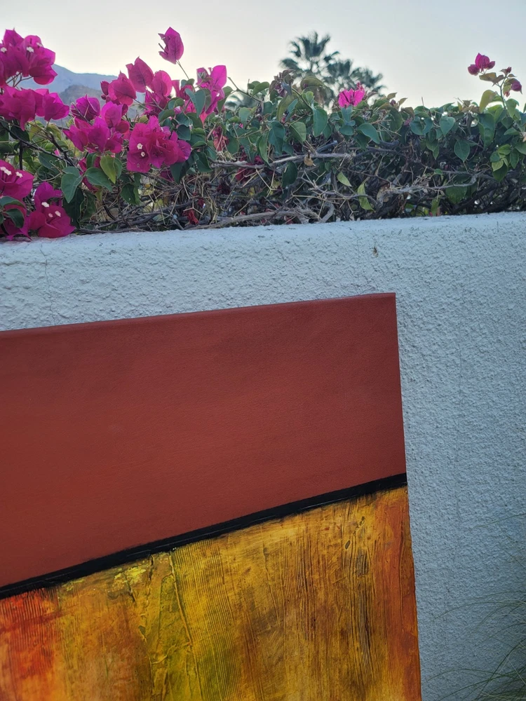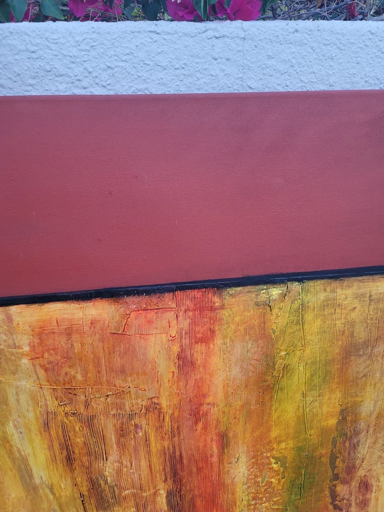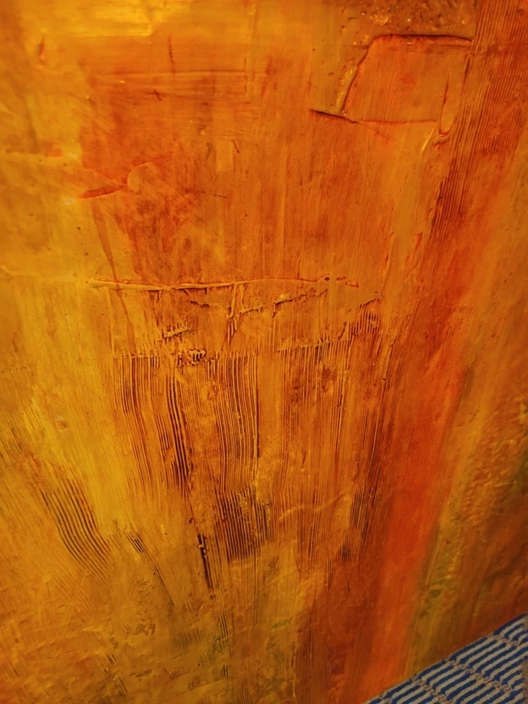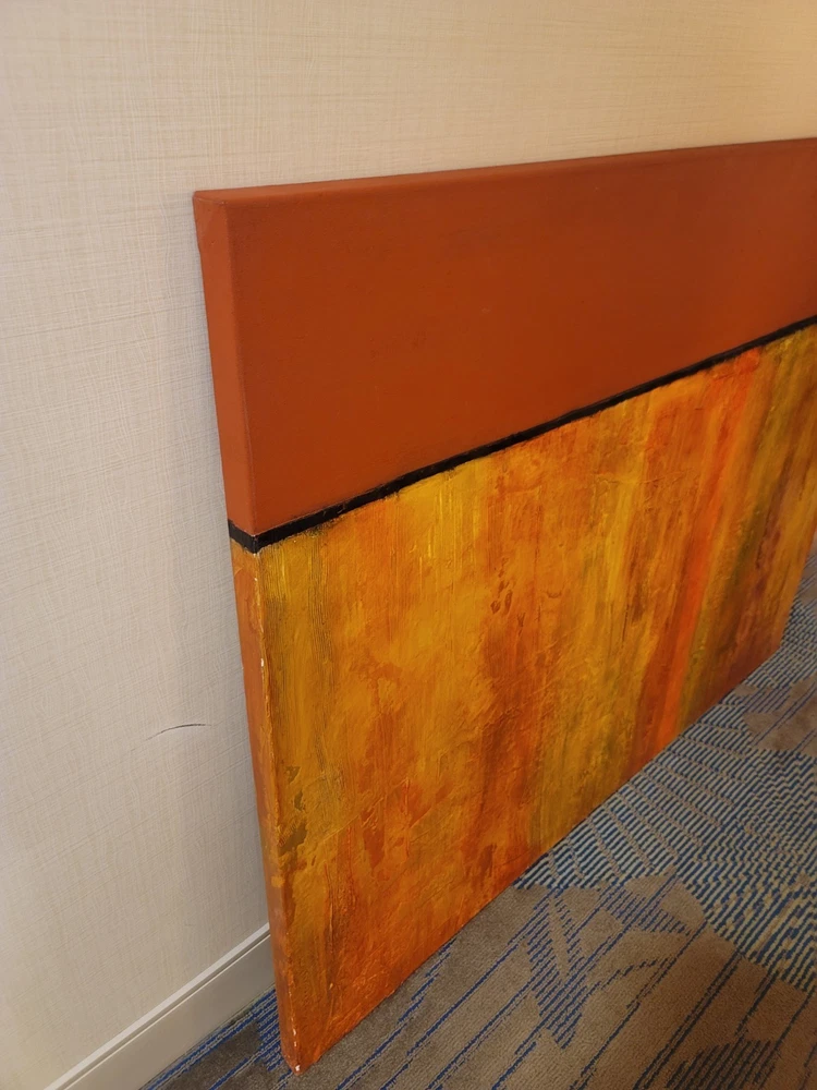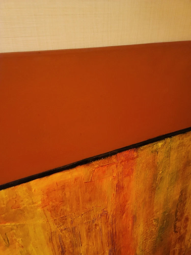 This very large absolutely stunning original abstract modern oil on canvas painting signed and dated 11/1/04 is our latest discovery from Palm Springs and belongs in your home, not ours. We just don't have room for any more large paintings. LOL. If orange is your color, you will be in hog heaven. And even if you never thought of orange before, this one will be the one to convince you to make the transition and let this be your piece de resistance in your Manhattan Penthouse, Malibu Estate, or Desert Retreat. Aptly names "TRILIGY," you will savor the three distinct layers of color and style as you move from top to bottom. The painting measures about 56 x 44 inches and is ready to hang on your wall. You will note in the photos a few very small areas where the paint has chipped around the edges. You can touch them up or just enjoy the vintage patina they add to the piece. Reasonable offers accepted, especially if you can do a local pickup in LA or Palm Springs. The wine bottle is included in the photographs to show the very large proportions of the painting, and the wine also comes highly recommended! We included photos of this significant original period piece in its "natural Palm Springs habitat" to highlight how very special it is!