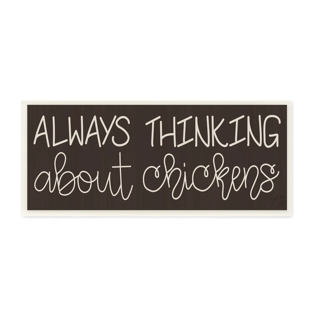 Proudly made in the USA, all of All of our wall plaques start off as high quality lithograph prints that are then mounted on durable 0.5 inch thick MDF wood. Each piece is hand finished and comes with a fresh layer of foil on the sides to give it a crisp clean look. It arrives ready to hang with no installation required, and comes with sturdy clear corners to keep it from damaging in transit.Features:Wall Art is Ready to Hang - No Installation or Hardware Needed. For Easy Set Up Lean or Layer Artwork on Shelf or Against Wall.All of our wall plaques start off as high quality lithograph prints that are then mounted on durable 0.5 inch thick MDF wood. Each piece is hand finished and comes with a fresh layer of foil on the sides to give it a crisp clean look. Made In USA.Artwork Ideal for any Free Shipping Over $49.99* Details Stupell Always Thinking About Chickens Phrase Minimal Farm Typography Wood Wall Product Description: Proudly made in the USA, all of All of our wall plaques start off as high quality lithograph prints that are then mounted on durable 0.5 inch thick MDF wood. Each piece is hand finished and comes with a fresh layer of foil on the sides to give it a crisp clean look. It arrives ready to hang with no installation required, and comes with sturdy clear corners to keep it from damaging in transit. Features: Wall Art is Ready to Hang - No Installation or Hardware Needed. For Easy Set Up Lean or Layer Artwork on Shelf or Against Wall. All of our wall plaques start off as high quality lithograph prints that are then mounted on durable 0.5 inch thick MDF wood. Each piece is hand finished and comes with a fresh layer of foil on the sides to give it a crisp clean look. Made In USA. Artwork Ideal for any Living Room, Den, Entryway, Bedroom, Office, Kitchen or Bathroom. Design by Stephanie Dicks