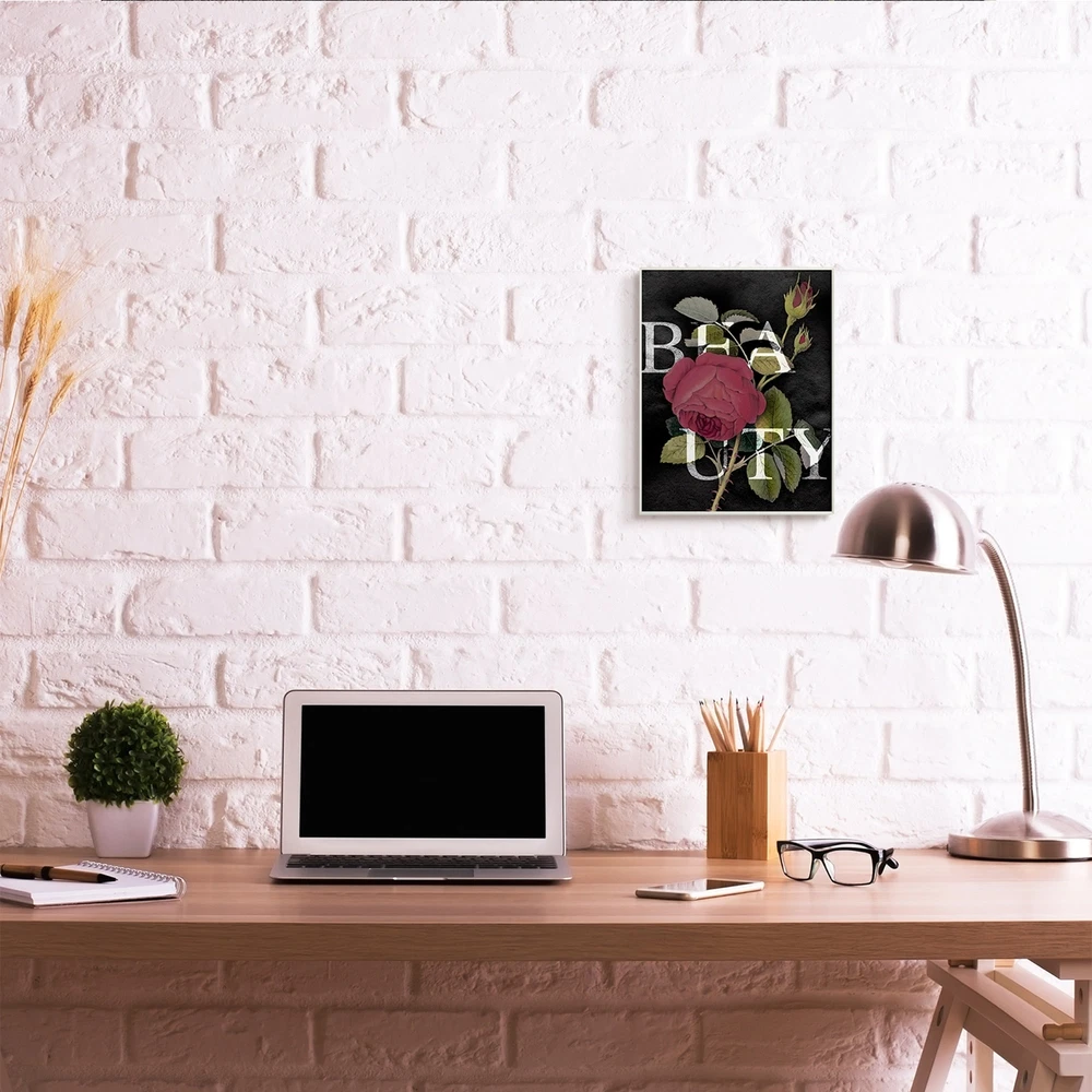 Proudly made in the USA, all of our wall plaques start off as high quality lithograph prints that are then mounted on durable MDF wood. Each piece is hand finished and comes with a fresh layer of foil on the sides to give it a crisp clean look. It arrives ready to hang with no installation required, and comes with sturdy clear corners to keep it from damaging in transit.Features:Wall Art is Ready to Hang - No Installation or Hardware Needed. For Easy Set Up Lean or Layer Artwork on Shelf or Against Wall.All of our wall plaques start off as high quality lithograph prints that are then mounted on durable 0.5 inch thick MDF wood. Each piece is hand finished and comes with a fresh layer of foil on the sides to give it a crisp clean look. Made In USA.Artwork Ideal for any Living Room, Den, Free Shipping Over $49.99* Details Stupell Beauty Text over Vintage Red Thorned Rose Wood Wall Art Product Description: Proudly made in the USA, all of our wall plaques start off as high quality lithograph prints that are then mounted on durable MDF wood. Each piece is hand finished and comes with a fresh layer of foil on the sides to give it a crisp clean look. It arrives ready to hang with no installation required, and comes with sturdy clear corners to keep it from damaging in transit. Features: Wall Art is Ready to Hang - No Installation or Hardware Needed. For Easy Set Up Lean or Layer Artwork on Shelf or Against Wall. All of our wall plaques start off as high quality lithograph prints that are then mounted on durable 0.5 inch thick MDF wood. Each piece is hand finished and comes with a fresh layer of foil on the sides to give it a crisp clean look. Made In USA. Artwork Ideal for any Living Room, Den, Entryway, Bedroom, Office, Kitchen or Bathroom. Design by Daphne Polselli