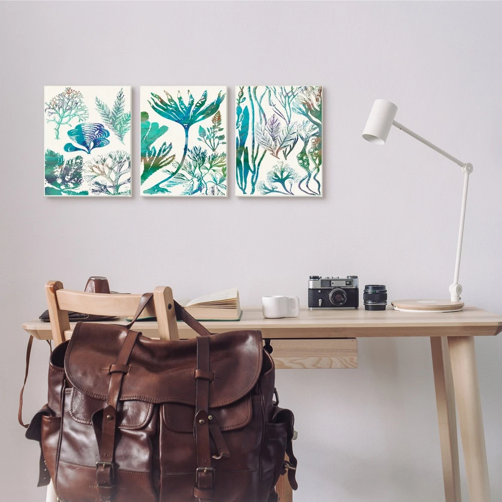 The more the better, right? Our multi piece wall art offerings are proudly made in the USA. All of our wall plaques start off as high quality lithograph prints that are then mounted on durable MDF wood. Each piece is hand finished and comes with a fresh layer of foil on the sides to give it a crisp clean look. It arrives ready to hang with no installation required, and comes with sturdy clear corners to keep it from damaging in transit.Features:Wall Art is Ready to Hang - No Installation or Hardware Needed. For Easy Set Up Lean or Layer Artwork on Shelf or Against Wall.All of our wall plaques start off as high quality lithograph prints that are then mounted on durable 0.5 inch thick MDF wood. Each piece is hand finished and comes with a fresh layer of foil on the sides to give it a crisp Free Shipping Over $49.99* Details Stupell Collage of Blue Sea Plants Ocean Floor Design, 3pc Multi Piece Wood Wall Product Description: The more the better, right? Our multi piece wall art offerings are proudly made in the USA. All of our wall plaques start off as high quality lithograph prints that are then mounted on durable MDF wood. Each piece is hand finished and comes with a fresh layer of foil on the sides to give it a crisp clean look. It arrives ready to hang with no installation required, and comes with sturdy clear corners to keep it from damaging in transit. Features: Wall Art is Ready to Hang - No Installation or Hardware Needed. For Easy Set Up Lean or Layer Artwork on Shelf or Against Wall. All of our wall plaques start off as high quality lithograph prints that are then mounted on durable 0.5 inch thick MDF wood. Each piece is hand finished and comes with a fresh layer of foil on the sides to give it a crisp clean look. Made In USA. Artwork Ideal for any Living Room, Den, Entryway, Bedroom, Office, Kitchen or Bathroom. Design by Sharon Chandler