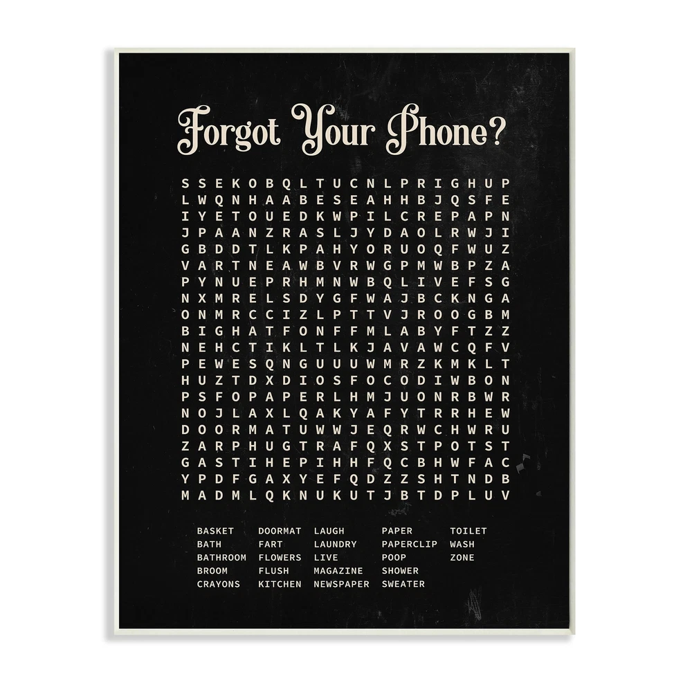 Proudly made in the USA, all of our wall plaques start off as high quality lithograph prints that are then mounted on durable MDF wood. Each piece is hand finished and comes with a fresh layer of foil on the sides to give it a crisp clean look. It arrives ready to hang with no installation required, and comes with sturdy clear corners to keep it from damaging in transit.Features:Wall Art is Ready to Hang - No Installation or Hardware Needed. For Easy Set Up Lean or Layer Artwork on Shelf or Against Wall.All of our wall plaques start off as high quality lithograph prints that are then mounted on durable 0.5 inch thick MDF wood. Each piece is hand finished and comes with a fresh layer of foil on the sides to give it a crisp clean look. Made In USA.Artwork Ideal for any Living Room, Den, Free Shipping Over $49.99* Details Stupell Forgot Your Phone Crossword Activity Distressed Black Wood Wall Art Product Description: Proudly made in the USA, all of our wall plaques start off as high quality lithograph prints that are then mounted on durable MDF wood. Each piece is hand finished and comes with a fresh layer of foil on the sides to give it a crisp clean look. It arrives ready to hang with no installation required, and comes with sturdy clear corners to keep it from damaging in transit. Features: Wall Art is Ready to Hang - No Installation or Hardware Needed. For Easy Set Up Lean or Layer Artwork on Shelf or Against Wall. All of our wall plaques start off as high quality lithograph prints that are then mounted on durable 0.5 inch thick MDF wood. Each piece is hand finished and comes with a fresh layer of foil on the sides to give it a crisp clean look. Made In USA. Artwork Ideal for any Living Room, Den, Entryway, Bedroom, Office, Kitchen or Bathroom. Design by Lettered and Lined