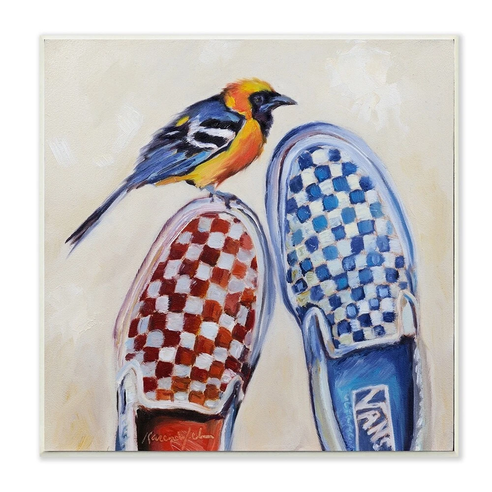Proudly made in the USA, all of our wall plaques start off as high quality lithograph prints that are then mounted on durable MDF wood. Each piece is hand finished and comes with a fresh layer of foil on the sides to give it a crisp clean look. It arrives ready to hang with no installation required, and comes with sturdy clear corners to keep it from damaging in transit.Features:Wall Art is Ready to Hang - No Installation or Hardware Needed. For Easy Set Up Lean or Layer Artwork on Shelf or Against Wall.All of our wall plaques start off as high quality lithograph prints that are then mounted on durable 0.5 inch thick MDF wood. Each piece is hand finished and comes with a fresh layer of foil on the sides to give it a crisp clean look. Made In USA.Artwork Ideal for any Living Room, Den, Free Shipping Over $49.99* Details Stupell Oriole Bird on Vintage Checkered Sneakers Painting Wood Wall Art, 12 x Product Description: Proudly made in the USA, all of our wall plaques start off as high quality lithograph prints that are then mounted on durable MDF wood. Each piece is hand finished and comes with a fresh layer of foil on the sides to give it a crisp clean look. It arrives ready to hang with no installation required, and comes with sturdy clear corners to keep it from damaging in transit. Features: Wall Art is Ready to Hang - No Installation or Hardware Needed. For Easy Set Up Lean or Layer Artwork on Shelf or Against Wall. All of our wall plaques start off as high quality lithograph prints that are then mounted on durable 0.5 inch thick MDF wood. Each piece is hand finished and comes with a fresh layer of foil on the sides to give it a crisp clean look. Made In USA. Artwork Ideal for any Living Room, Den, Entryway, Bedroom, Office, Kitchen or Bathroom. Design by Karen Weber Fine Art
