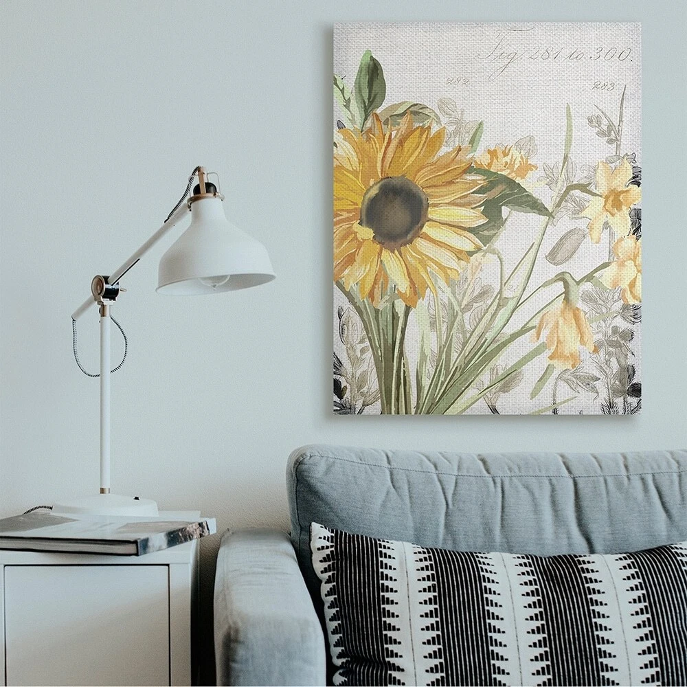 Proudly made in the USA, our stretched canvas is created with only the highest standards. We print with high quality inks and canvas, and then hand cut and stretch it over a 1.5 inch thick wooden frame. The art comes ready to hang with no installation required.Features:Wall Art is Ready to Hang - No Installation or Hardware Needed. For Easy Set Up Lean or Layer Artwork on Shelf or Against Wall.Our stretched canvas is created with the highest standards. We use only the highest quality inks and canvas on our in house Mimaki printers, and then hand cut and stretch each piece over a 1.5 inch thick wooden frame for hanging. Made In USA.Artwork Ideal for any Living Room, Den, Entryway, Bedroom, Office, Kitchen or Bathroom.Design by Kim Allen Free Shipping Over $49.99* Details Stupell Soft Sunflower Floral over Vintage Plant Illustration Canvas Wall Art Product Description: Proudly made in the USA, our stretched canvas is created with only the highest standards. We print with high quality inks and canvas, and then hand cut and stretch it over a 1.5 inch thick wooden frame. The art comes ready to hang with no installation required. Features: Wall Art is Ready to Hang - No Installation or Hardware Needed. For Easy Set Up Lean or Layer Artwork on Shelf or Against Wall. Our stretched canvas is created with the highest standards. We use only the highest quality inks and canvas on our in house Mimaki printers, and then hand cut and stretch each piece over a 1.5 inch thick wooden frame for hanging. Made In USA. Artwork Ideal for any Living Room, Den, Entryway, Bedroom, Office, Kitchen or Bathroom. Design by Kim Allen
