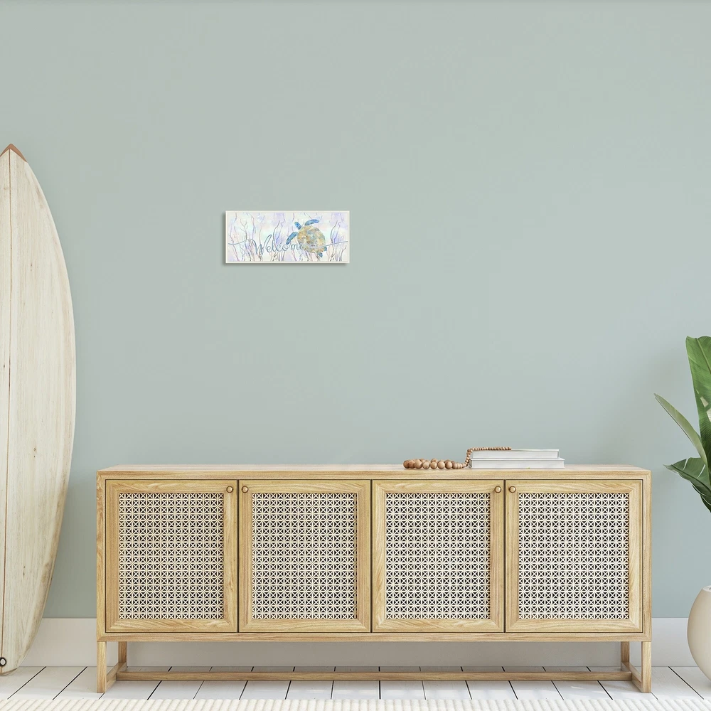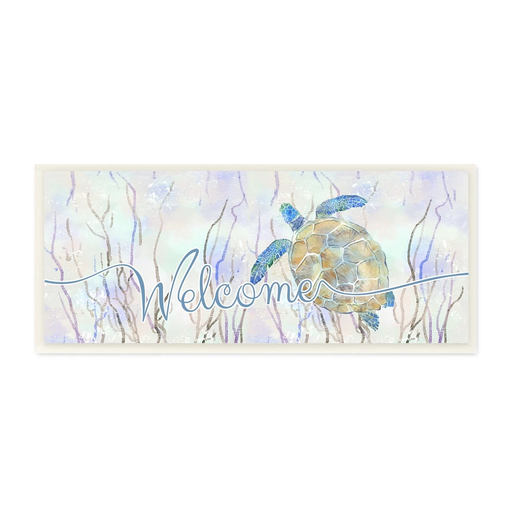 Proudly made in the USA, all of All of our wall plaques start off as high quality lithograph prints that are then mounted on durable 0.5 inch thick MDF wood. Each piece is hand finished and comes with a fresh layer of foil on the sides to give it a crisp clean look. It arrives ready to hang with no installation required, and comes with sturdy clear corners to keep it from damaging in transit.Features:Wall Art is Ready to Hang - No Installation or Hardware Needed. For Easy Set Up Lean or Layer Artwork on Shelf or Against Wall.All of our wall plaques start off as high quality lithograph prints that are then mounted on durable 0.5 inch thick MDF wood. Each piece is hand finished and comes with a fresh layer of foil on the sides to give it a crisp clean look. Made In USA.Artwork Ideal for any Free Shipping Over $49.99* Details Stupell Welcome Greeting Blue Tropical Sea Tortoise Waters Wood Wall Art, 17 x Product Description: Proudly made in the USA, all of All of our wall plaques start off as high quality lithograph prints that are then mounted on durable 0.5 inch thick MDF wood. Each piece is hand finished and comes with a fresh layer of foil on the sides to give it a crisp clean look. It arrives ready to hang with no installation required, and comes with sturdy clear corners to keep it from damaging in transit. Features: Wall Art is Ready to Hang - No Installation or Hardware Needed. For Easy Set Up Lean or Layer Artwork on Shelf or Against Wall. All of our wall plaques start off as high quality lithograph prints that are then mounted on durable 0.5 inch thick MDF wood. Each piece is hand finished and comes with a fresh layer of foil on the sides to give it a crisp clean look. Made In USA. Artwork Ideal for any Living Room, Den, Entryway, Bedroom, Office, Kitchen or Bathroom. Design by Ziwei Li