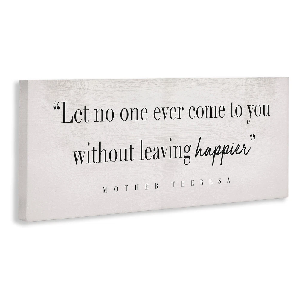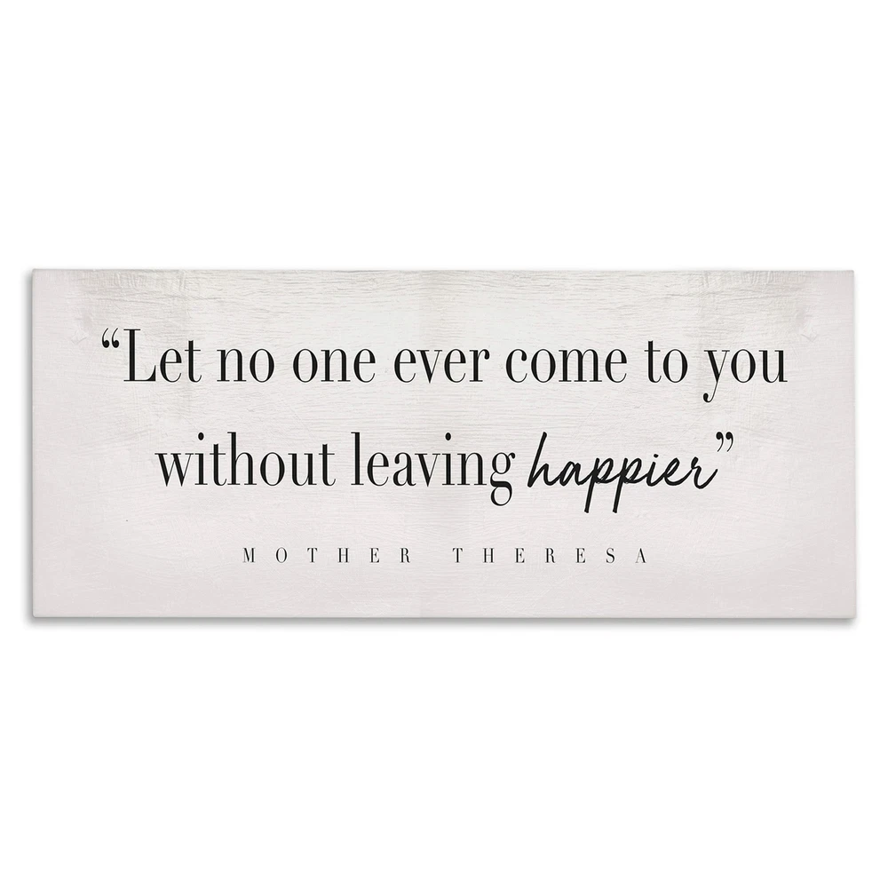 Proudly made in the USA, our stretched canvas is created with only the highest standards. We print with high quality inks and canvas, and then hand cut and stretch it over a 1.5 inch thick wooden frame. The art comes ready to hang with no installation required.Features:Wall Art is Ready to Hang - No Installation or Hardware Needed. For Easy Set Up Lean or Layer Artwork on Shelf or Against Wall.Our stretched canvas is created with the highest standards. We use only the highest quality inks and canvas on our in house Mimaki printers, and then hand cut and stretch each piece over a 1.5 inch thick wooden frame for hanging. Made In USA.Artwork Ideal for any Living Room, Den, Entryway, Bedroom, Office, Kitchen or Bathroom.Design by Daphne Polselli Free Shipping Over $49.99* Details Stupell Without Leaving Happier Phrase Mother Theresa Quote Canvas Wall Art Product Description: Proudly made in the USA, our stretched canvas is created with only the highest standards. We print with high quality inks and canvas, and then hand cut and stretch it over a 1.5 inch thick wooden frame. The art comes ready to hang with no installation required. Features: Wall Art is Ready to Hang - No Installation or Hardware Needed. For Easy Set Up Lean or Layer Artwork on Shelf or Against Wall. Our stretched canvas is created with the highest standards. We use only the highest quality inks and canvas on our in house Mimaki printers, and then hand cut and stretch each piece over a 1.5 inch thick wooden frame for hanging. Made In USA. Artwork Ideal for any Living Room, Den, Entryway, Bedroom, Office, Kitchen or Bathroom. Design by Daphne Polselli