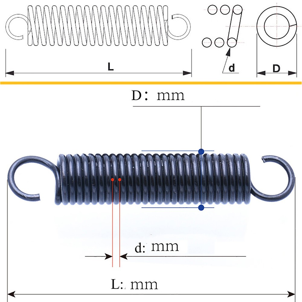 Extension Springs With Hook Spring Steel - Wire Dia 0.8mm x Out Dia. 6 7 8 10mm Product Description: ※ Model: Spring ※ Material: spring steel ※ Surface treatment: blackened/natural ※ Standard: GB ※ Size indication: 0.5*4*25 means that the line warp is 0.5mm, the outer diameter is 4mm, and the length is 25mm. ※ Shape: open hook ※ Wire Diameter: 0.3 0.4 0.6 0.8 1 1.2 1.5 2 2.5mm, etc. (optional, if not, please contact customer service to send the link) ※ Length (mm): optional ※ Reminder: The pictures are for reference only, and the actual product shall prevail.