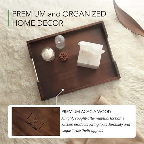 30 Days Return Policy Fast Delivery Trusted seller Acacia Wooden Serving Tray with Metal Handles 16.8 x 12.8 inch Ottoman Tray for Living Room Coffee Table Large Wood Decorative Tray Color Brown Product Description Premium Ottoman Tray for Living Room: Made from natural acacia wood, no MDF or synthetic material, this ottoman tray combines durability and style Its smooth texture and rich tones make it a fine fit for any living room or coffee table decor Handcrafted Wooden Tray: Expertly crafted with polished edges and mortise and tenon joints for lasting durability; Protective bottom pads ensure scratchless furniture surfaces Sleek and Functional Serving Tray: At 16.8 x 12.8 inches, this serving tray features metal handles for easy carrying; Its rich wood grain texture creates a harmonious aesthetic, making it a thoughtful and practical contribution for any occasion Versatile Tray for Every Need: From home decor and organizing various spaces in your living room, bedroom, or kitchen, to serving as a coffee table, food, dinner, or ottoman tray, even for surprising a loved one with breakfast in bed Joyful and Elegant: With rich wood tones and craftsmanship, this serving tray adds warmth to your table, ottoman, or coffee table settings Shipping Returns Payment Shipping Shipping is FREE to all addresses other than APO/PO boxes in the lower 48 states. All our stock ships from US-based warehouses. Shipped via USPS or UPS (depending on location and package weight) Unless stated otherwise, all orders will ship within 24-72 hours of your payment being processed. Check our feedback to see the great reviews of FAST shipping we offer. Returns As our valued customer, we will do our best to make sure the product you receive arrives to you on time and as expected. If you are not satisfied with your purchase, please contact us within 30 days of receiving your order to process a return. Payment We currently accept payment via eBay managed payments only. Once payment is cleared, we will dispatch your shipment within 1-3 business days. Please refer to the "Shipping" tab for more information regarding shipping speed to your destination.
