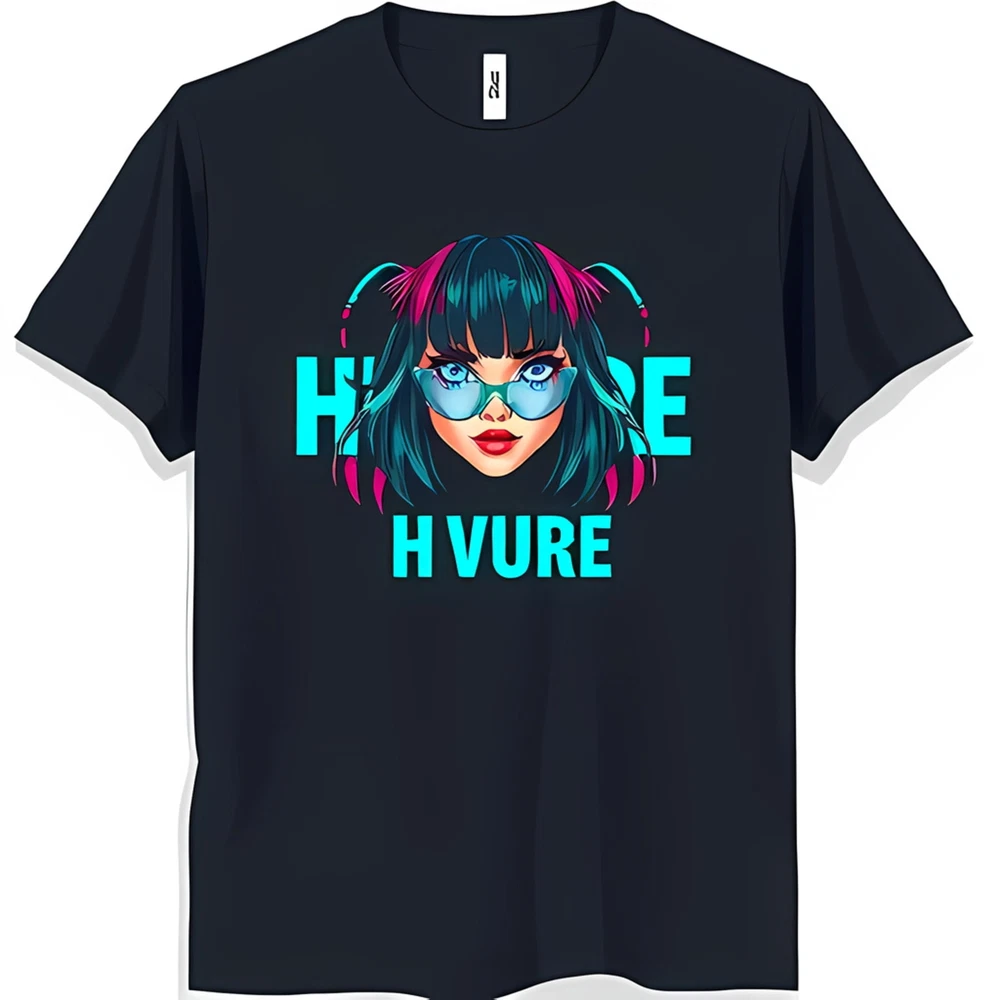Stylish Black T-Shirt with Blue Haired Woman in Sunglasses & 'H VURE' Print