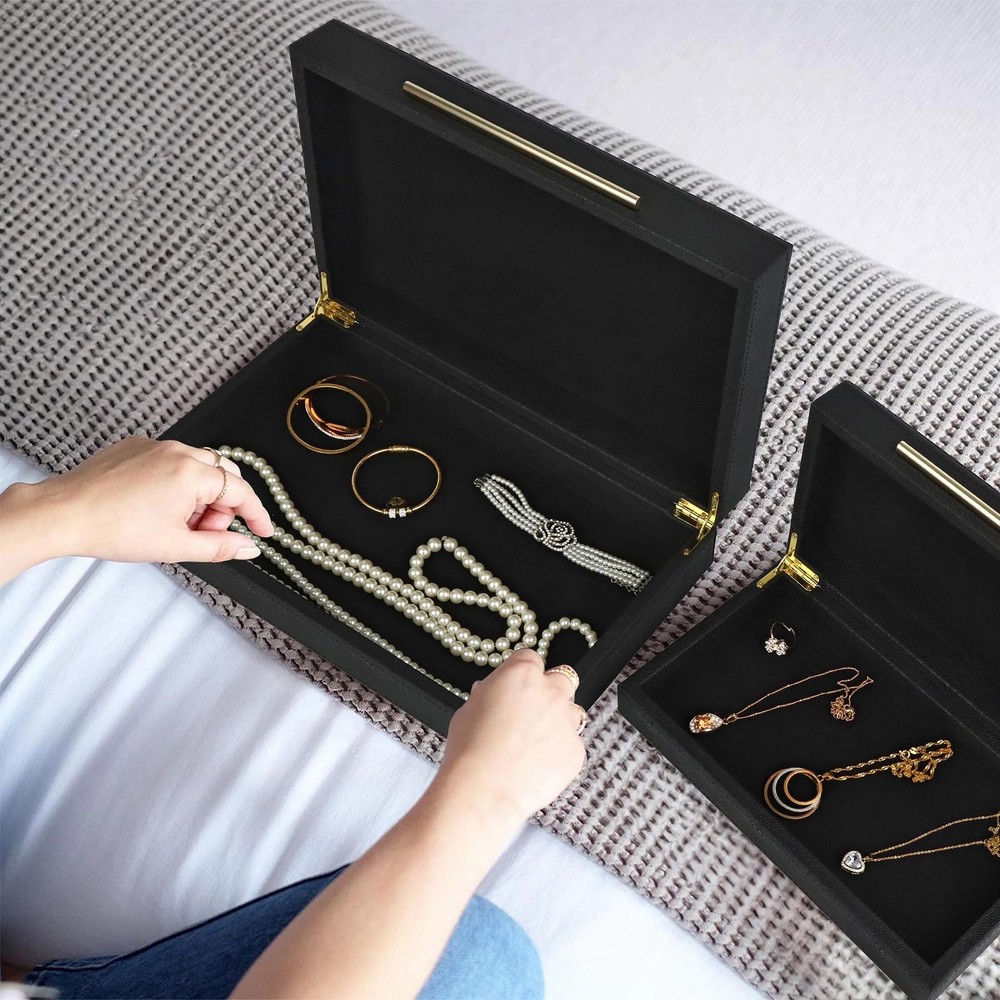 Love these nesting boxes—sleek faux leather with a sturdy wooden frame makes them both stylish and durable. Perfect for organizing jewelry, trinkets, or keepsakes, and the hinged lid keeps everything secure. The compartments help keep things tidy, and the neutral design fits any decor. Great value for a set of two!