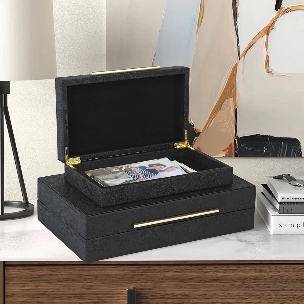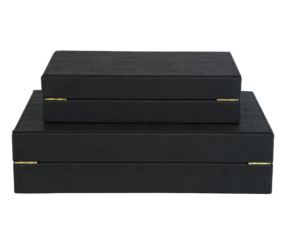 Introducing the Large Wooden Structure Keepsake Box - the perfect accessory organizer for your home or office! This decorative box features a sleek and modern design, made from high-quality faux leather with a sturdy wooden structure. The hinged lid provides easy access to your belongings, while the interior is spacious and organized with multiple compartments and dividers. Whether you're looking for a jewelry organizer, a storage box for small items, or a keepsake box for precious memories, the Large Wooden Structure Keepsake Box has got you covered. With its versatile design and sturdy construction, it's a must-have accessory for anyone who values style and functionality. Multi-purpose storage: Shagreen Faux Leather Decorative Box with wooden structure can store a wide range of items, making it great for organizing your home or office space. Large Capacity: the dimensions of the decorative storage box are S: 11x6.3x2.8 inches, l: 14.2x8.7x3.6 inches (L x W x H). Timeless design: The antique style storage box with lid boasts a classic and elegant look that will blend in with any decor, making it a stylish keepsake box that complements any environment. Allowing you to organize your items neatly and easily. The hinged lid provides easy access to your belongings while keeping them securely stored. Ample storage space: The large wooden box with hinged lid is spacious enough to store all your necessities, configurations, and personal items, without taking up too much space on your desk or shelf, providing ample space for storing various items such as jewelry, cosmetics, accessories, craft supplies, office supplies, and more. Premium Material: The storage box is made of faux leather, which not only looks elegant but also feels soft and comfortable to the touch. The sturdy wooden structure ensures the long-lasting use of the box while maintaining its functional and decorative purpose. A perfect gift: Surprise your loved ones with this stylish decorative box that is a perfect keepsake box for special moments and occasions, with the recipient cherishing it for years to come.