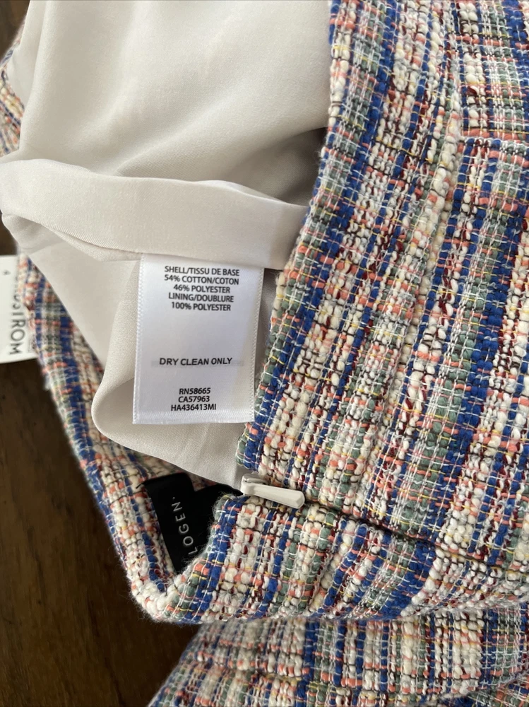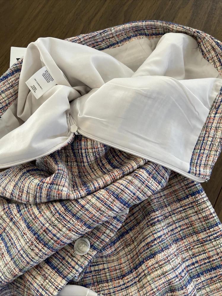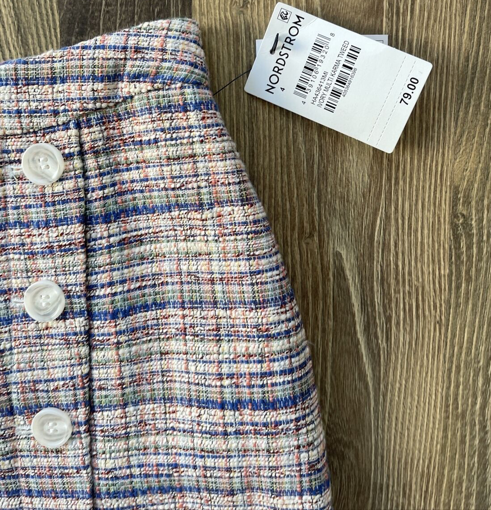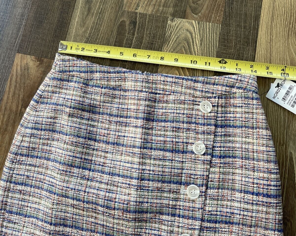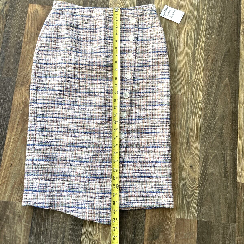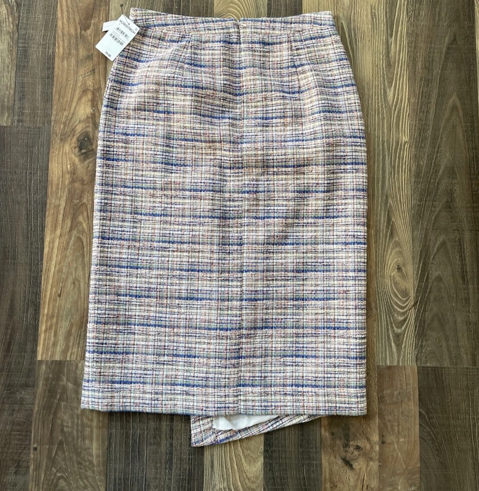 **Ivory Multi Karma Tweed Skirt by Halogen This Halogen pencil skirt is a stylish addition to any wardrobe. The skirt is made of tweed and features a plaid pattern in multicolor. It has a mid-rise waist and a button closure. The knee-length skirt has a straight and pencil style, with a faux wrap design that adds a touch of elegance. Ideal for formal occasions, business meetings, weddings, and parties, the skirt is lined and has a slit for added comfort. The skirt is a size 4 and is perfect for women who like to dress stylishly without compromising on comfort. Made in Indonesia, this skirt is a must-have for any fashion-conscious woman who wants to look and feel her best.