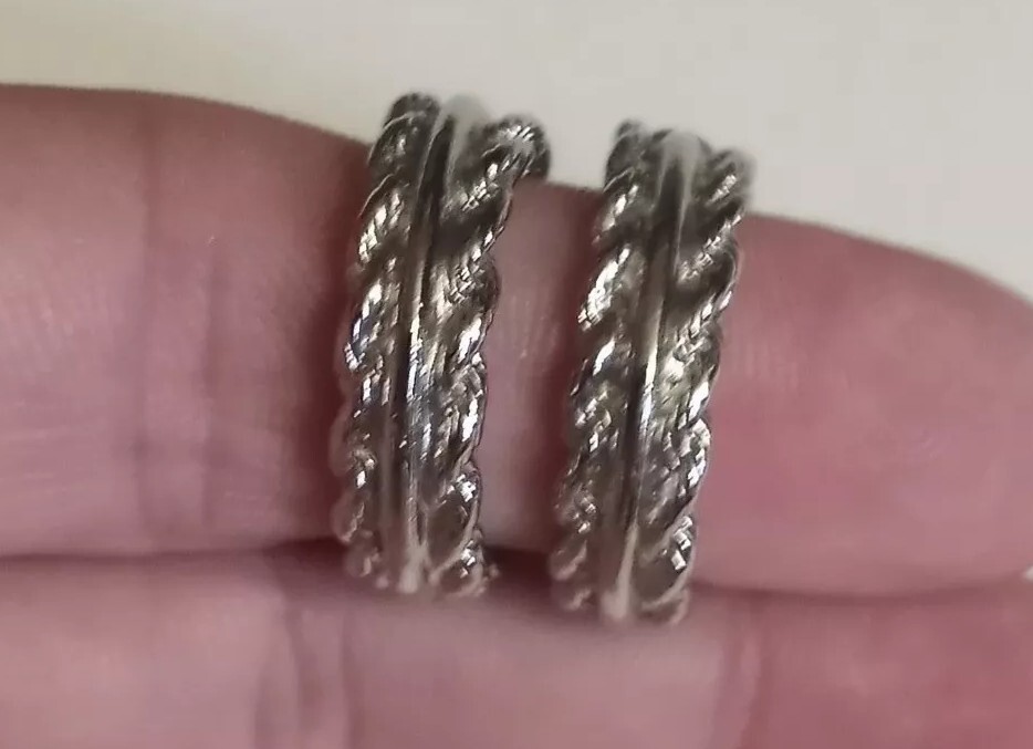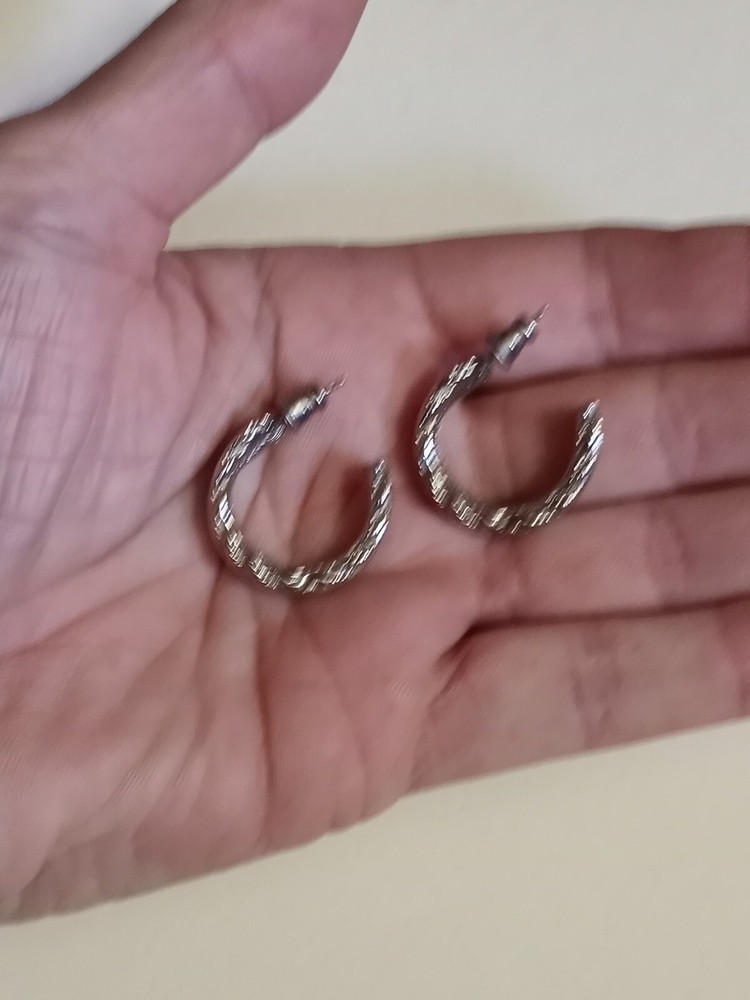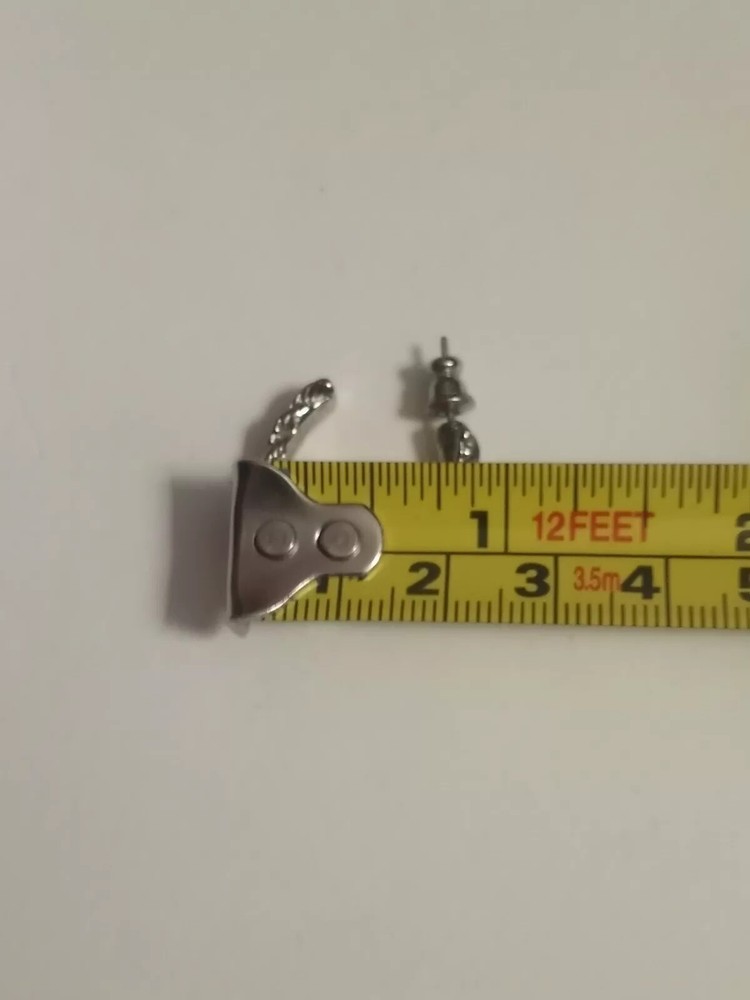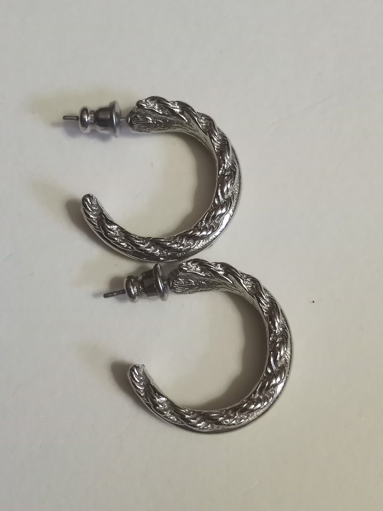 These Silvertone Double Twist Hoop Huggie Earrings are the perfect addition to any pierced ear collection. With a round shape and excellent cut grade, these earrings are sure to catch the eye. The butterfly closure ensures a secure fit while the 1" length makes them a great statement piece. The silver color and NS main stone creation add to the beauty of these earrings, which are perfect for any occasion. The earrings are made of a silvertone metal with an unknown material and metal purity. These earrings are a must-have for anyone who loves hoop earrings and wants to add a touch of elegance to their wardrobe. Please review all photos carefully!