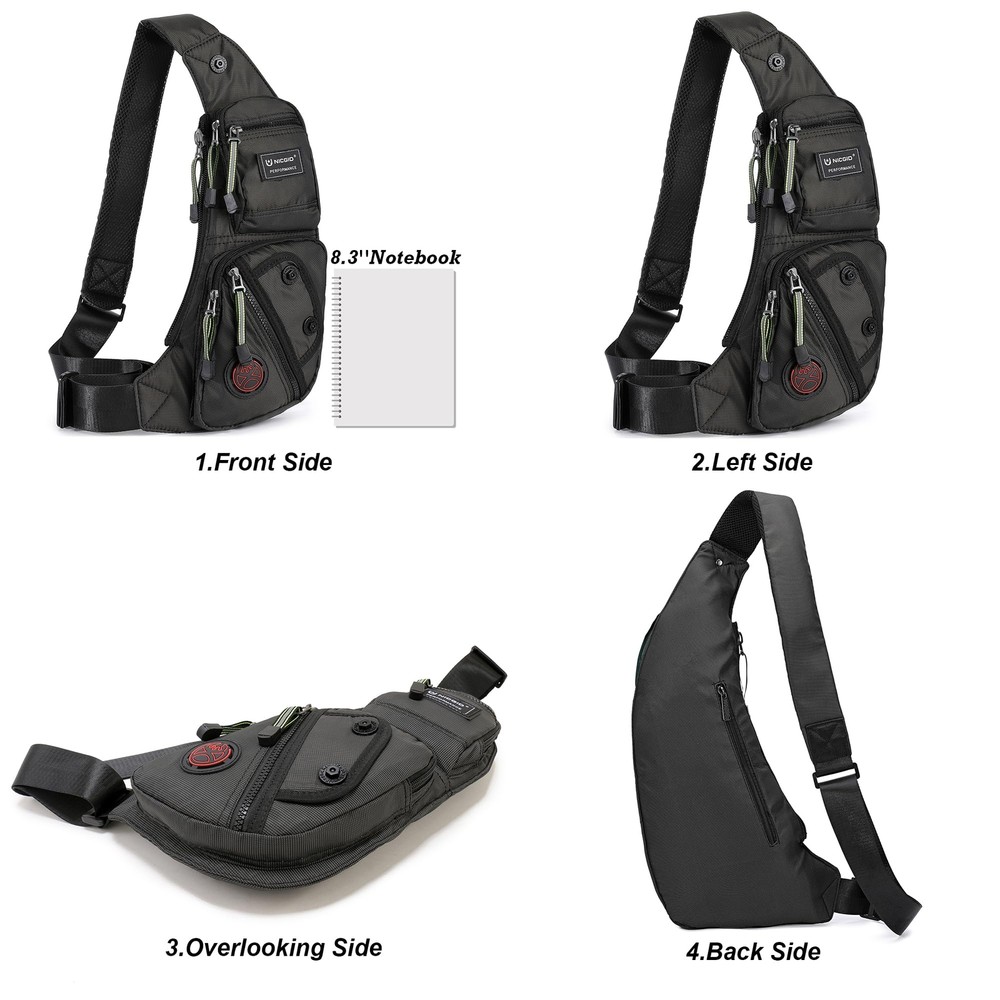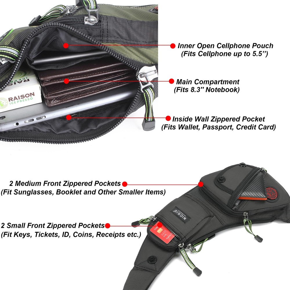 Material: This sling bag is well constructed of water-resistant nylon material. Lightweight, strong and sturdy. Not easy to be scratched. The size of it is bigger than a fanny pack, but not as big as a backpack. Unbalance Backpack Wearing Styles: It has great flexibility. You can use it both as chest pack and shoulder bag. Also it can be worn in the front or back of body. Multiple Storage Purpose Sling Bag: Large main compartment with inner open cellphone pouch is perfect for 8.3'' Tablet with cover, Small notebooks, Large cellphone. 4 front zippered pockets are great for various of small items. Sturdy: Good construction and strong and sturdy bag. Shoulder strap is adjustable to meet different requirements for both men and women. Also for plus size people. Versatile: It's for walking/traveling/biking/hiking/museums/theme parks and everyday using. Also it's a great gift for adult.