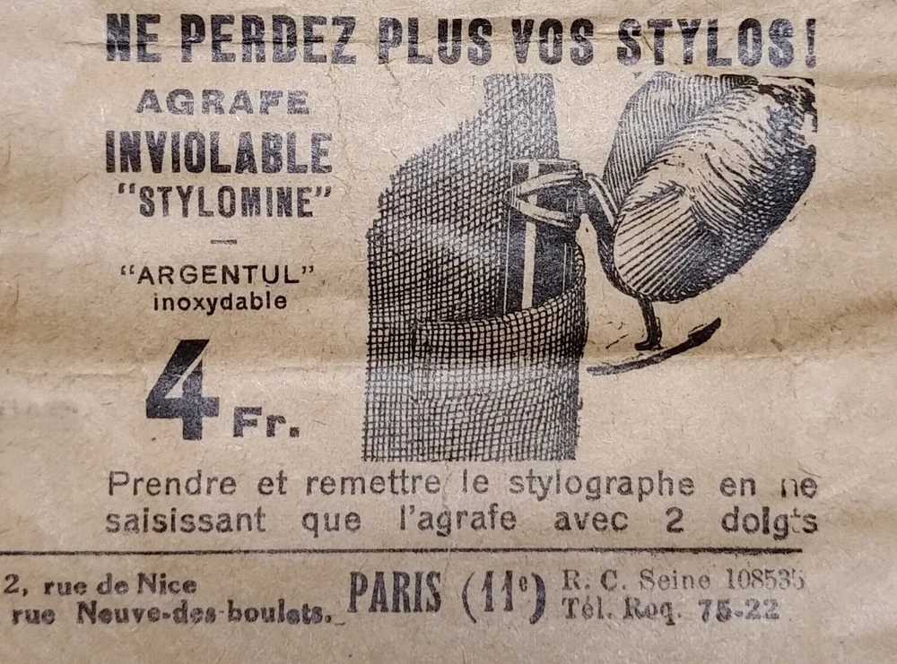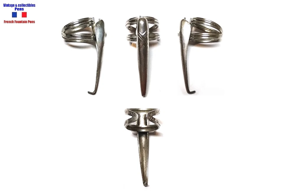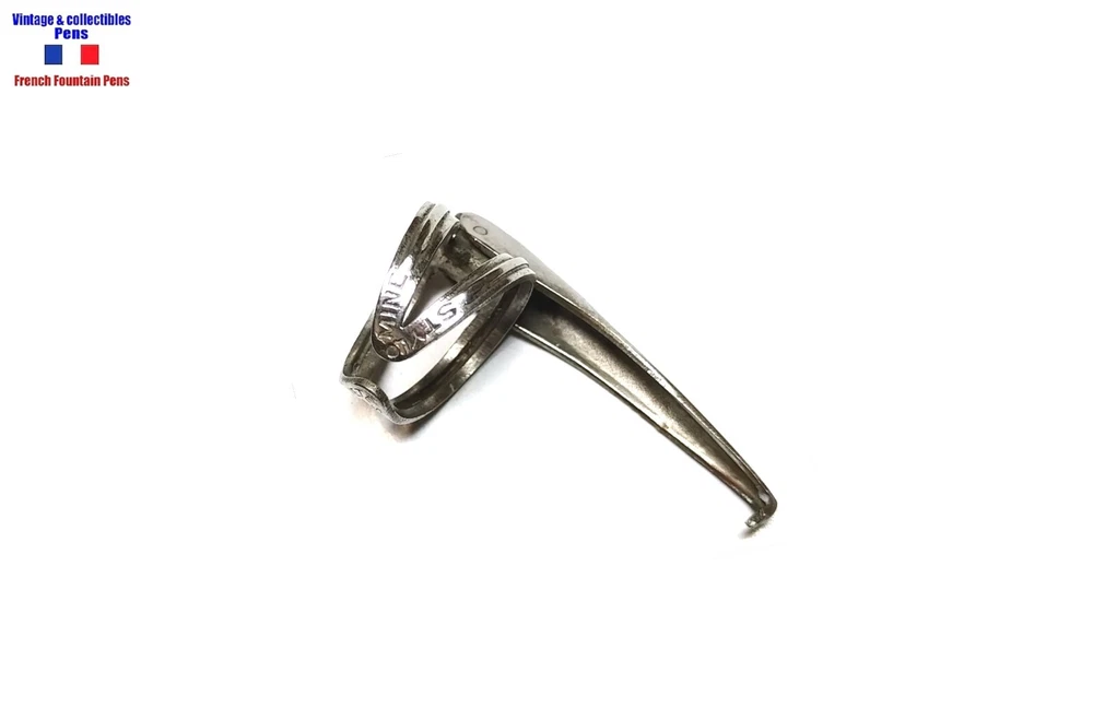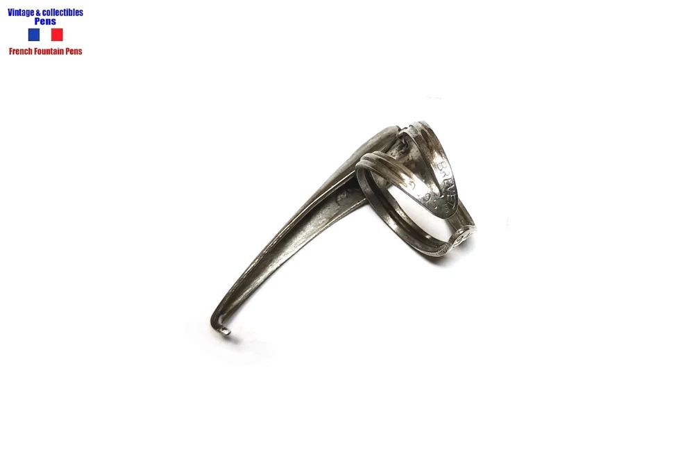 Accomodation clip patent Stylomine ca 1920, in “argentul” (silver plated stainless), x-shaped decoration, size 3 (12 mm), very beautiful condition for this age. Stylomine patent pin clip ca 1920, in “silver” (stainless silver plate), X-shaped decor, type 3 (12 mm). Very nice condition for this age.