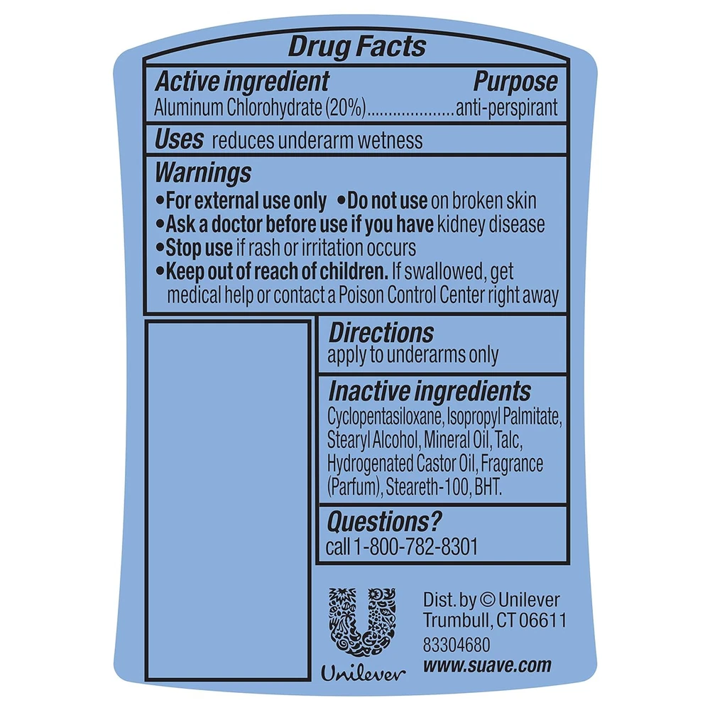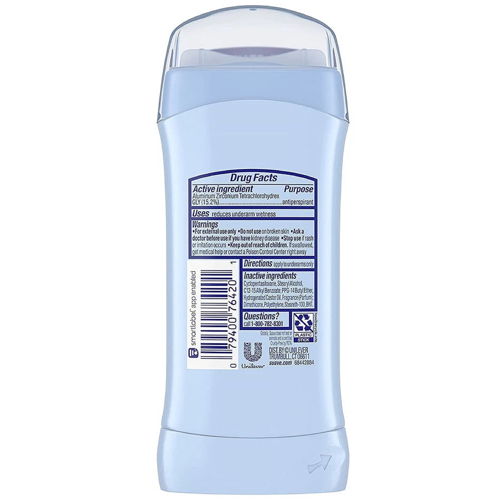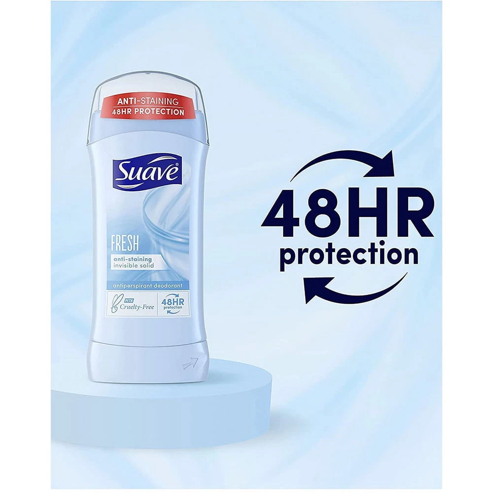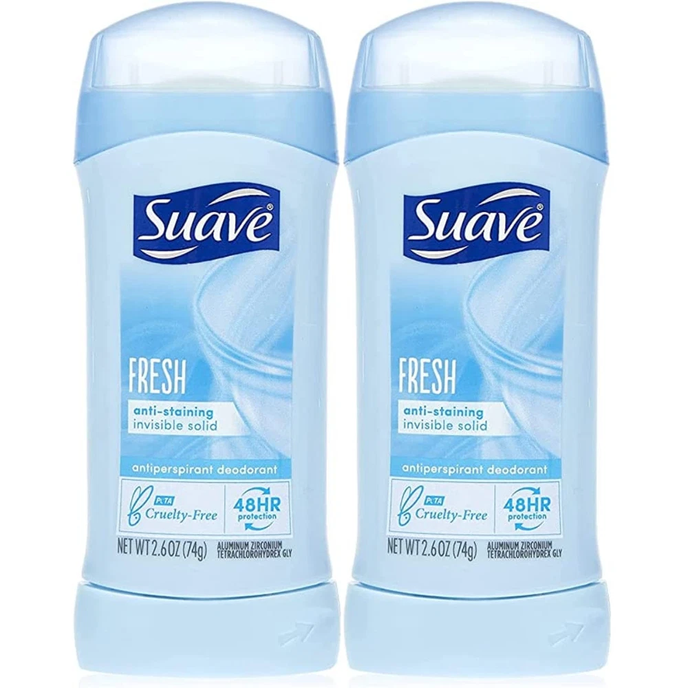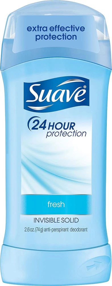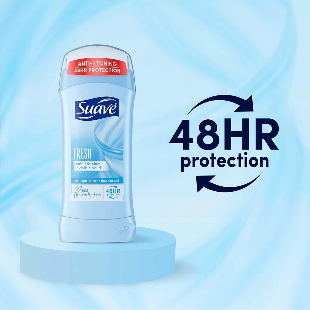 Product Description Suave 48-Hour Anti-Staining Antiperspirant & Deodorant Stick, Invisible Solid, Fresh, 2.6 Ounce (Pack Of 3) Suave's deodorant stick is perfect for active people, and will work to keep you dry and odorless all day. This deodorant for women will fight against sweat to prevent any unsightly sweat patches, and the fresh, pleasant scent in this women's deodorant will keep you smelling good. When you're looking for a strong deodorant, it's best to look for one that will provide a sweat block, at the same time as making you smell good. It's also important to find a product that won't stain your clothes or leave any residue on your skin. You can protect your clothes with this Suave deodorant, which is in a mess-free stick form that glides on and won't leave any residue or telling white marks on your clothes. The Suave Anti-Perspirant Deodorant works best when used with other products in the Suave range. Experiment with different deodorant scents, and try Sweet Pea and Violet or the Coconut Kiss option. SUAVE FRESH VALUE PACK: Stock up with the Suave antiperspirant deodorant, featuring our shower Fresh Anti-Staining Invisible Solid sticks. FRAGRANT DEODORANT: Each Suave Antiperspirant Deodorant stick is infused with a clean, fresh shower scent. 48H OF PROTECTION: When you need extra protection, Suave has you covered with these pleasantly fragrant invisible solid antiperspirant deodorant sticks. ANTI-STAINING FORMULAS: Suave deodorants are designed to stay on your skin and not your clothes. A solid invisible stick makes the perfect travel deodorant. SUAVE IS CRUELTY FREE: Globally, Suave does not test on animals and is Certified Cruelty-Free by PETA. Get long-lasting, 24-hour odor and wetness protection with Suave Invisible Solid Deodorant Suave Invisible Solid Antiperspirant Deodorant stays on skin, not on clothes, so you get effective underarm protection with no messy residue Suave Deodorant for women is recommended for everyday use Enjoy underarm odor protection with the refreshing, clean, shower fresh scent Suave Invisible Solid Antiperspirant Deodorant stick goes on clear so you feel clean and refreshed all day Proven to work as well as specialty brands, Suave Antiperspirant Deodorant is a great value Suave fresh invisible solid deo and antiperspirant stick is anti staining and protects for 48 hours This antiperspirant deodorant provides long lasting odor and wetness protection Suave’s deodorant for women has an anti staining formula stays on skin, not on clothes Suave fresh invisible solid antiperspirant protects with a clean, fresh shower scent This antiperspirant and deodorant stick goes on clear, so you feel clean and refreshed all day Suave deodorant for women is recommended for everyday use Ingredients Active Ingredient: Aluminum Zirconium Tetrachlorohydrex GLY (15.2%).Inactive ingredients: Cyclopentasiloxane, Isopropyl Palmitate, Stearyl Alcohol, Mineral Oil, Talc, Hydrogenated Castor Oil, Fragrance (Parfum), Steareth-100, BHT.