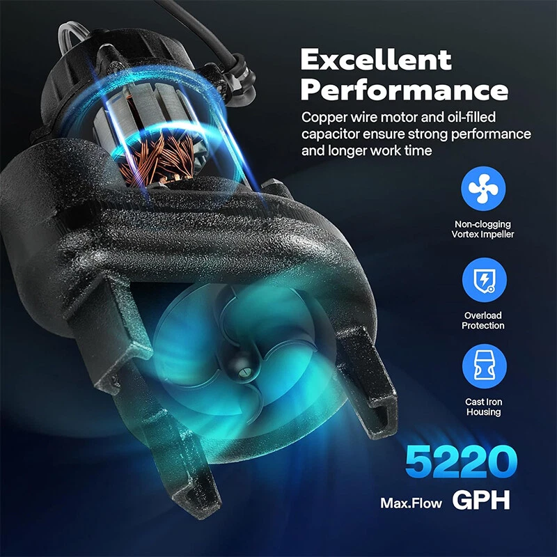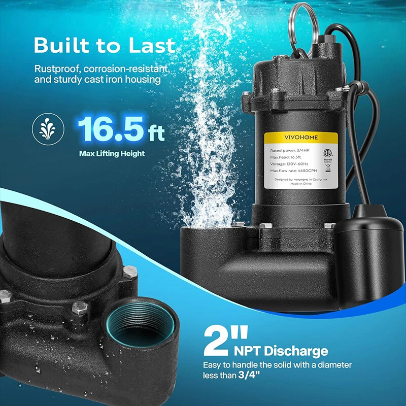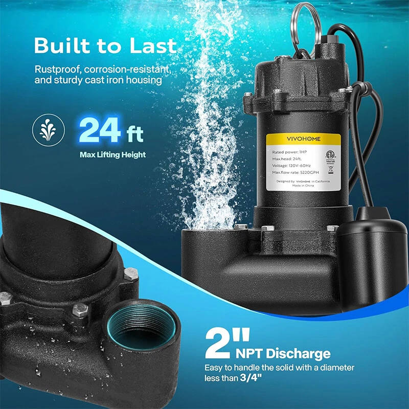 Submersible Cast Iron Sewage Pump, 4680 / 5220 GPH Float Switch Sump Pump with 2'' NPT Discharge for Basement, Septic Tank About the product: SUPERIOR PERFORMANCE - The 3/4 HP / 1HP submersible sewage pump is a powerful and reliable device that can tackle deep draining jobs with ease; It features a high-efficiency oil-filled split capacitor motor that offers superior performance; With a high flow rate of 4680/5220 GPH and maximum head up to 16.5/24 feet, this pump is ideal for ensuring cleanliness and safety in residential areas, commercial establishments, and public facilities AUTOMATIC AND MANUAL OPERATION - The electric sewage pump comes with a 14.4ft long power cord and a piggyback plug which allows for both manual and automatic operations; With its adjustable float switch, the pump can automatically activate when the water level reaches 47CM/18.5’’ and turn it off at 10.5CM/4.1’’, to avoid running dry and prevent damage caused by low water levels SAFE OPERATION - The built-in thermal overload protection system will automatically shut off the pump when it reaches 266℉ to prevent dry-running or any damage to the motor; DO NOT use the pump in water over 40℃/104℉; To prevent freezing in cold weather, ensure that the pump is completely immersed in water before starting; The metal ring on top is used to tie the rope when submerging or lifting the sump pump; NEVER lift it directly by the power cord as this can cause permanent damage DURABLE AND CLOG-FREE - The sewage pump is built to last with its durable cast iron housing that undergoes electrophoresis treatment, which is sturdy and resistant to rust and harsh environmental conditions; It boasts a 2-inch NPT discharge to effortlessly handle the solid with a diameter less than 0.79’’ and a non-clogging vortex impeller, keeping the pump running continuously; It is recommended to keep the pump in a well-ventilated and dry area when not in use for an extended service life WIDE APPLICATIONS - This high-quality submersible sump pump is a reliable solution for a range of residential and commercial drainage needs; It is specifically designed for removing sewage, wastewater, and rainwater in basements, sump pits, bathrooms, yards, or toilets, helping you do the dirty, smelly tasks and keeping your home dry and clean Product and Package Information: Color: Black Power Cord: 14.4FT Horse Power: 3/4HP / 1HP Discharge: 2'' NPT Max. Head: 16.5FT / 24FT Water Temperature: 0-40℃/32-104℉ Voltage/Frequency: 120V/60HZ Waterproof: IPX8 Current Rating: 7A / 8A Max. Flow Rate: 4680GPH / 5220GPH Payment Delivery details Feedback & Seller Rating Returns About us Payment We accept PayPal payment,PayPal Credit,Credit card or debit card and so on. We will leave a positive feedback immediately after payment is received. We appreciate a positive feedback as much as you do. If for some reason there is any issue with the purchase, please contact us prior to leaving feedback, we will be glad to work together and provide a satisfying solution. Delivery details DELIVERY DAYS: 3-7 BUSINESS DAYS 3 BUSINESS DAYS SHIPPING OUT SHIP FROM CA or KS or NJ, United States (whichever near ur location) Feedback & Seller Rating We strive for 5 star positive feedback and will try our best to offer the best service. Please contact us before leaving feedback or open any dispute and please give us 2 business days to resolve the complaint to your satisfaction. Returns All of our items are backed with a 30-day return policy. We ensure all our items are new and in excellent condition prior to shipping. In case you receive the item that is not to the standards above, please contact us via e-Bay messages. All returns must be in new original condition as received and should be shipped with delivery confirmation Please note that all returns must be pre-approved by us. Unauthorized returns will not be accepted. If you need to return, please check twice to confirm the item not work and contact our customer service representative, let us know the detailed problem and send us some pictures for confirmation. We ONLY accept returns with original package. Please make sure that item has NO man-made sabotage. Used items will not be accepted for return. About us Welcome to our ebay store. As a company based in California, We devote ourselves to offering top notch products at the most reasonable prices. From 2015, we have grown into a global enteprise that severs customers from all over the world. And we are glad to have you joining this big family. All we want for you is a easier and merrier life. If you have any questions, freel free to contact us. Infinite Blessings and Love to YOU!