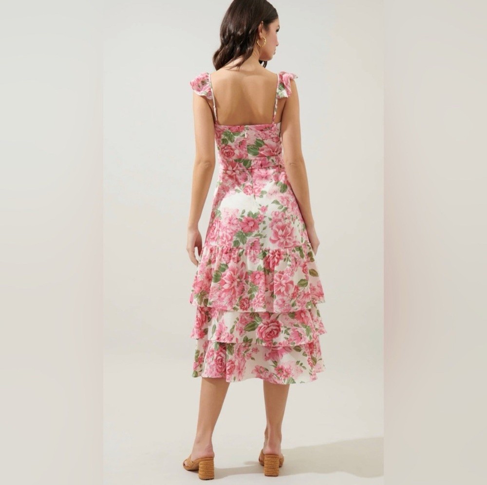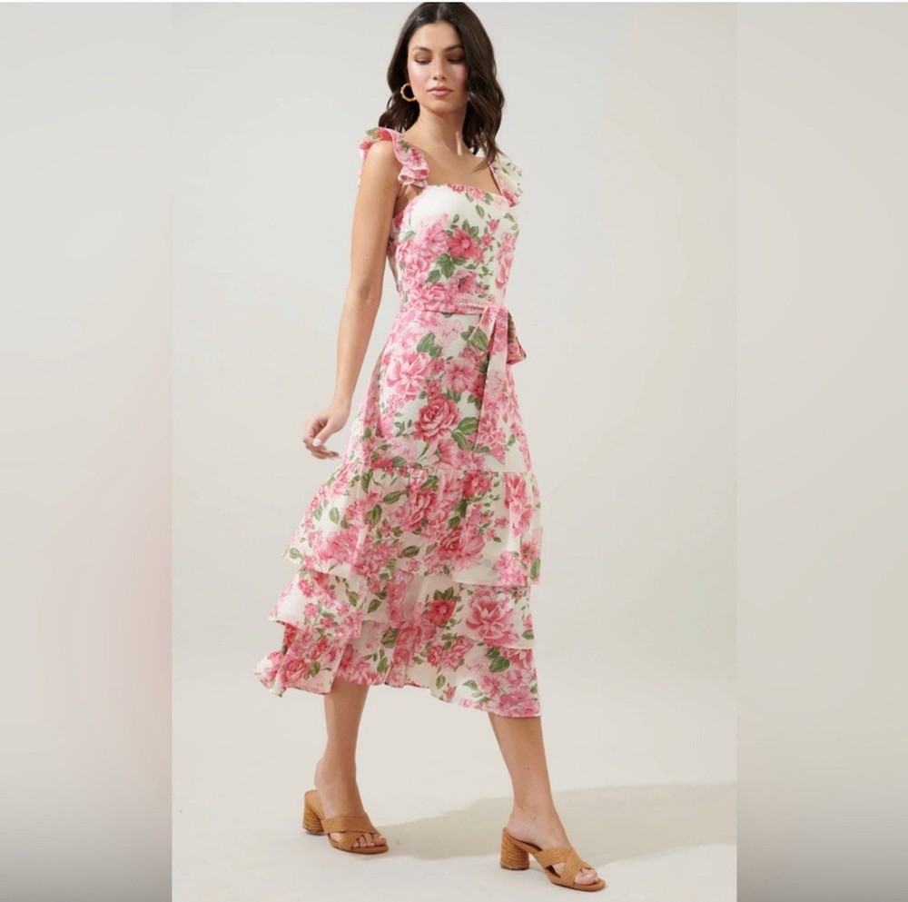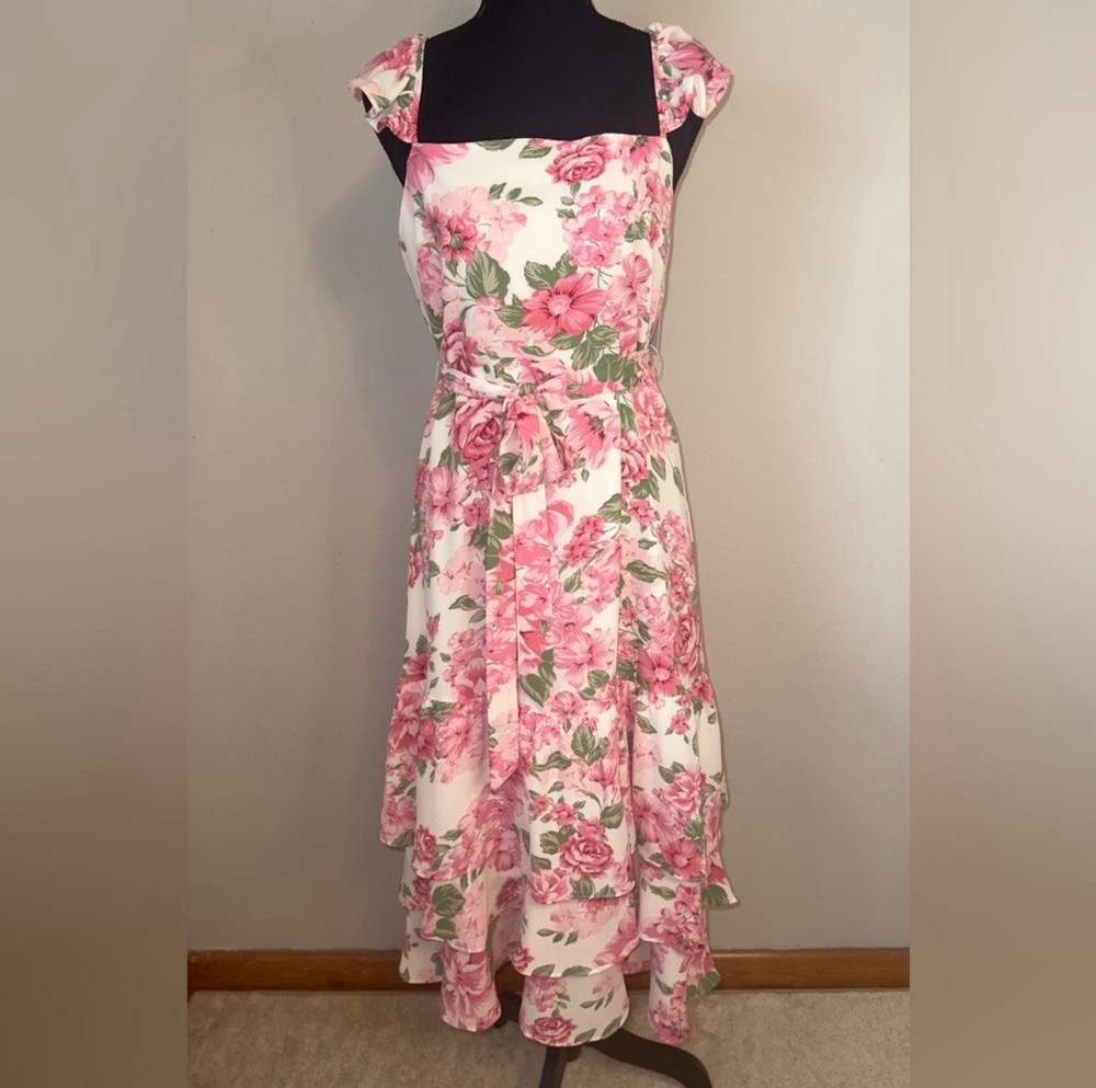 The Sugar Lips Women's Dress in size L is a vibrant multicolor floral patterned A-Line dress perfect for casual occasions. It features ruffle accents and a zip closure, making it easy to wear. Made from polyester with a lined interior, this short dress is ideal for the summer and spring seasons. Hand wash only to maintain its quality, this dress from Sugarlips is a stylish choice for women looking for a cute and comfortable outfit.