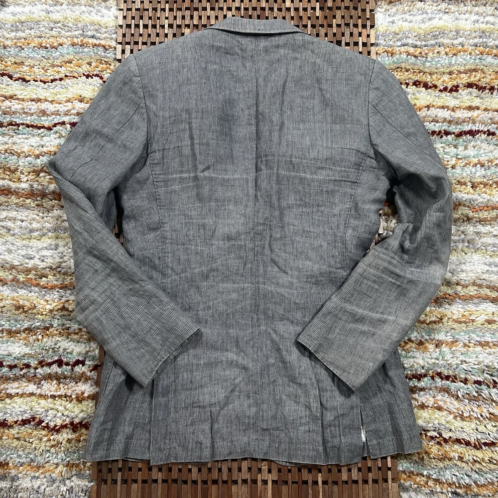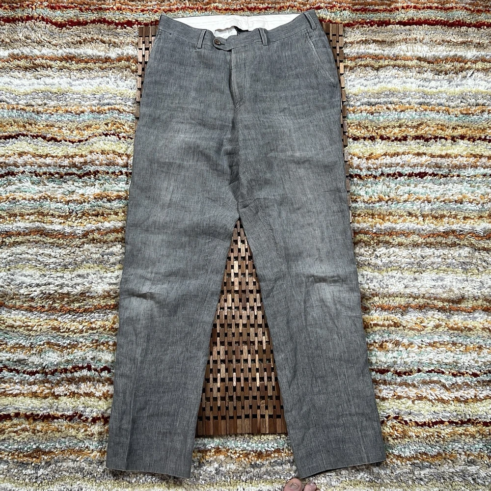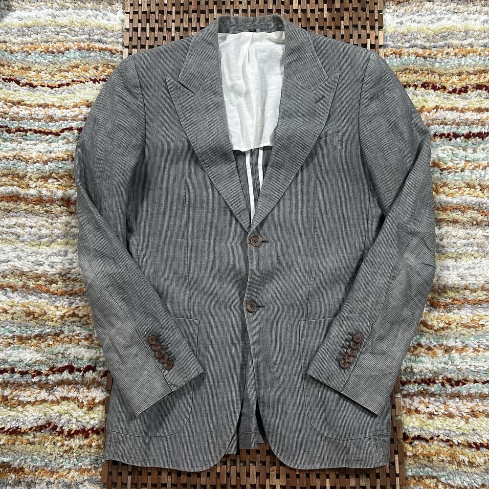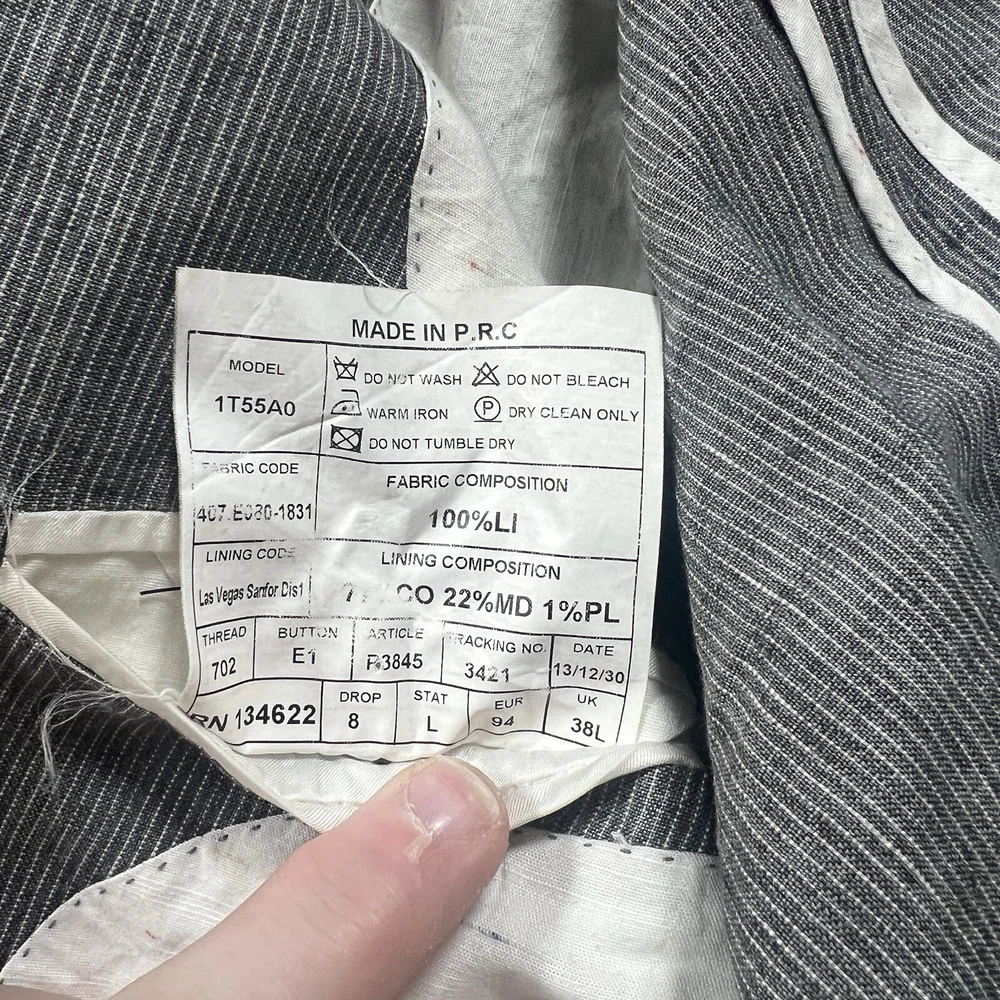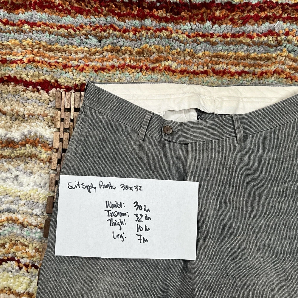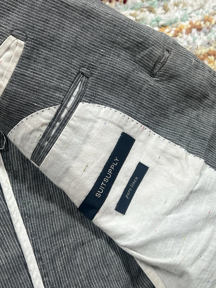 A men's two-piece suit by Suitsupply in size 38L. The suit features a collared neckline, a slim fit, a grey pure linen fabric, and a lined, pleated jacket with a notch lapel style and double-vented design. It has long sleeves, a 2-button front closure, and regular-length jacket and pants with a chest size of 40. The suit is suitable for all seasons and should be dry cleaned only. Top button is loose. Priced accordingly.