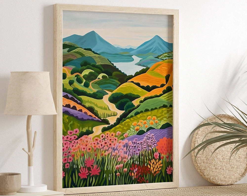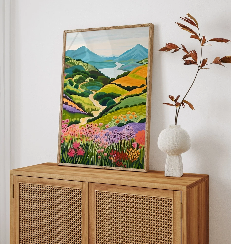 Sumba Mountain Park Illustration Sumba Island Indonesia Travel Landscape Painting Colorful Wall Art Summer Bright Vibrant Print Material: Premium luster photo paper Print type: Inkjet printing One side printed + The finish provides the highest possible resolution and color saturation + Lasts up to 200 years in color and 400 years in black-and-white + Printed on high-quality resin-coated photo base paper medium + Posters can be hung with double-sided tape, tacks, or framed + Hand washing with a gentle cry cloth is recommended for extended durability I will hand select the best choice of paper for your chosen design to ensure top quality results for a beautiful, bright and luxurious print. All prints are sealed in cellophane slips for protection during transportation, and are shipped in a protective cardboard envelope.
