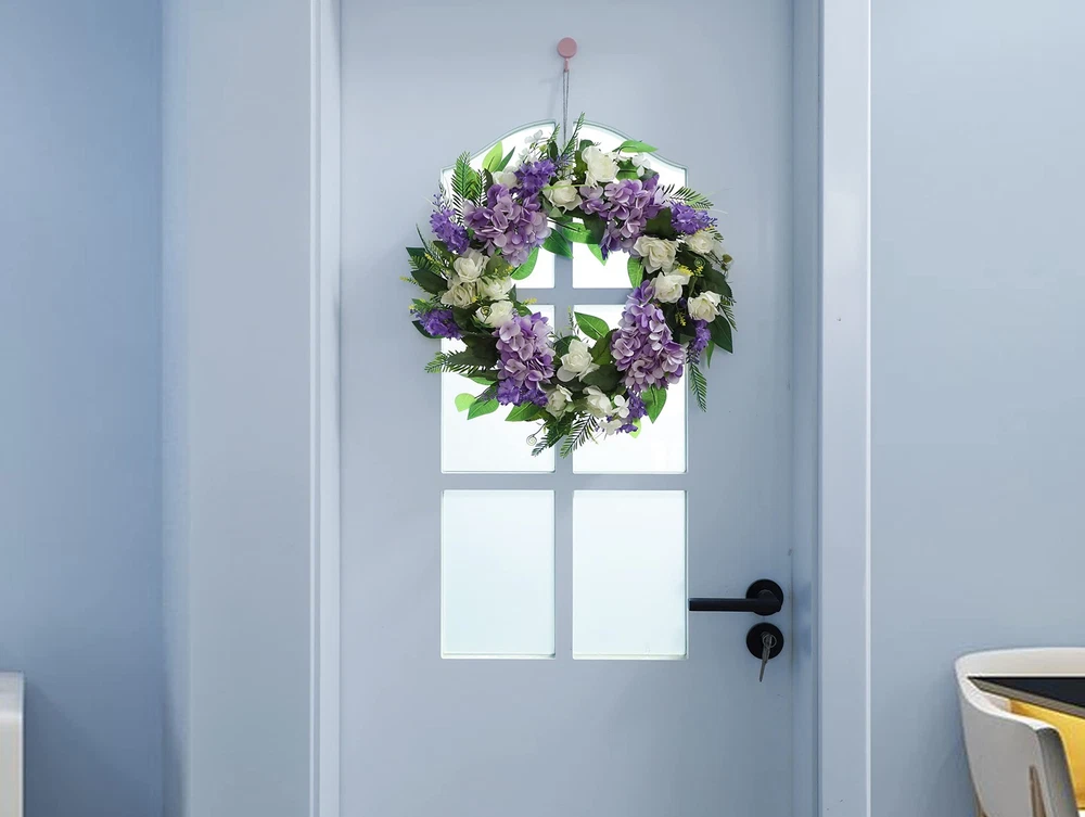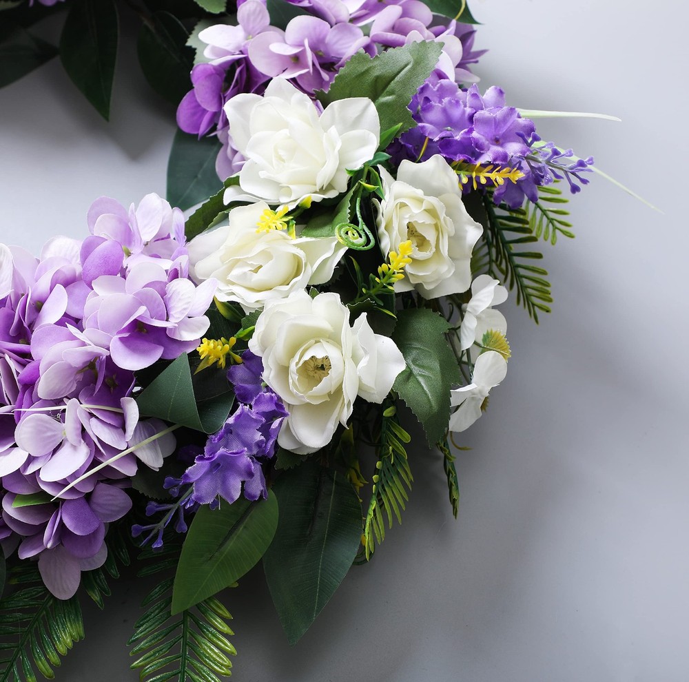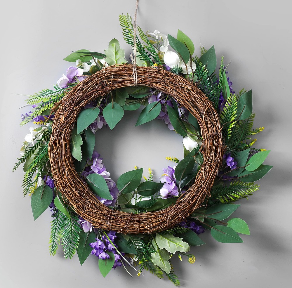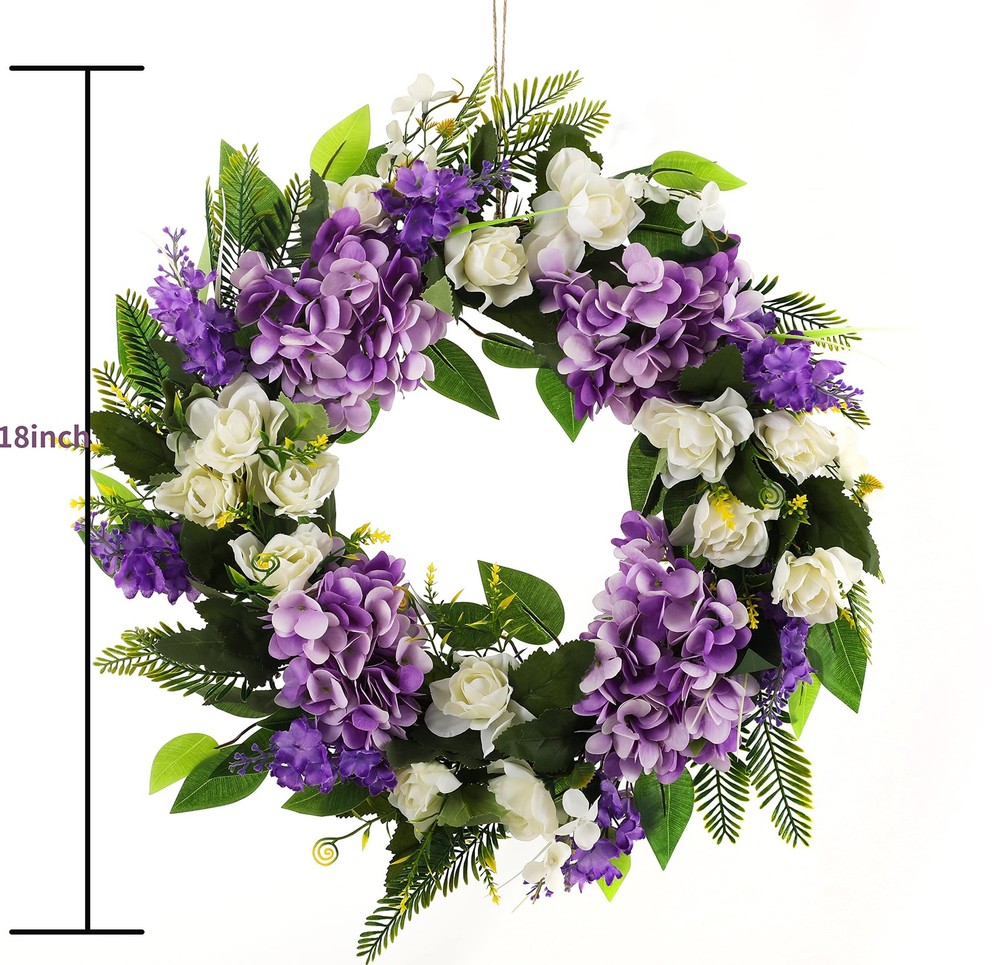 This wreath is absolutely stunning! The mix of silk hydrangeas and rattan looks so lifelike and elegant. At 18 inches, it's the perfect size to make a statement without being overwhelming. The purple flowers pop against the greenery, giving my front door a fresh, vibrant look all year round. It arrived carefully packed and fluffed up beautifully—just needed a little shaping. The craftsmanship is impressive for the price, with dense, high-quality materials that feel sturdy. It’s held up perfectly through wind and rain, still looking brand new. Gets compliments from neighbors every time!